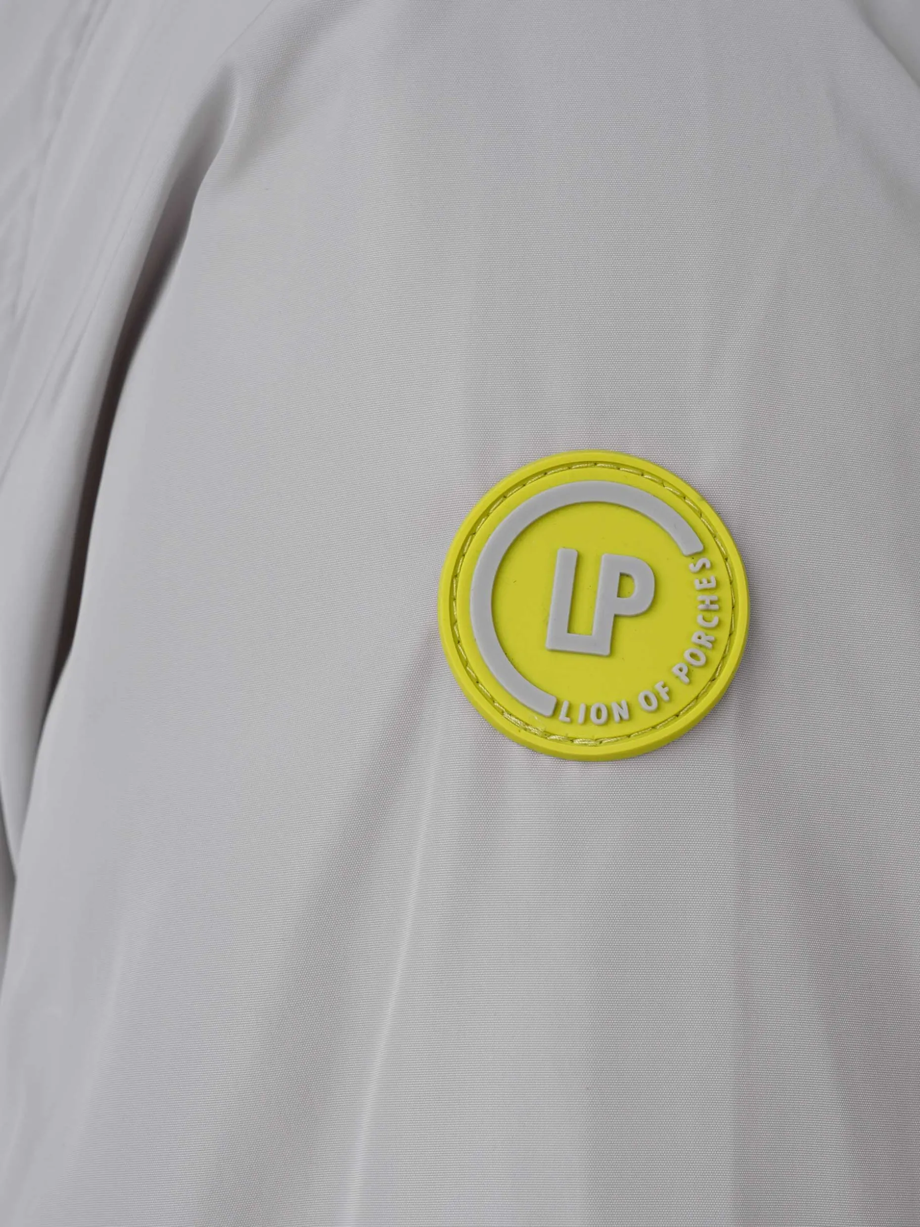 Parka com capuz ajustável de cordão. Em tecido técnico. Aperta com fecho central e molas invisíveis. Personalizado com emblema de borracha “LP” na manga esquerda. Bolsos inclinados de chapa. Punhos com ajustáveis com molas personalizadas. Sem forro. Estampado no interior personalizado “Lion Of Porches”.