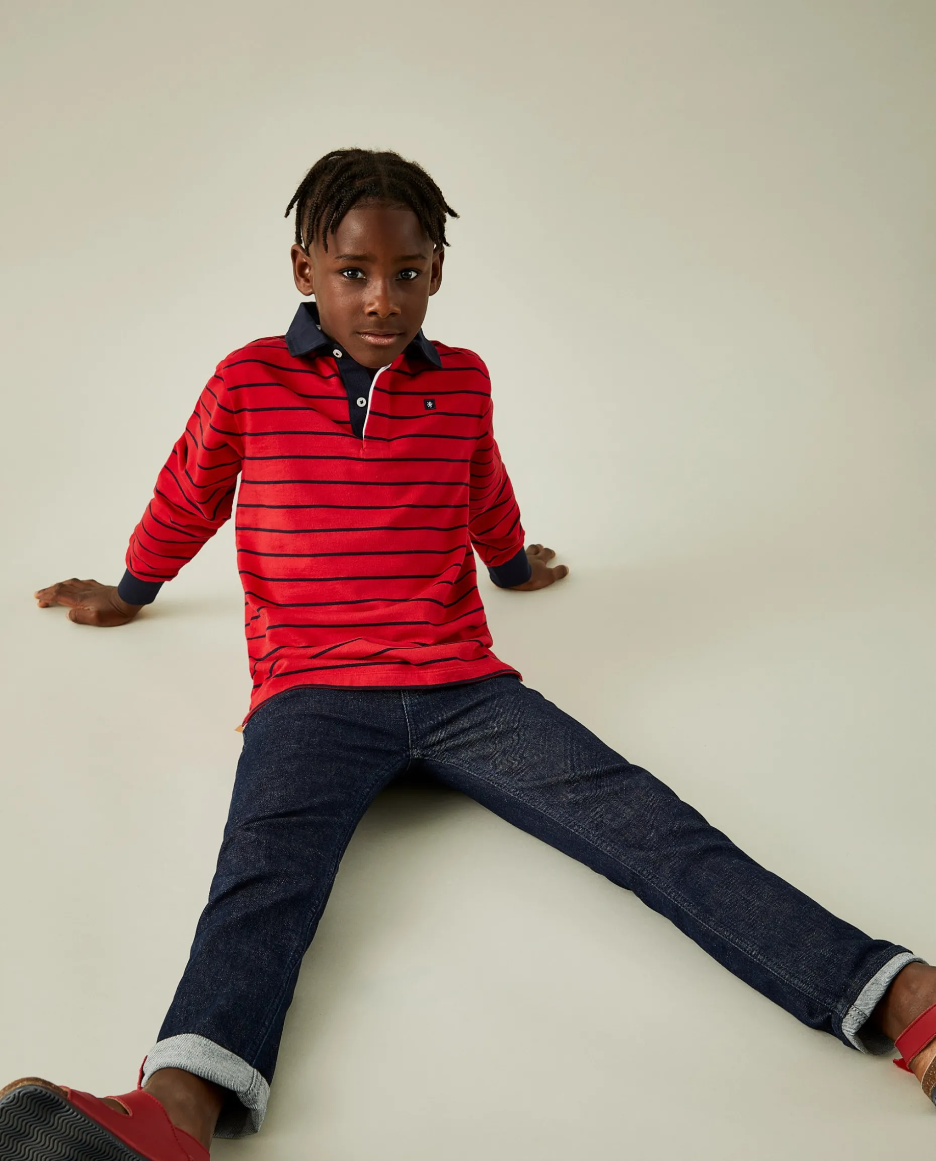Polo de manga comprida com padrão de riscas. Pormenor diferenciador de gola e punhos em contraste de cor e leão da marca no peito. Confecionado em algodão para maior conforto.