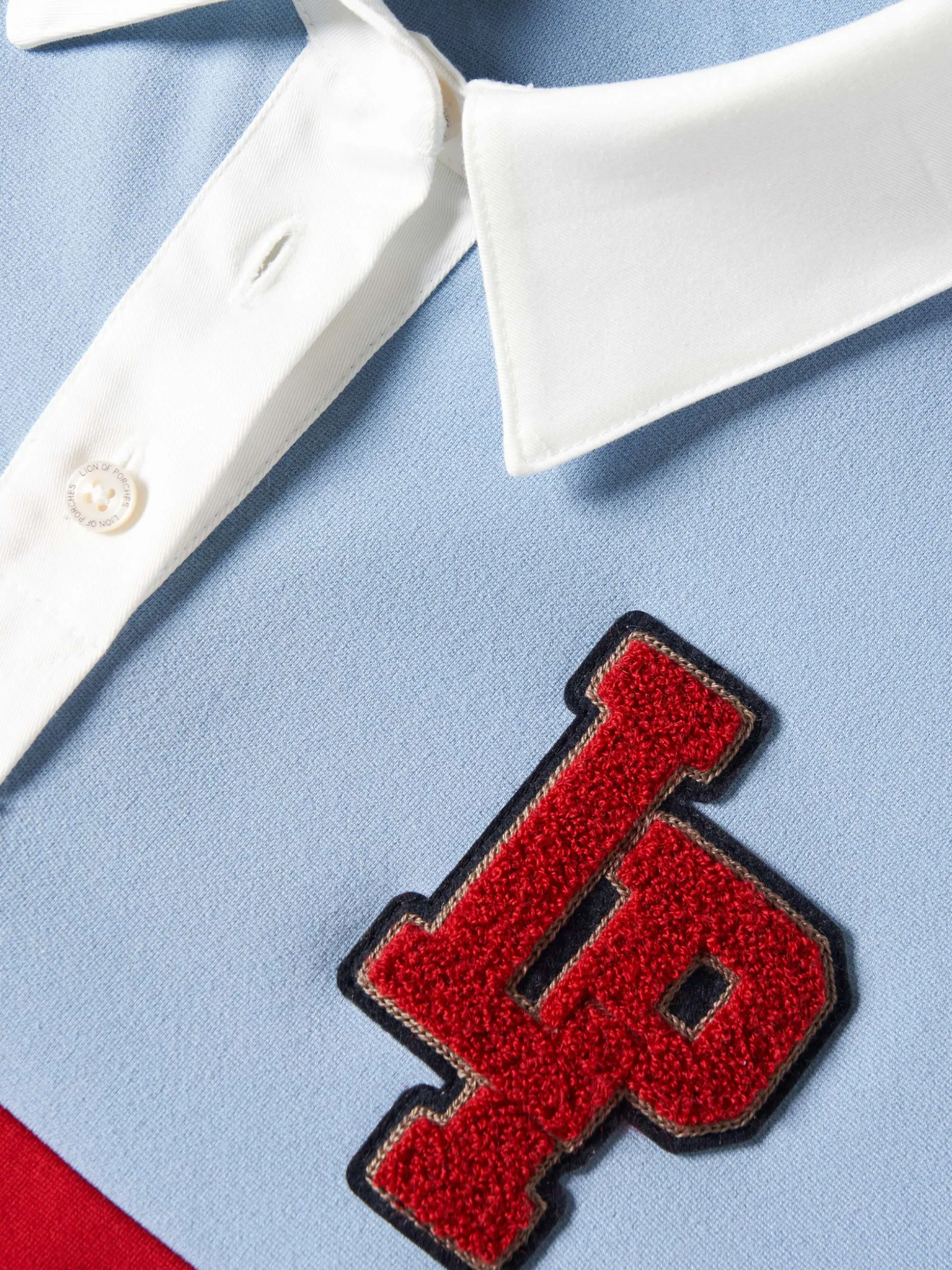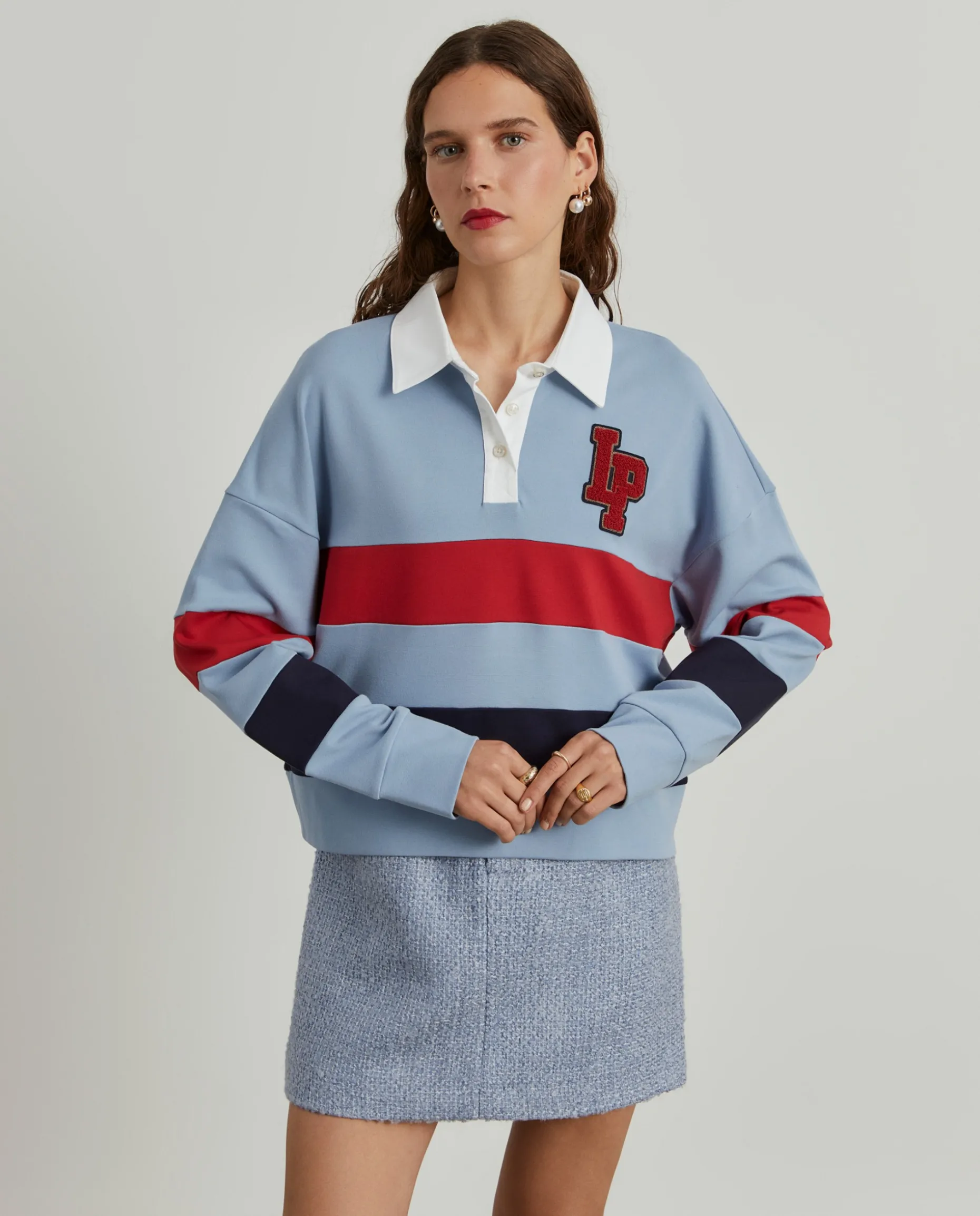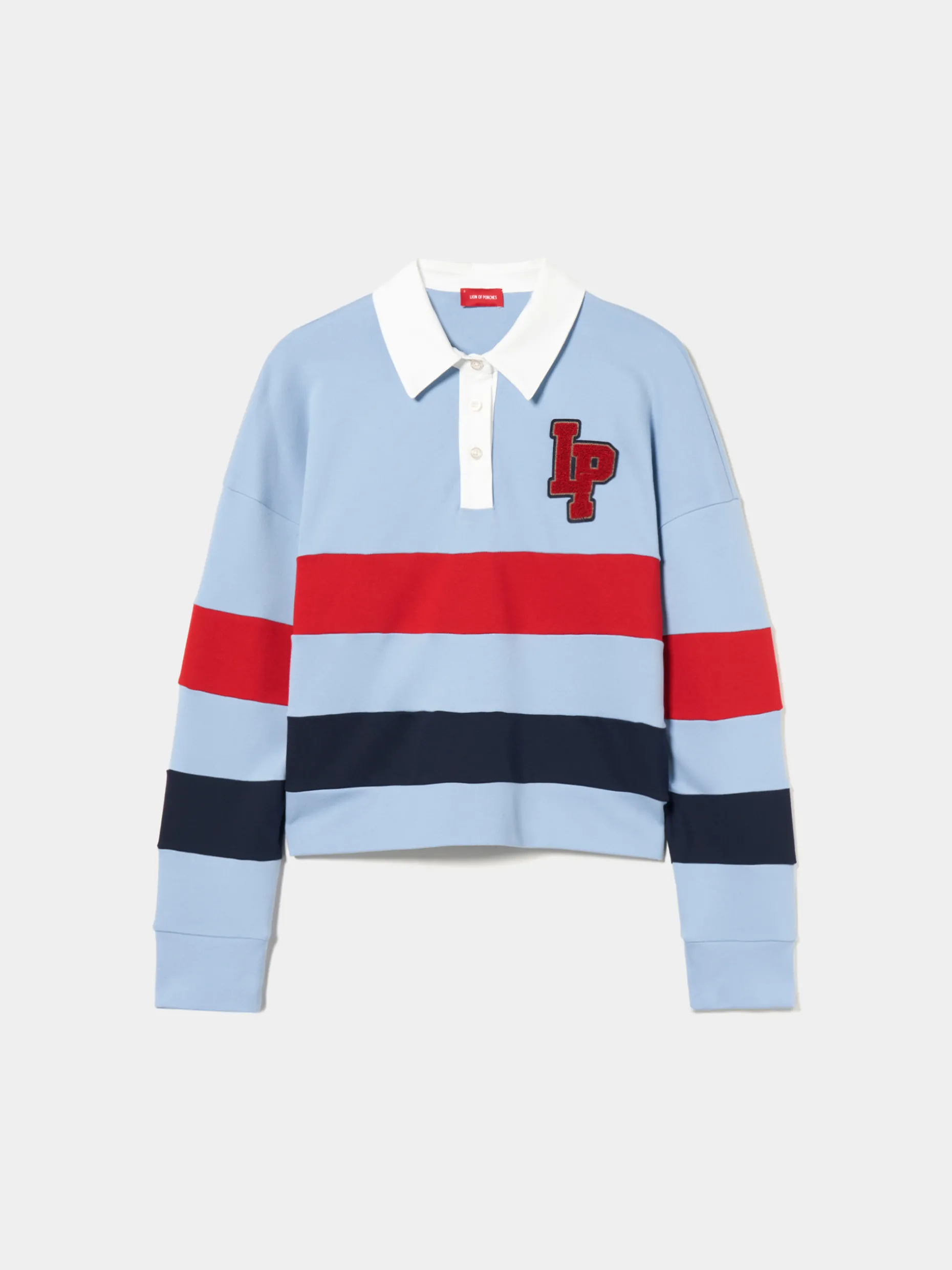 Camisola de malha, estilo polo, com manga comprida e padrão de riscas horizontais coloridas. De estilo clássico, com um toque contemporâneo, tem colarinho e carcela em tecido e patch LP no peito em contraste de cor.