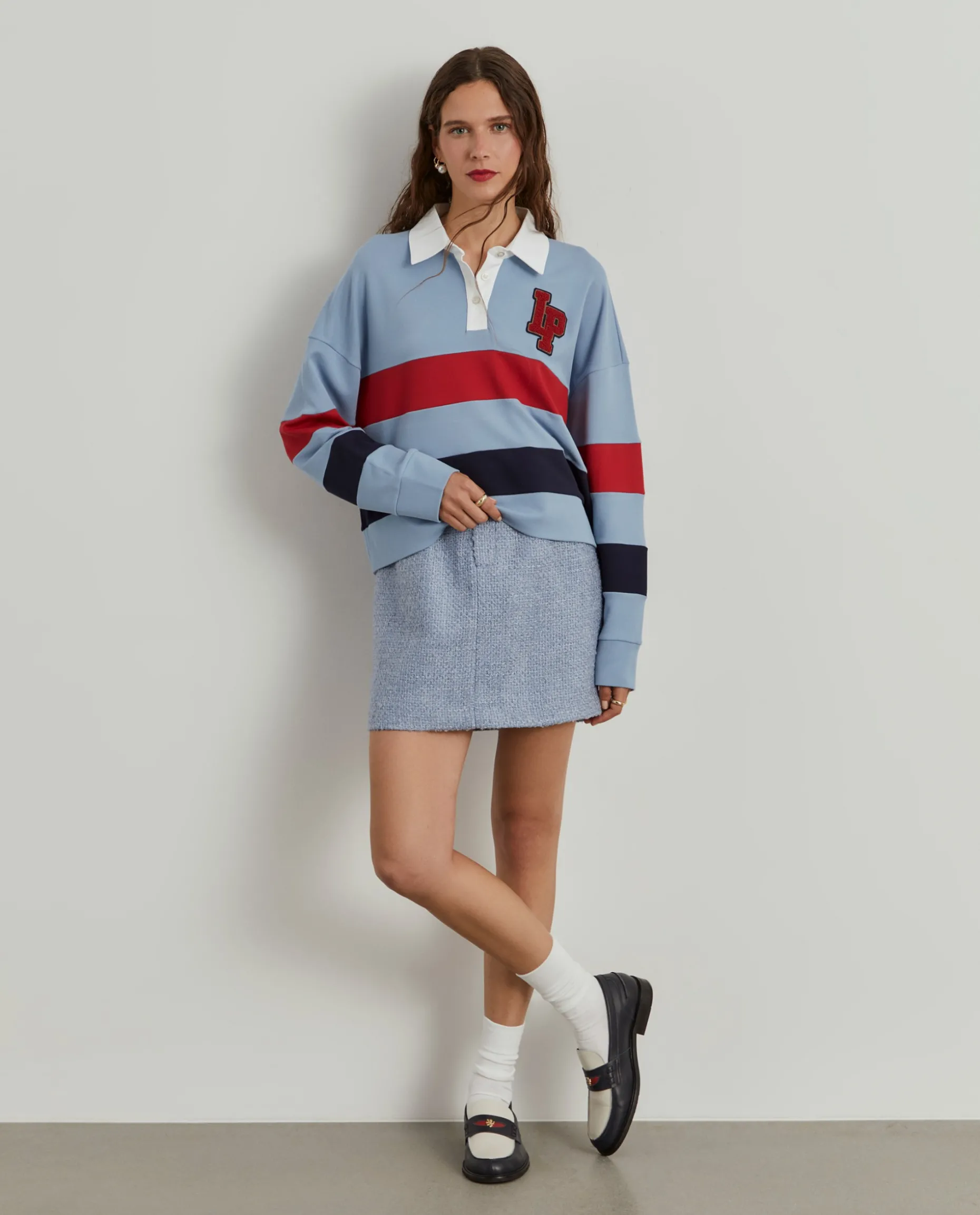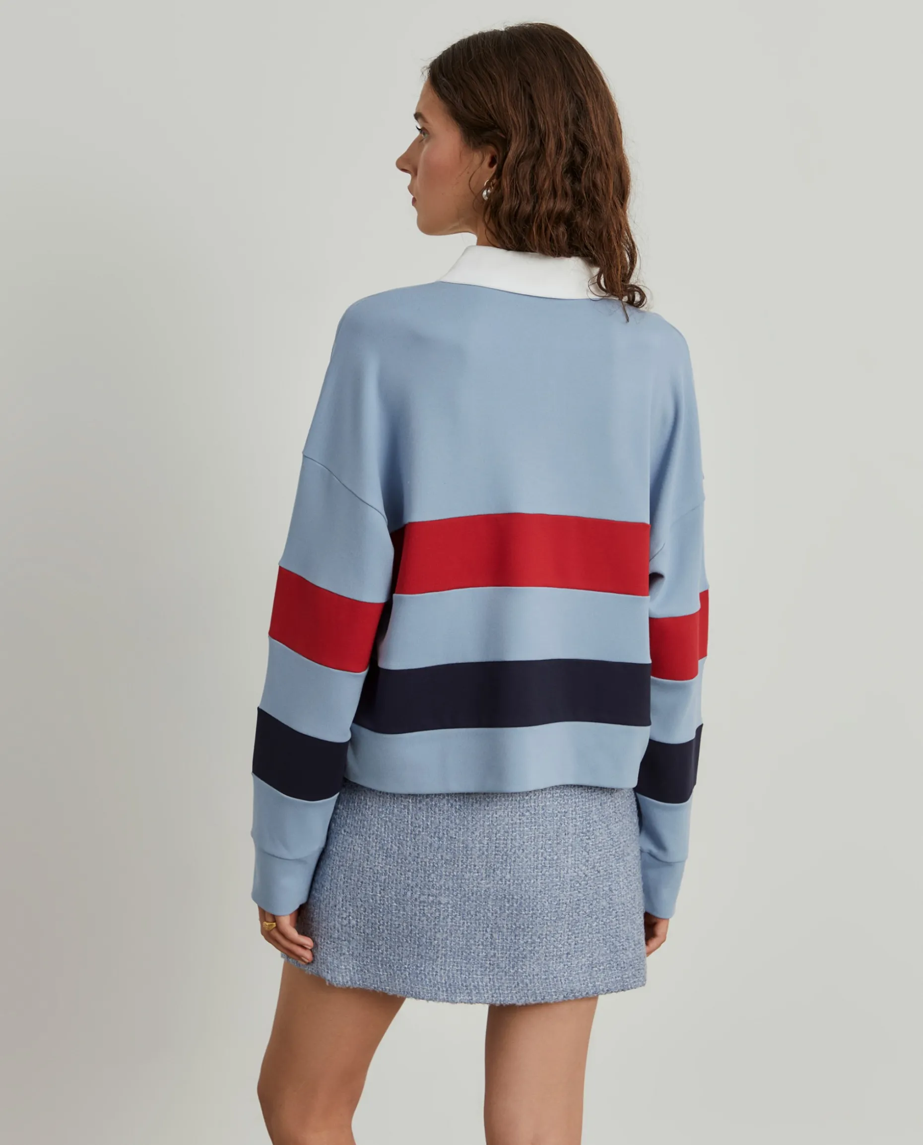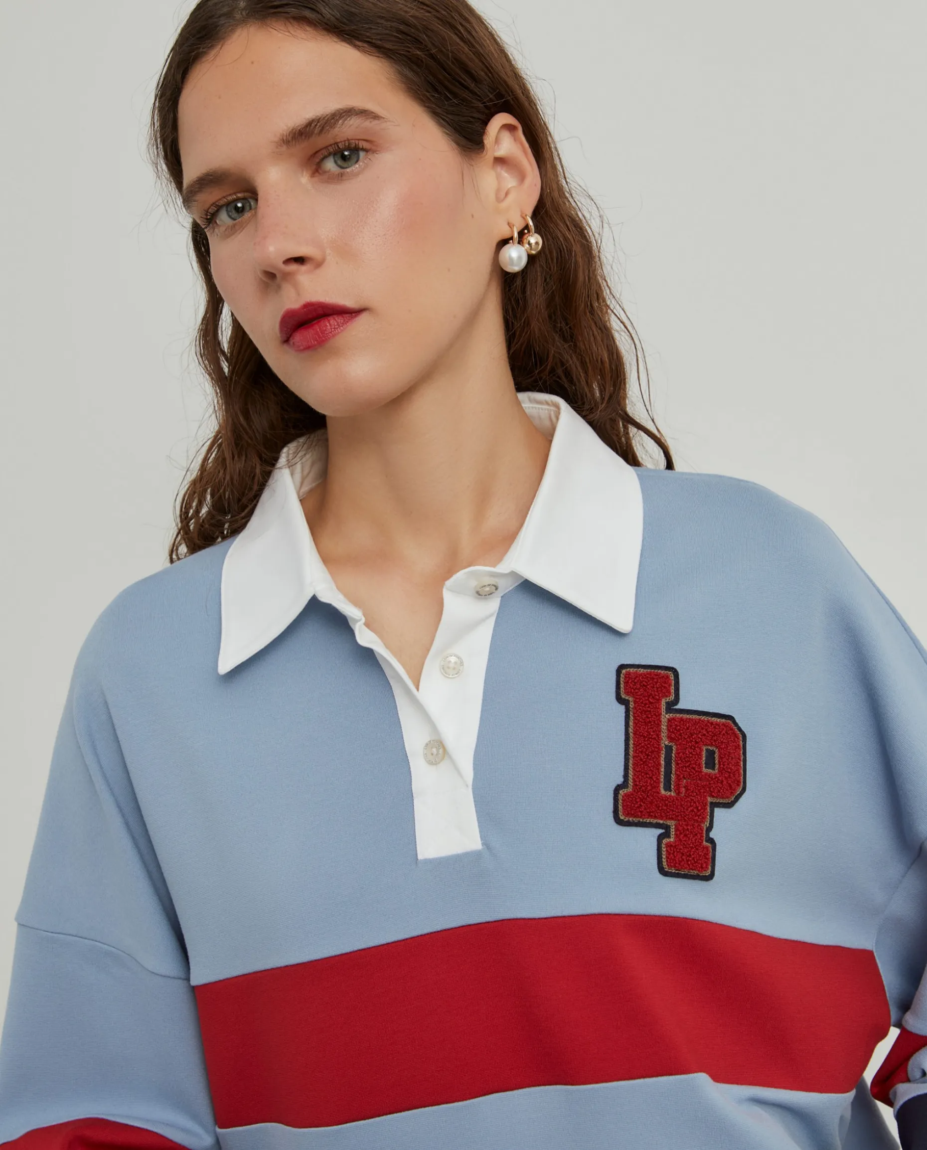 Camisola de malha, estilo polo, com manga comprida e padrão de riscas horizontais coloridas. De estilo clássico, com um toque contemporâneo, tem colarinho e carcela em tecido e patch LP no peito em contraste de cor.