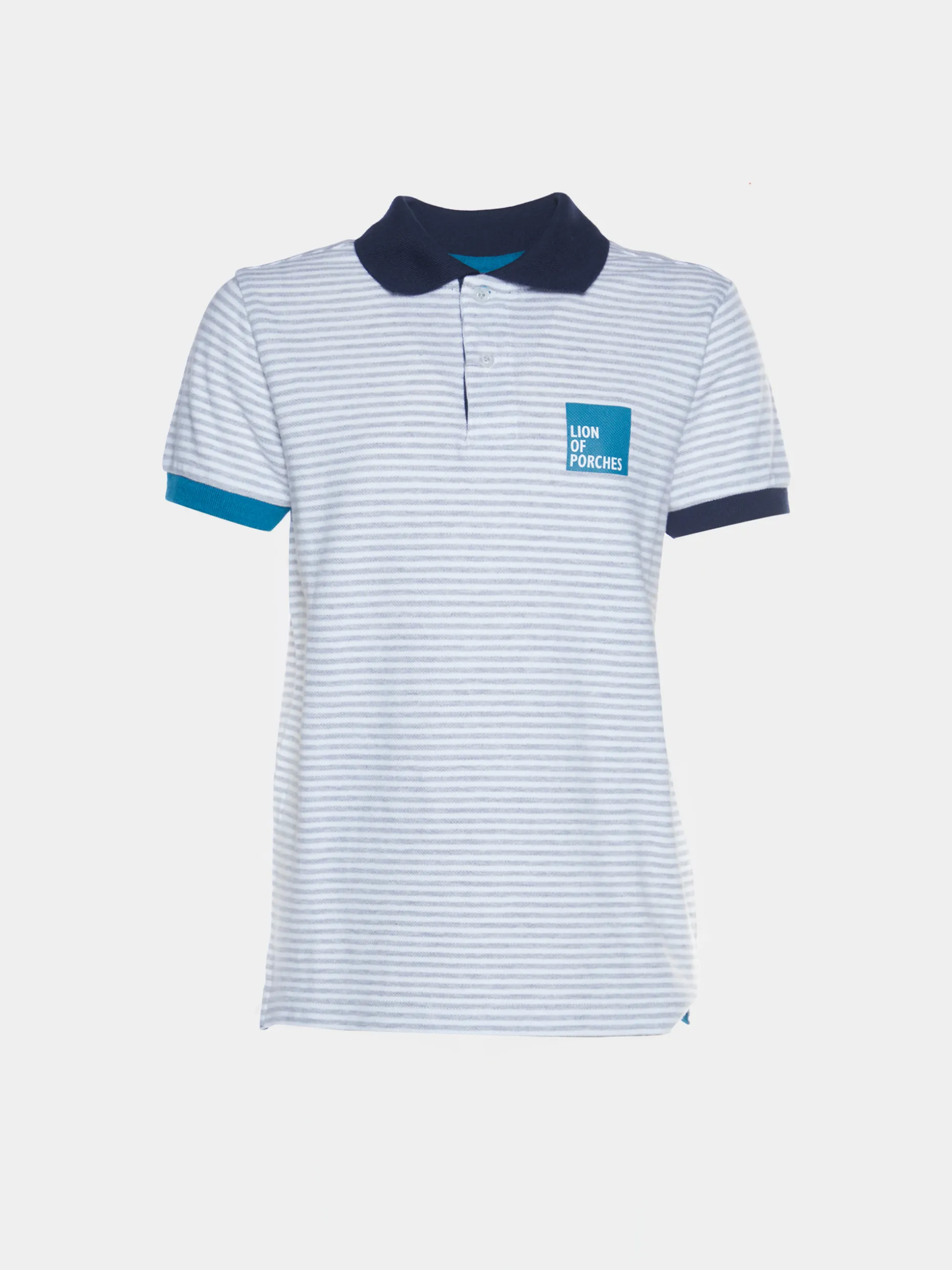 Polo regular fit de manga curta às riscas. Estampado Lion of Porches no peito em contraste. Gola, mangas, rachas e interior da carcela em contraste.