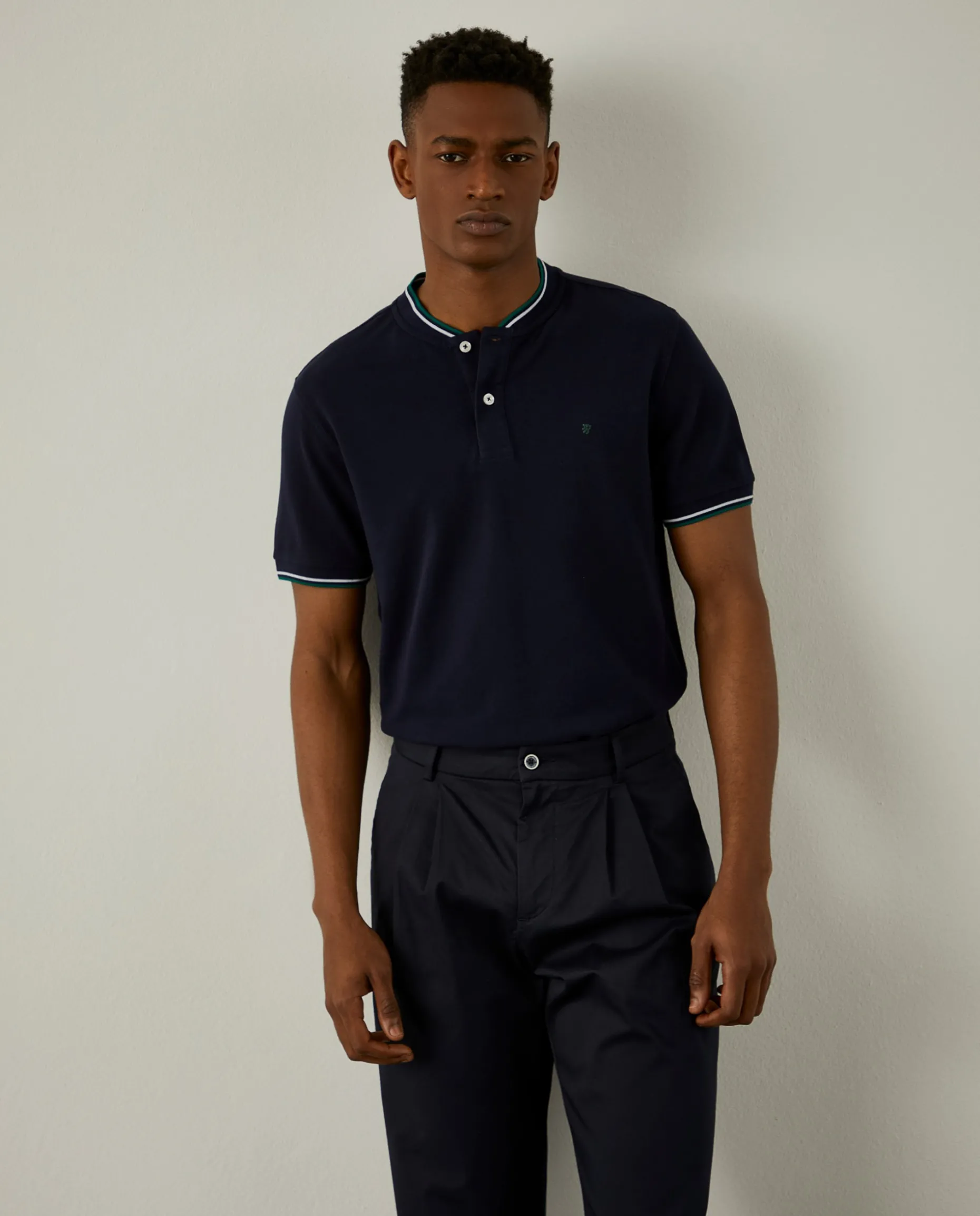 Uma versão original do polo piqué é este modelo com detalhe diferenciador de tiras em contraste. De manga curta e corte slim fit, finaliza com pequeno leão em contraste no peito. É confecionado em algodão para maior conforto e durabilidade.