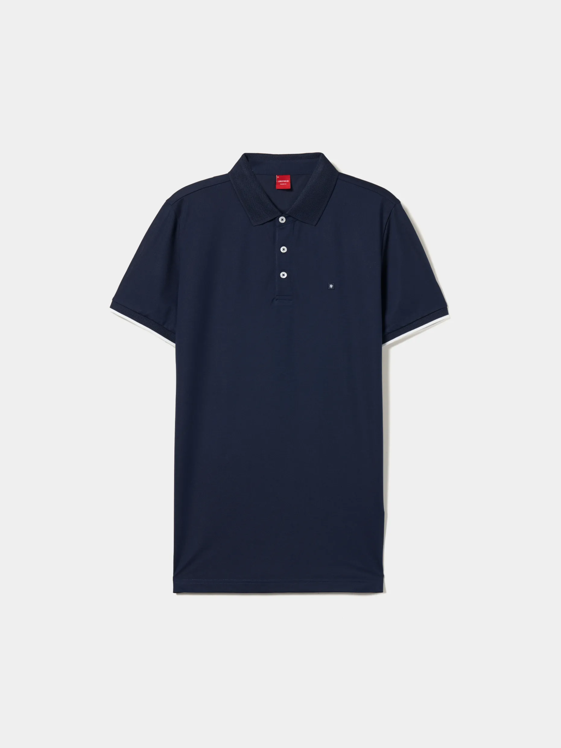 Polo slim fit, de manga curta, com pormenor diferenciador de risca em contraste de cor nas mangas. Aperta com três botões e finaliza com pequeno leão da marca no peito.