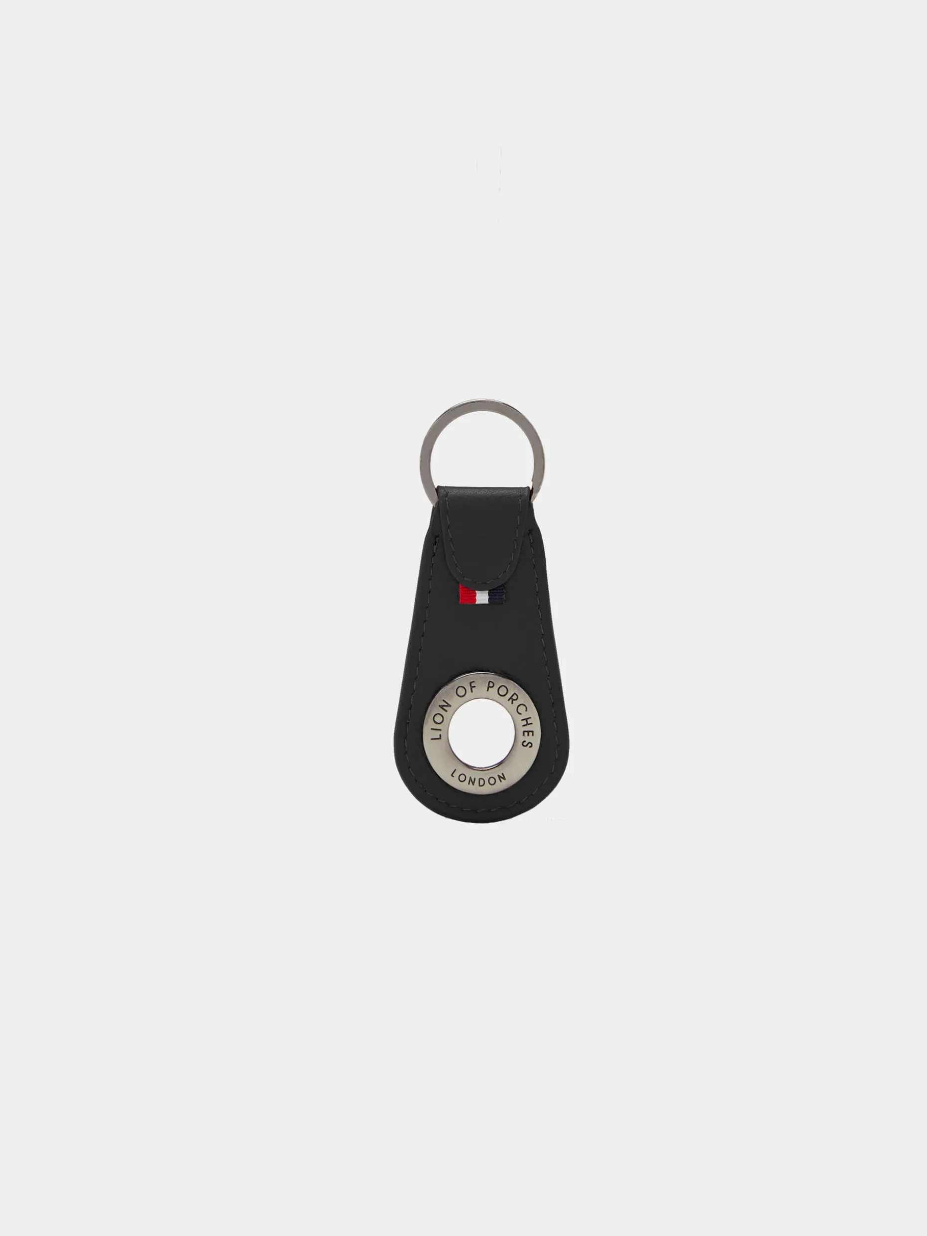 Porta chaves 100% pele de formato redondo com pormenor interior de argola com branding Lion of Porches. Finaliza com fita tricolor, característica da marca. Argola na ponta para colocar as chaves.
