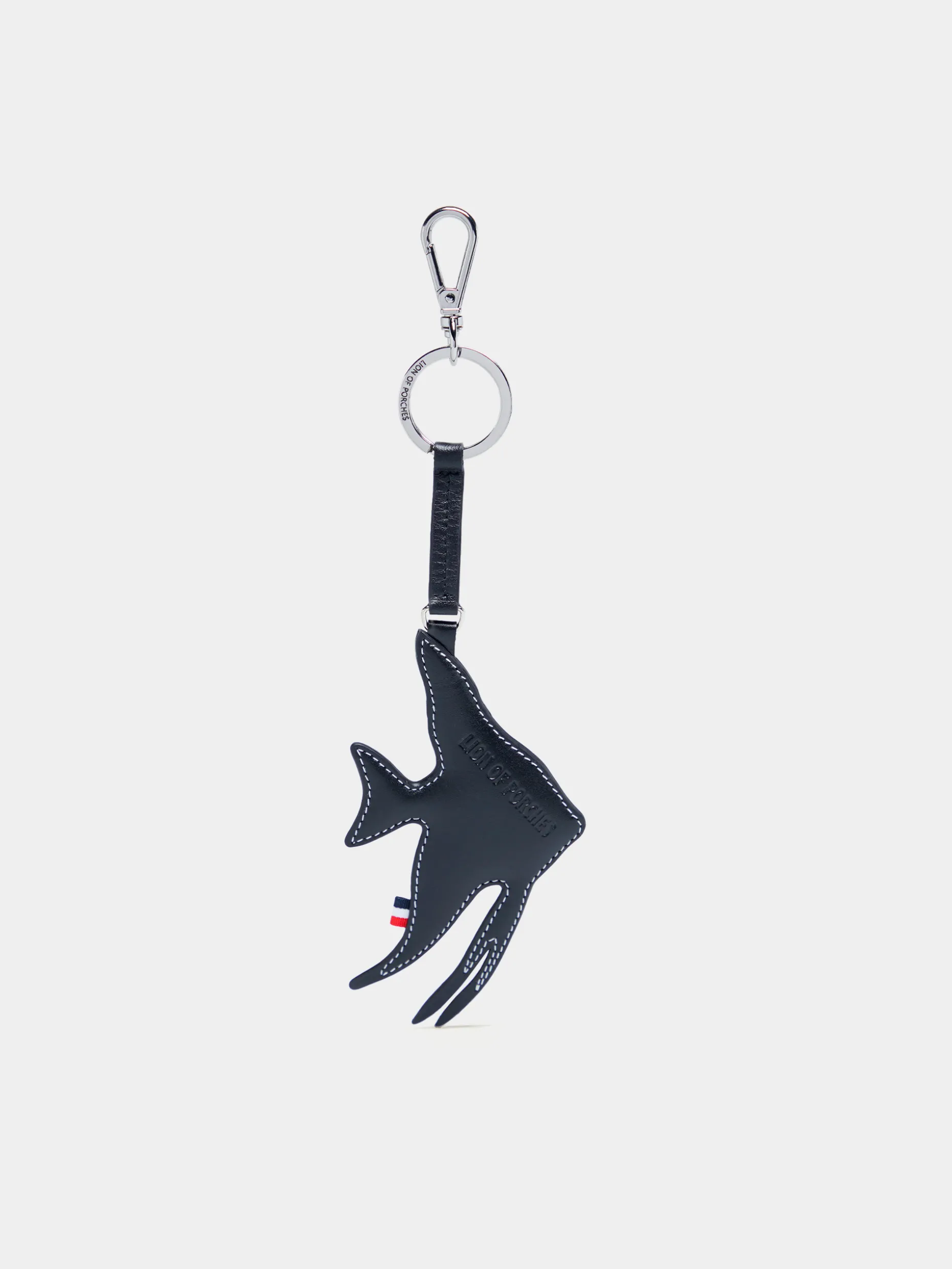 Porta-chaves 100% pele preta com forma de peixe e pespontos em contraste. Anilha personalizada e logotipo gravado a cunho na frente.