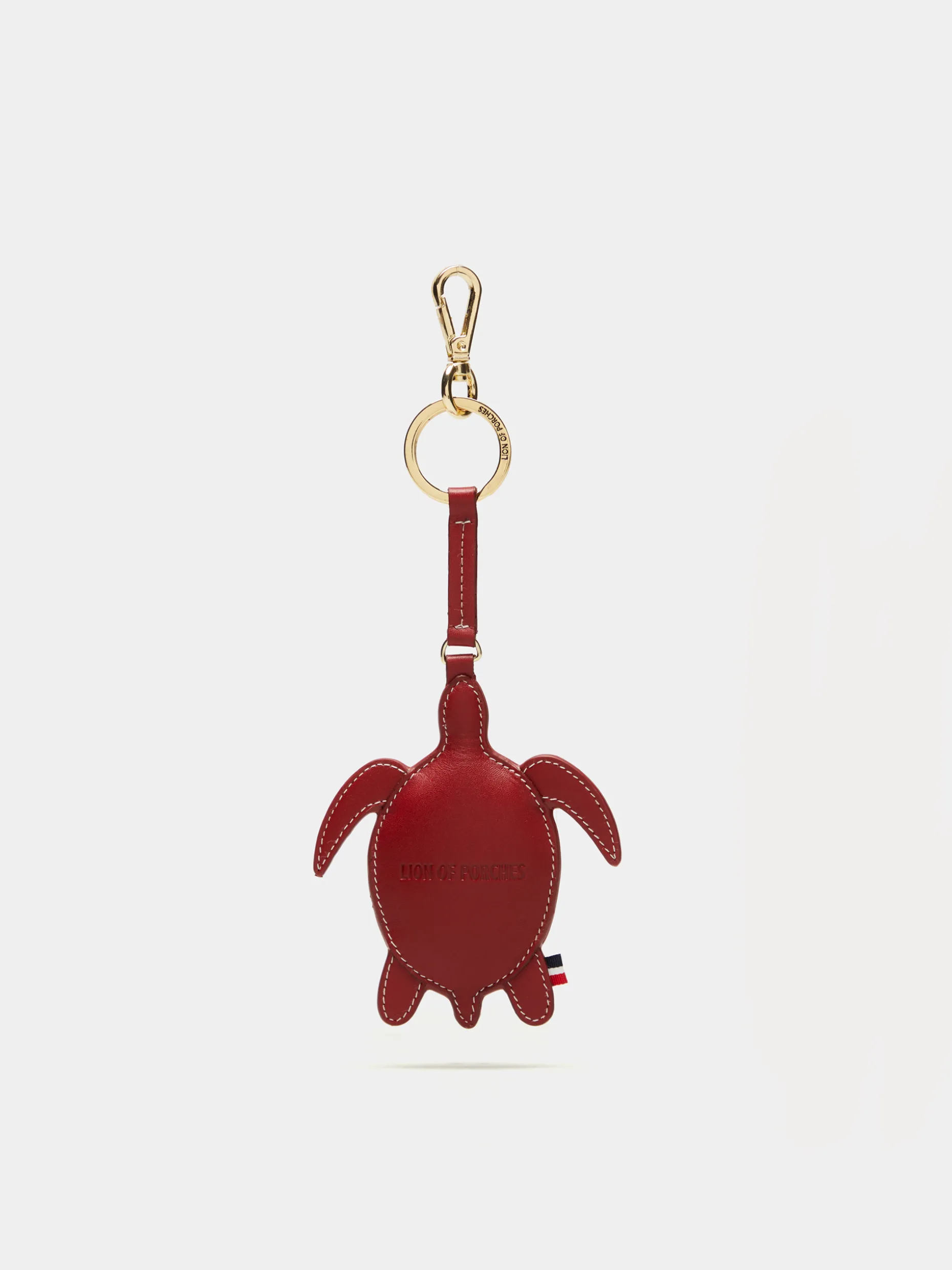 Porta-chaves 100% pele com forma de tartaruga e pespontos em contraste. Anilha personalizada e logotipo gravado a cunho na frente. Pormenor de fita tricolor corporativa.