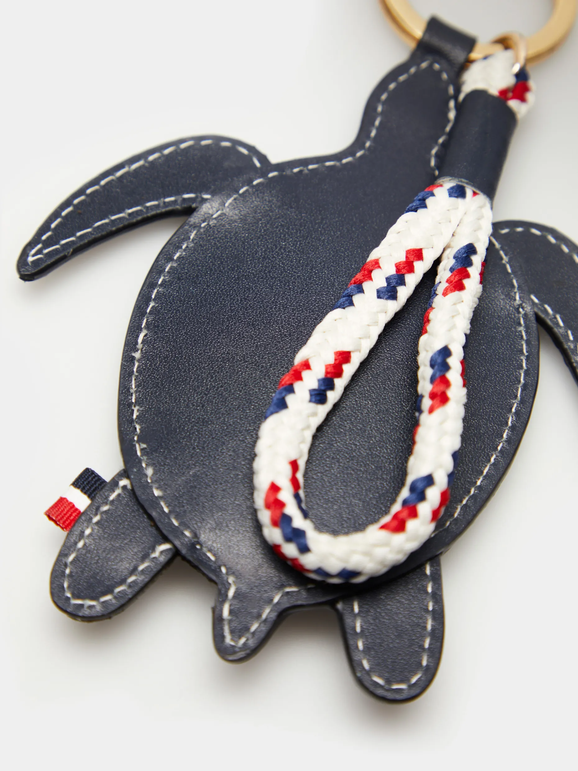 Porta-chaves 100% pele com forma de tartaruga e pespontos em contraste. Anilha personalizada e logotipo gravado a cunho na frente. Pormenor de cordão tricolor pendurado na anilha.