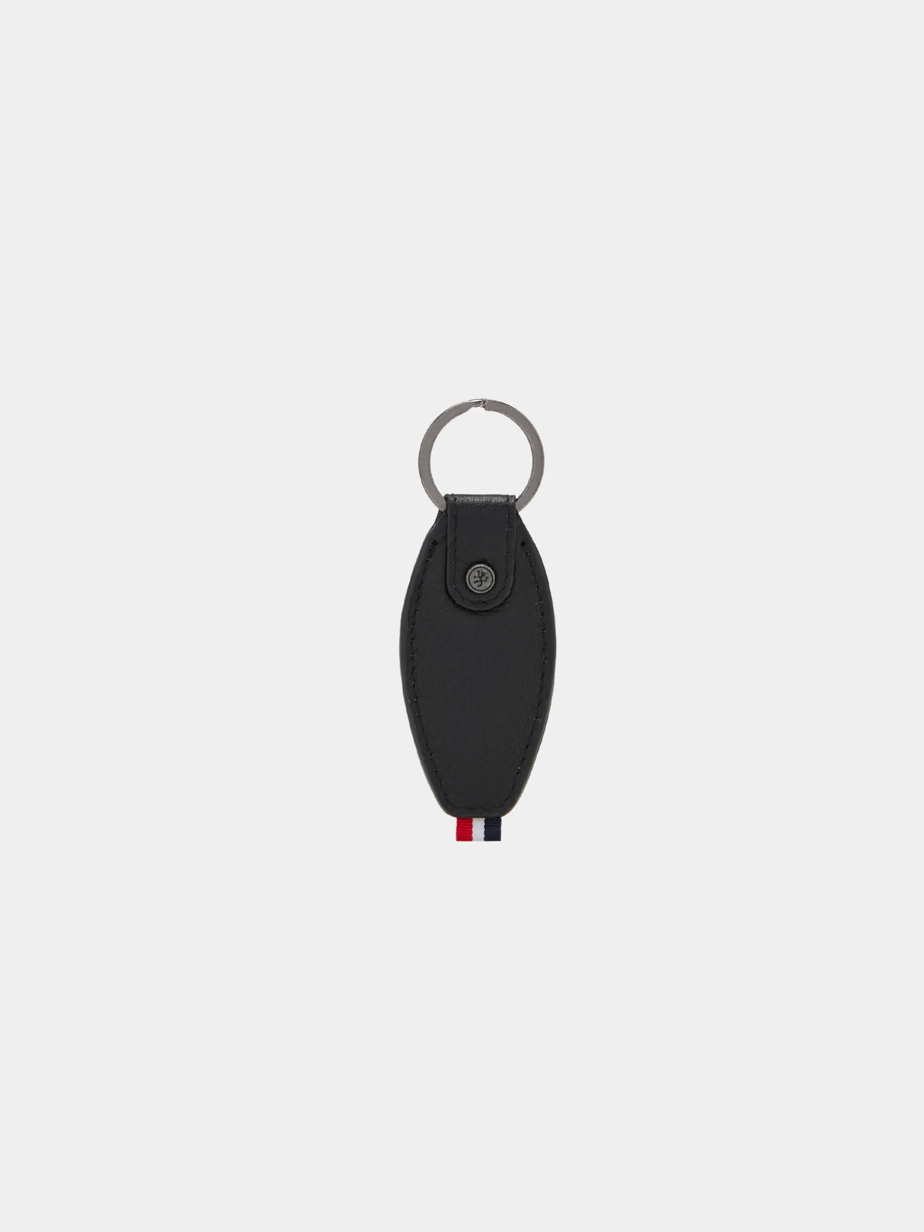 Porta-chaves 100% pele de formato oval. Etiqueta corporativa tricolor na ponta. Branding Lion of Porches no centro.