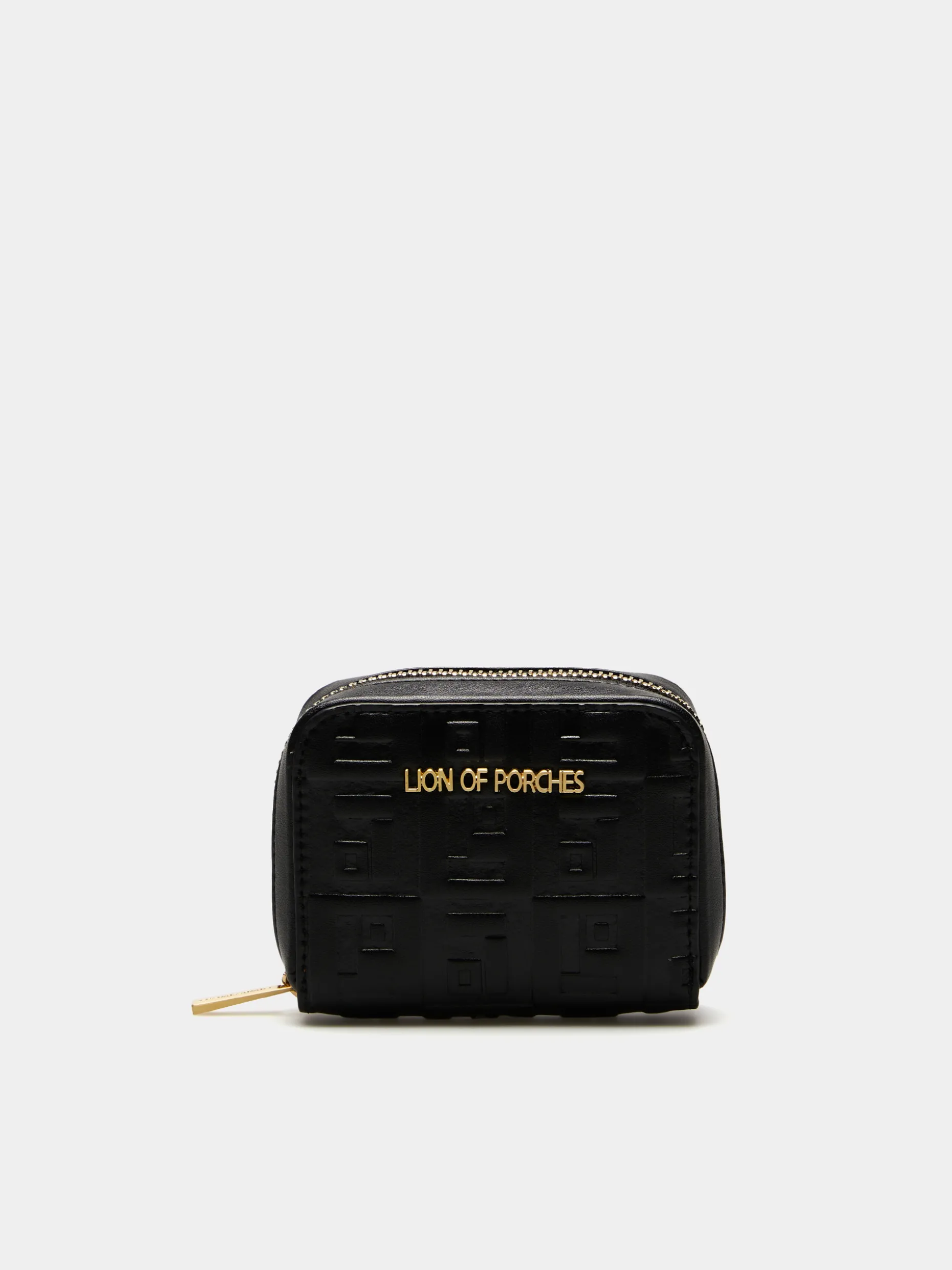 Porta-moedas preto com monograma gravado em relevo e logotipo dourado metálico aplicado na frente. Abertura em leque com fecho de correr. Zíper personalizado. Feito com matérias primas vegan.