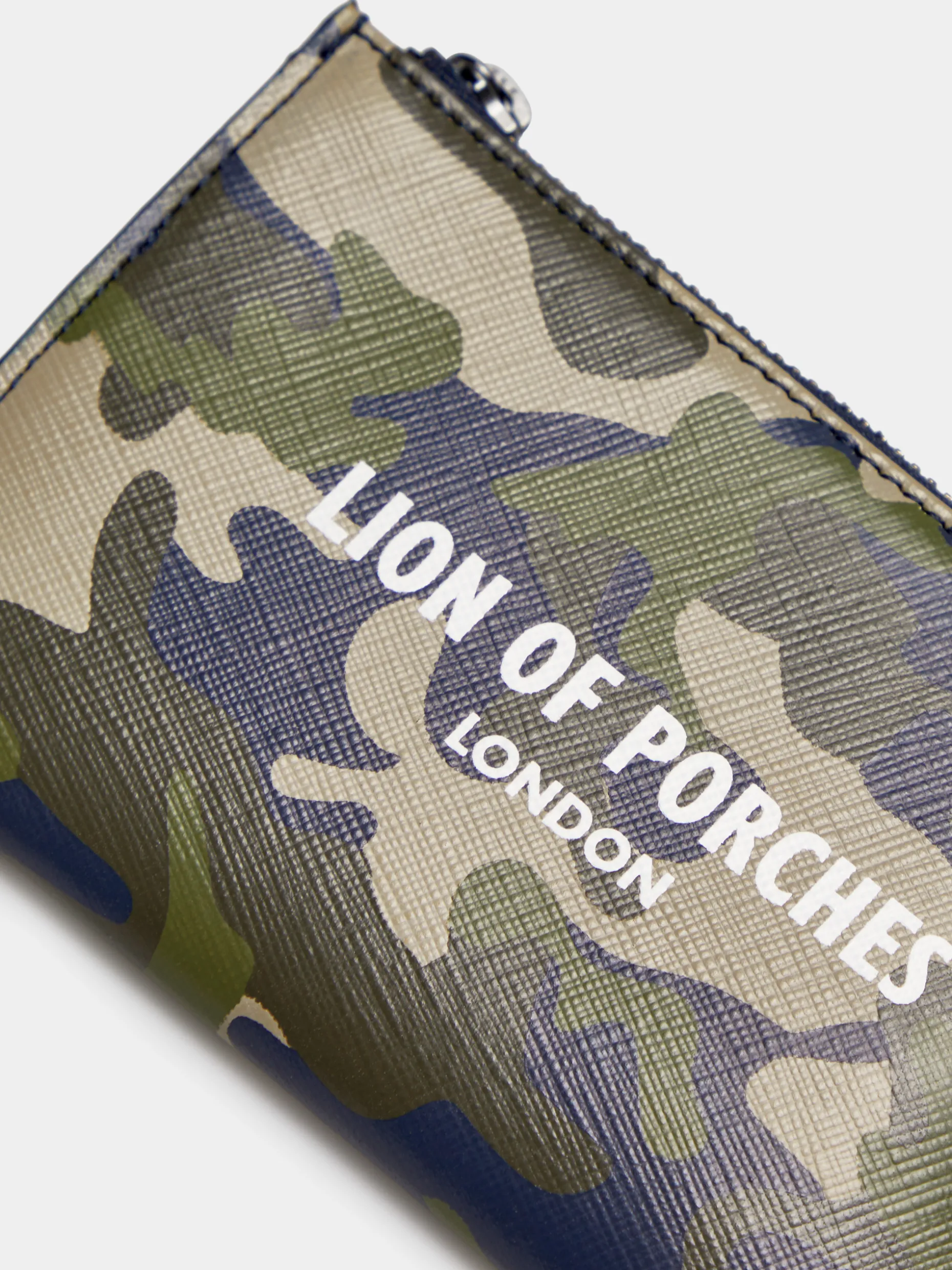 Porta-moedas com padrão. Em pele. Fita tricolor personalizada na lateral. Fecho superior. Estampado Lion of Porches contrastante.