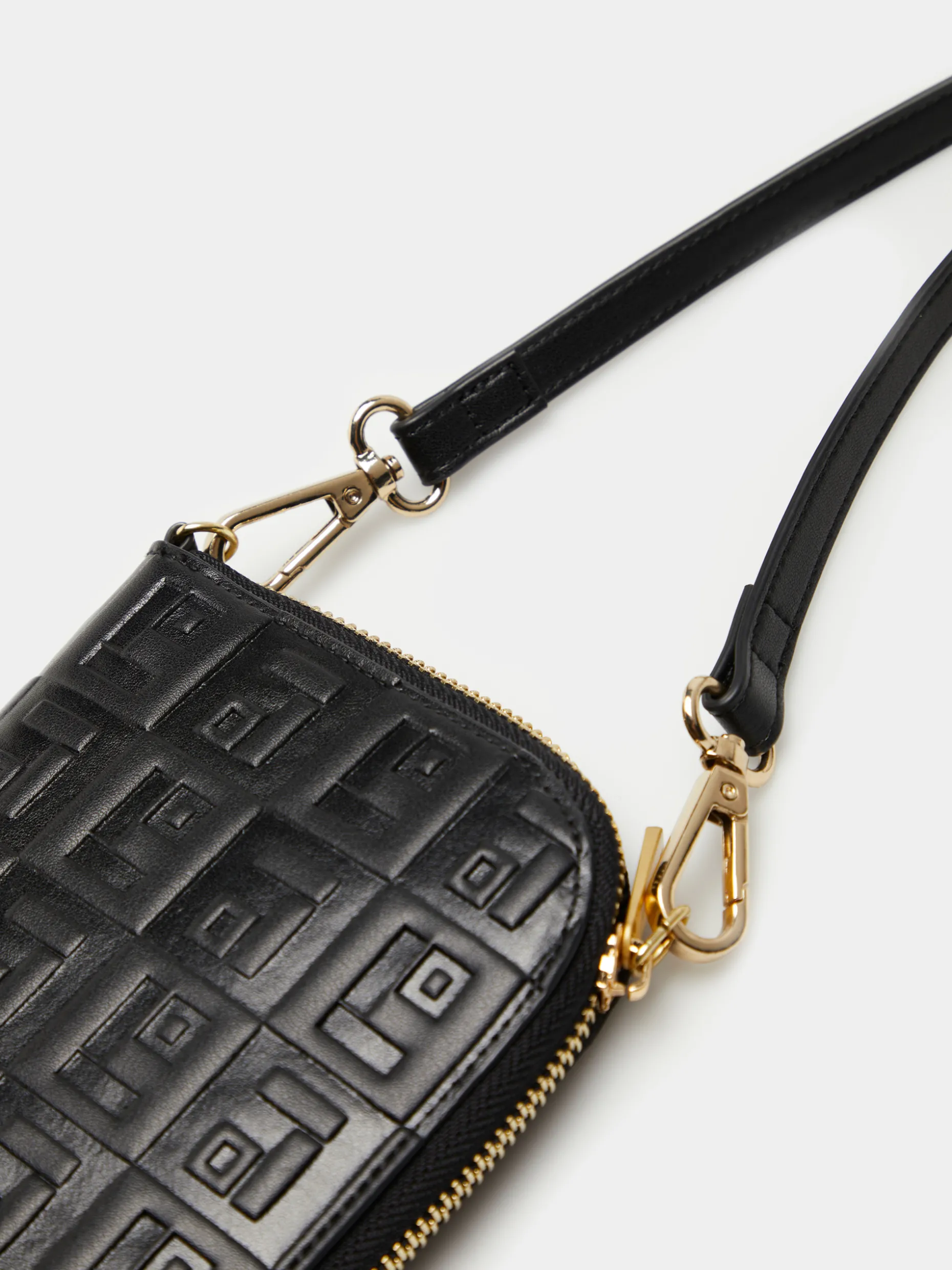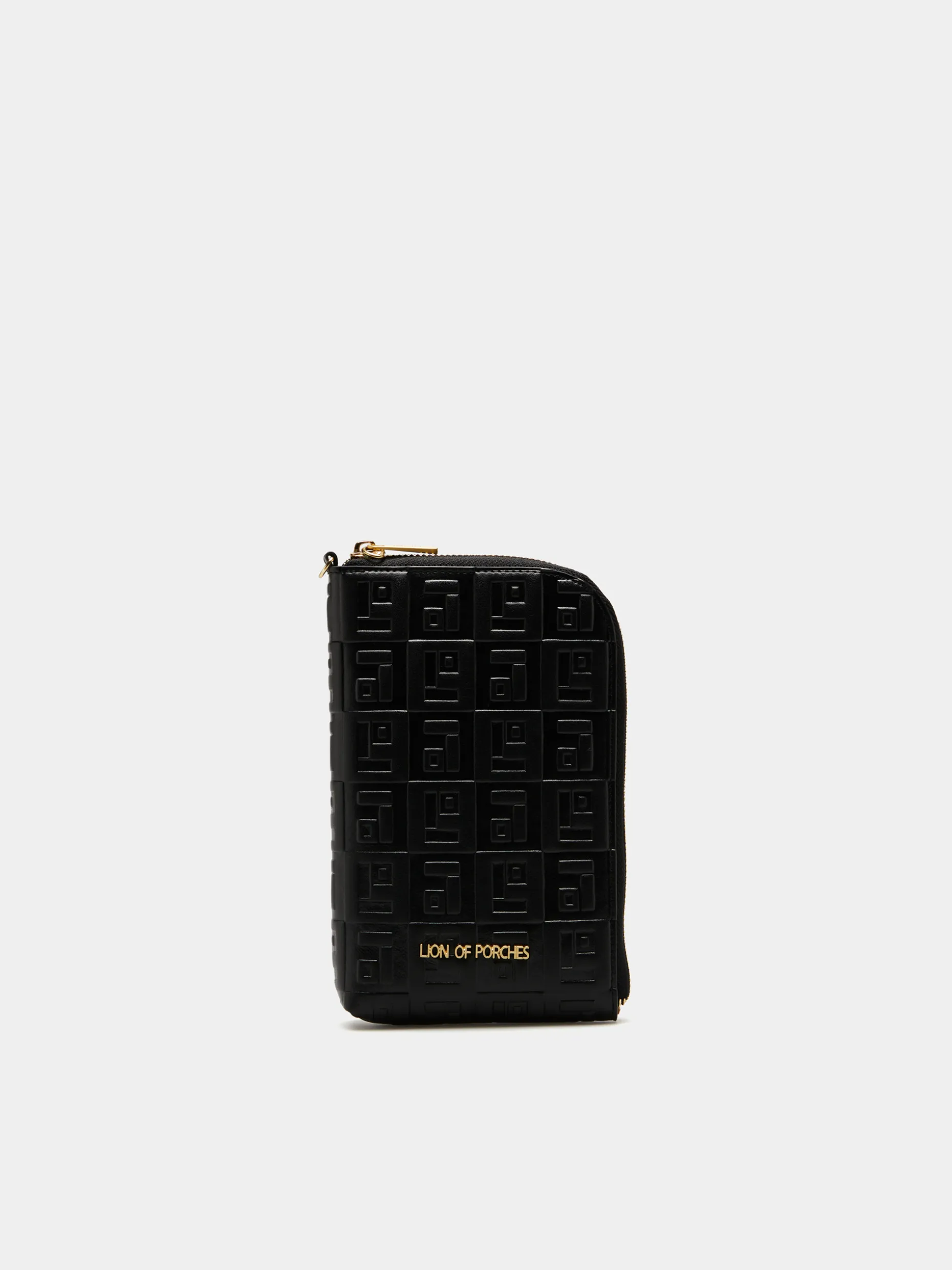 Porta telemóveis preto com monograma gravado em relevo e logotipo dourado metálico aplicado na frente. Fecho de correr com zíper personalizado. Compartimentos interiores. Produzido com matérias-primas vegan.