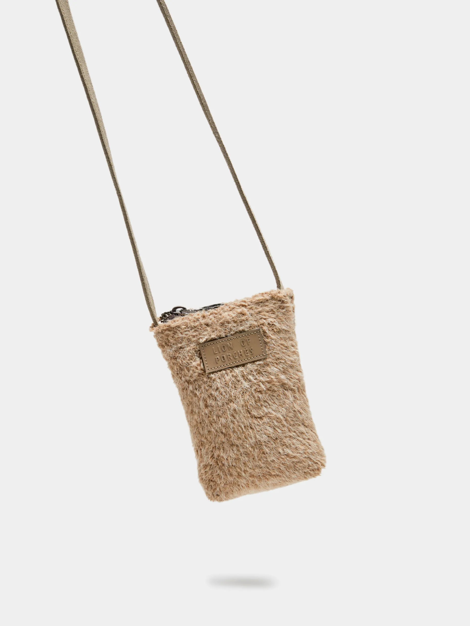 Porta-telemóvel em pelo. Alça de camurça. Etiqueta personalizada em pele na frente.
