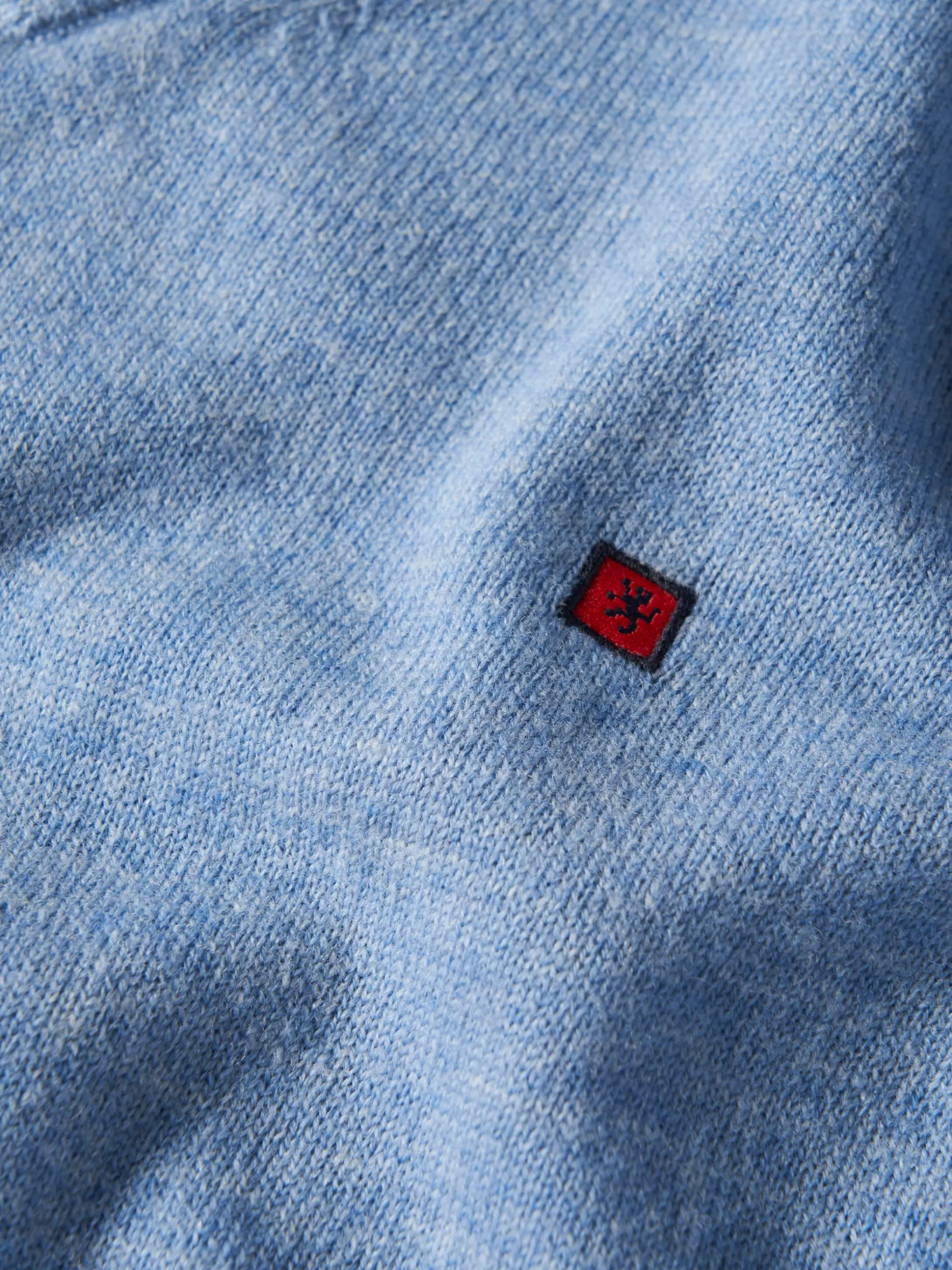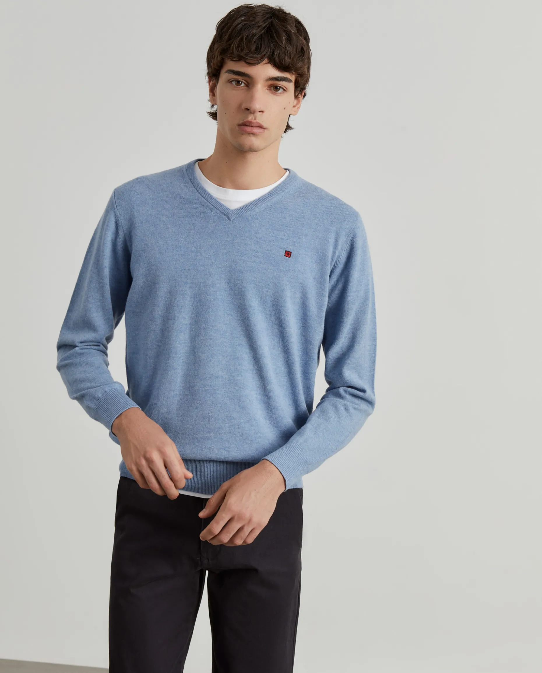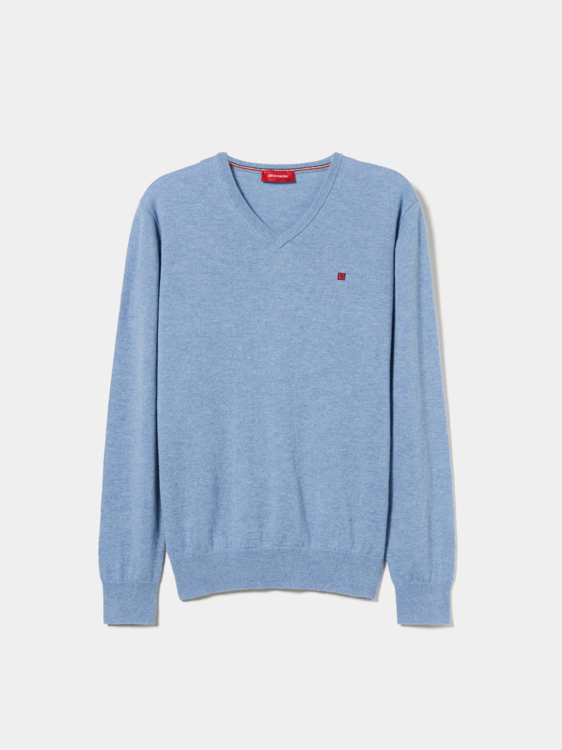 Pullover decote em bico manga comprida com etiqueta leão no peito. Riscas tricolor no interior da gola.