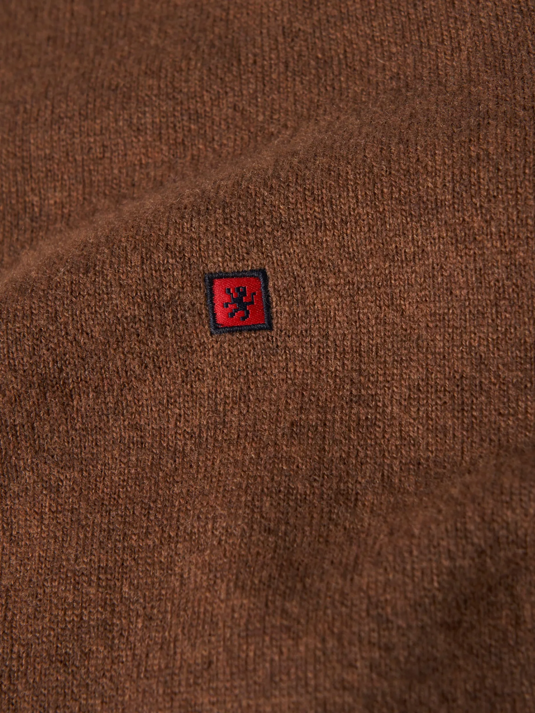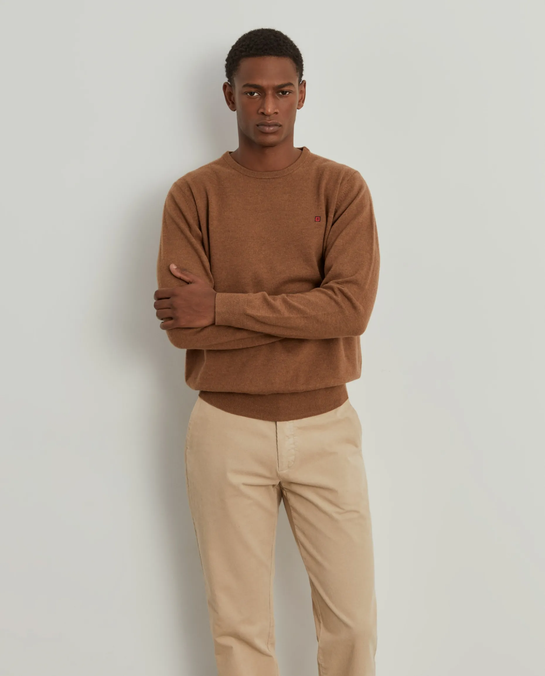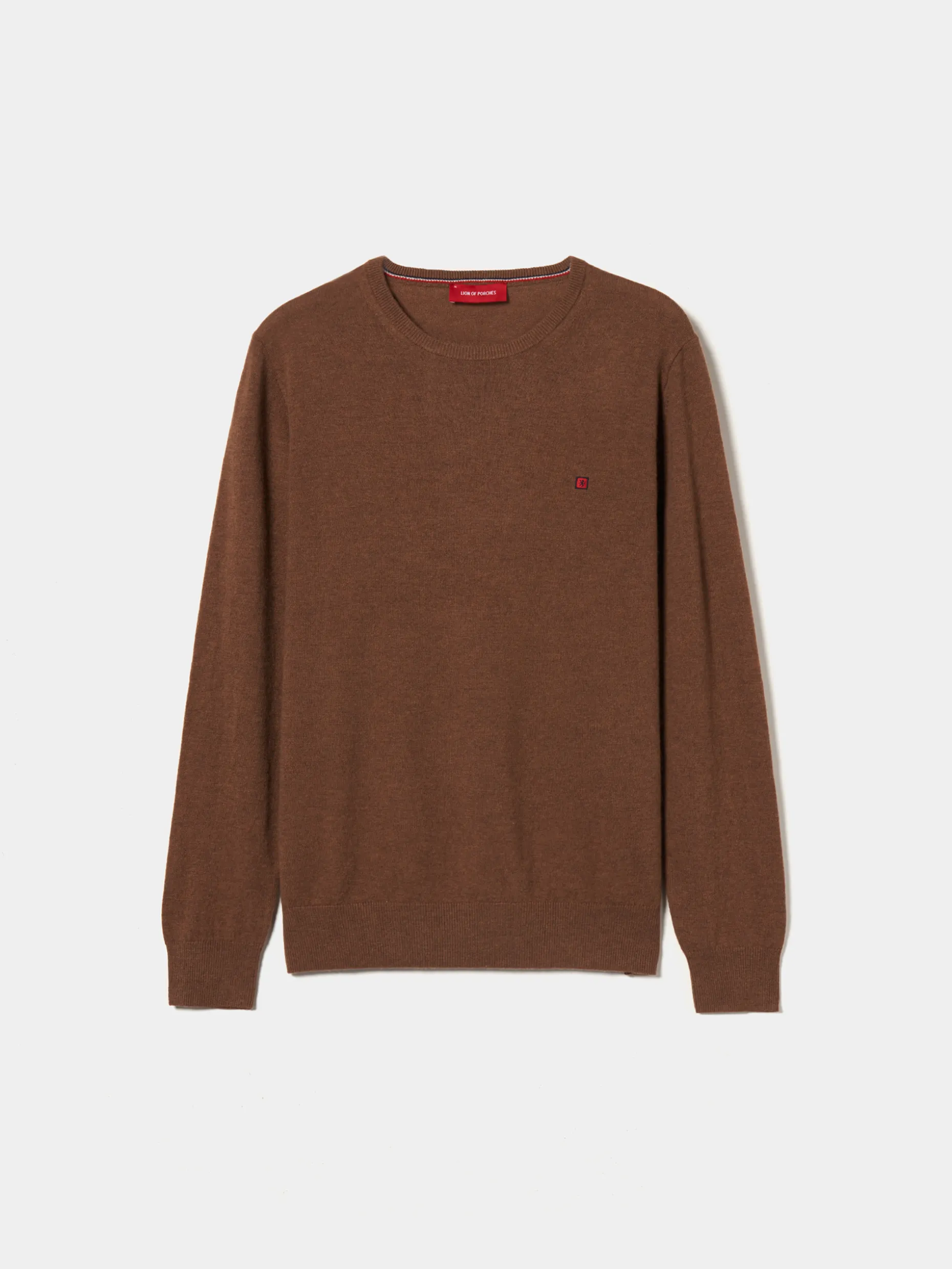 Camisola decote redondo manga comprida com etiqueta leão no peito. Riscas tricolor no interior da gola.