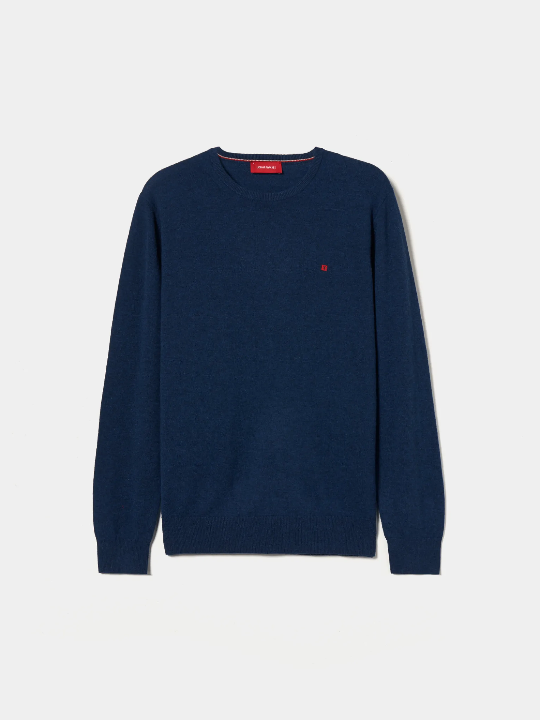 Camisola decote redondo manga comprida com etiqueta leão no peito. Riscas tricolor no interior da gola.