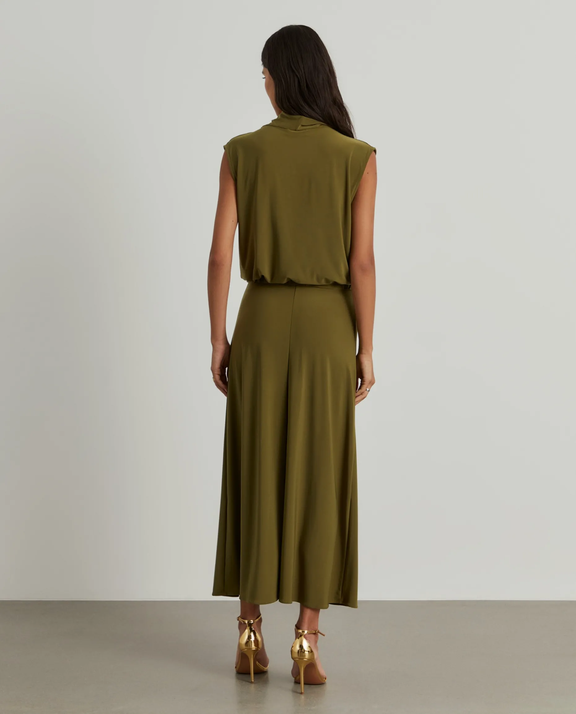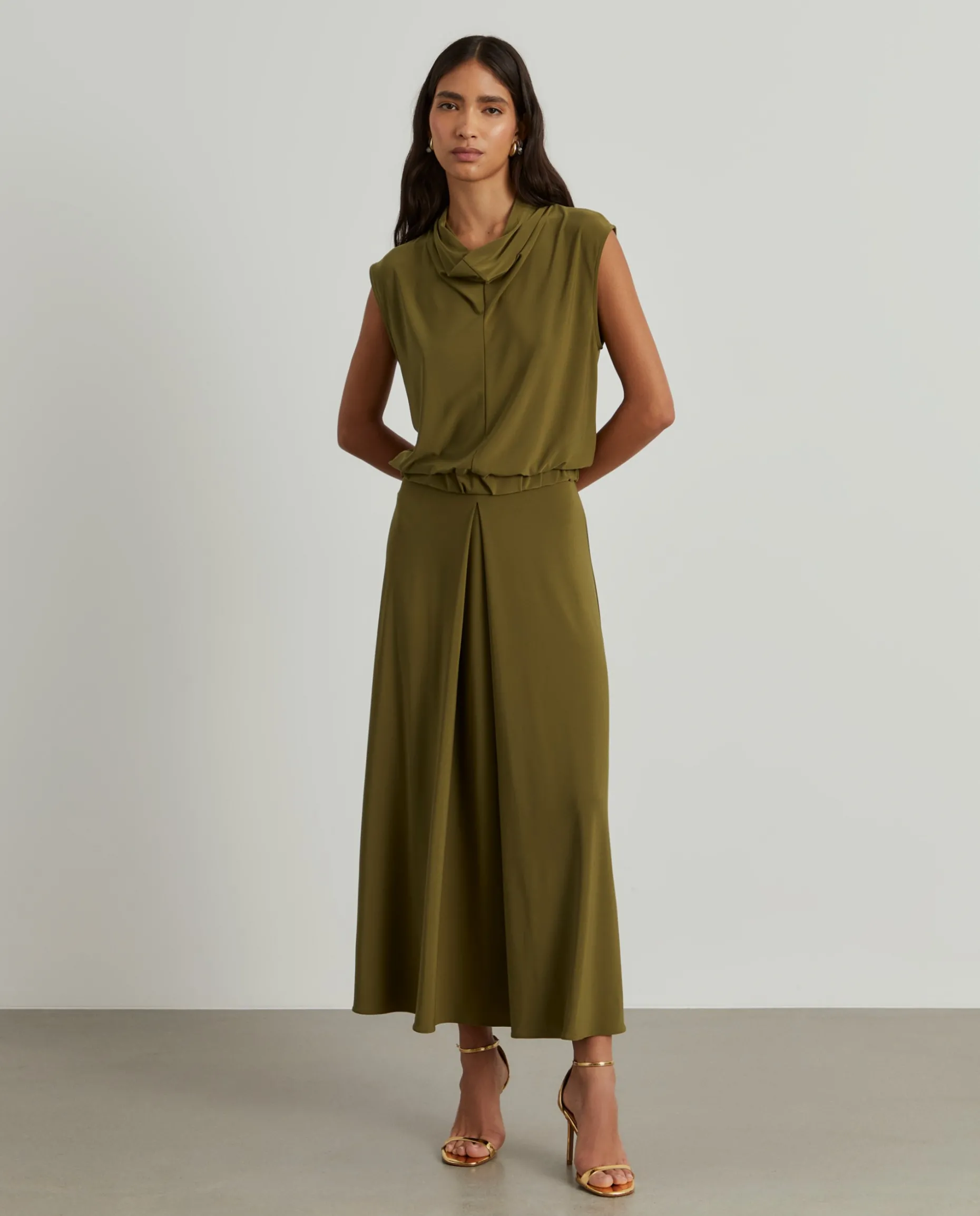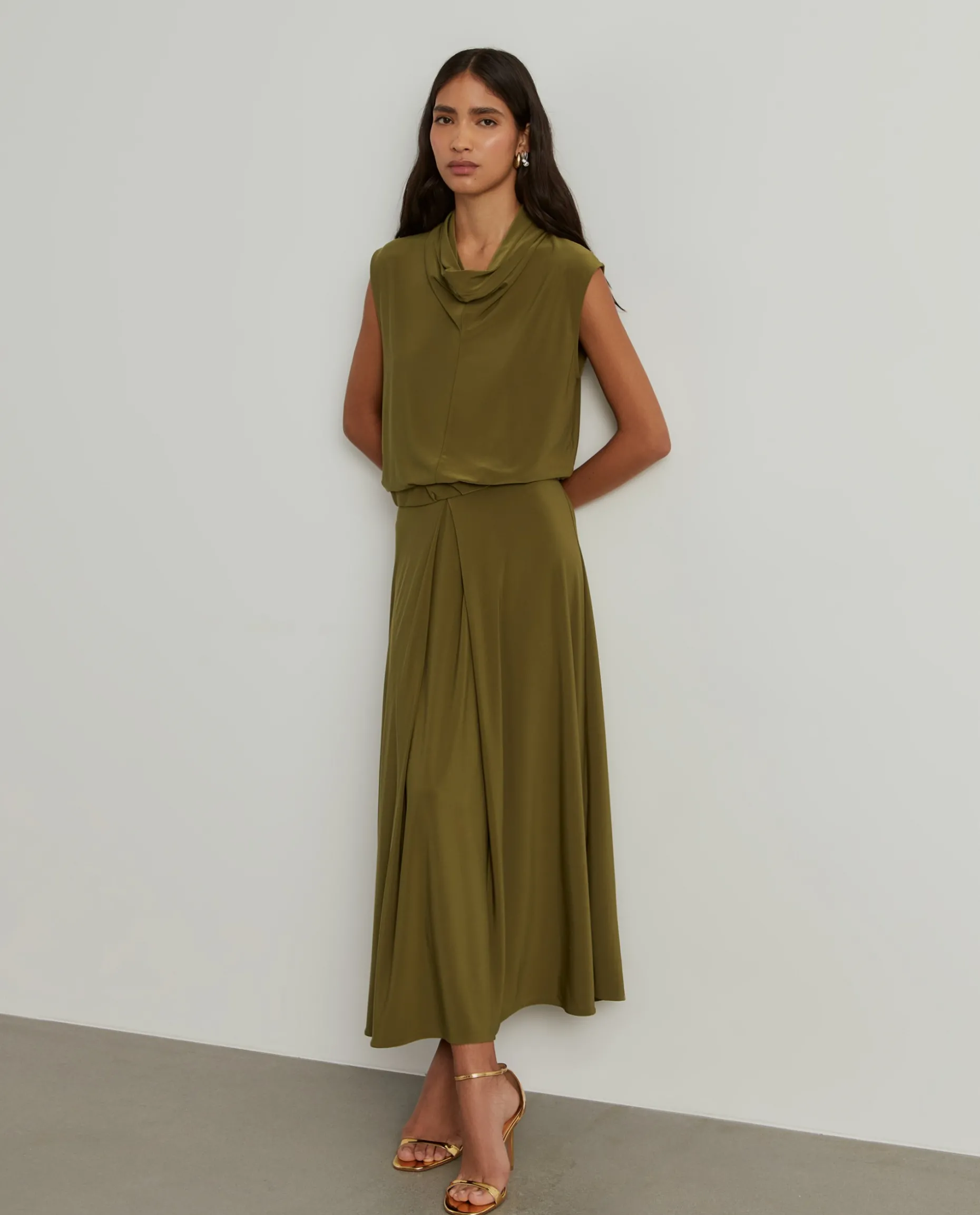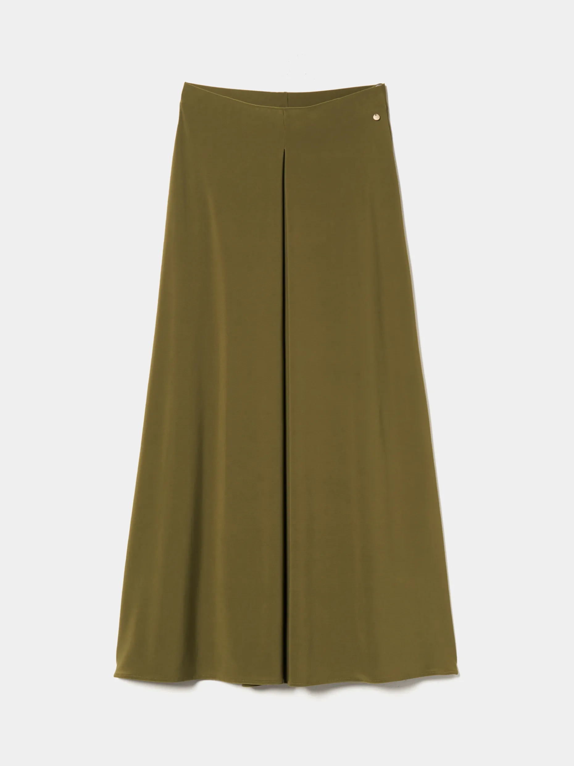 Elegante e confortável, esta saia comprida de malha complementa na perfeição com a blusa sem mangas, da mesma coleção. Fluida e com cintura elástica, tem um macho na frente que lhe dá um toque diferenciador.