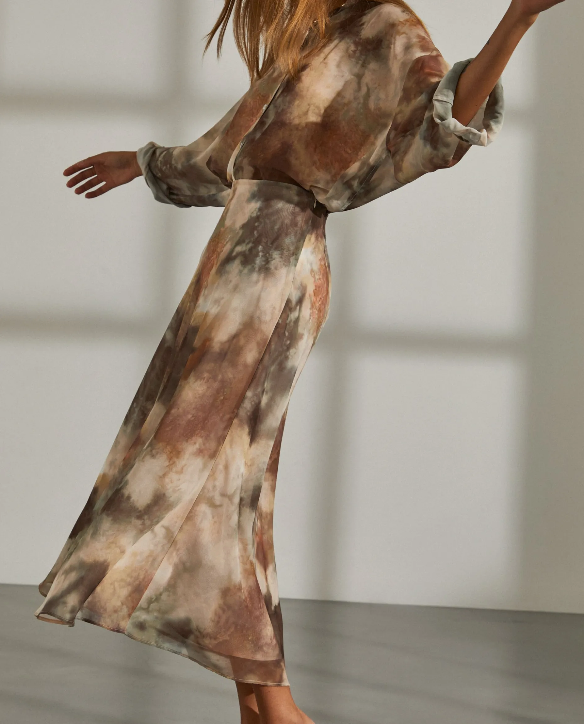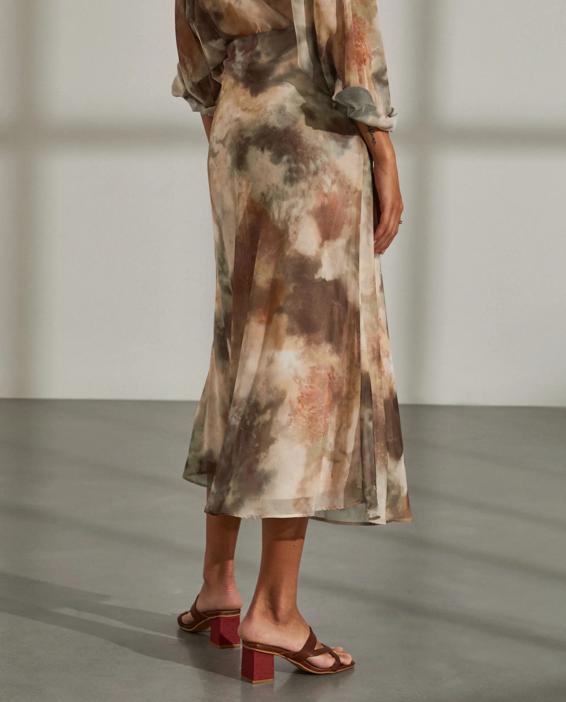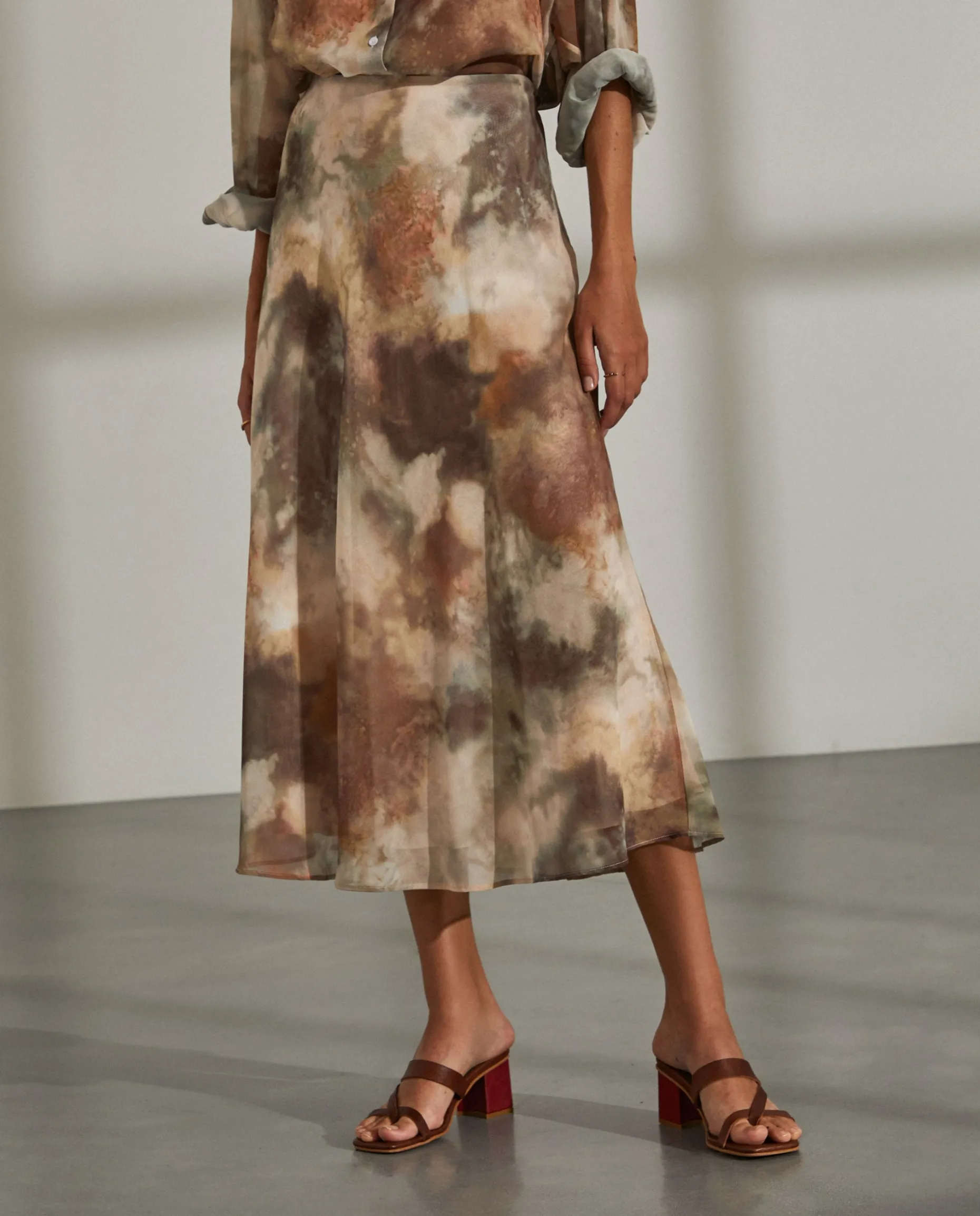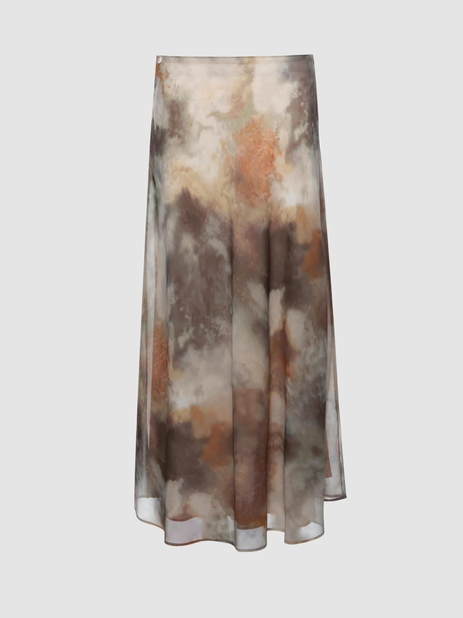Saia comprida estampada com corte evasé. Forro interior. Aperta com um fecho invisível na lateral.