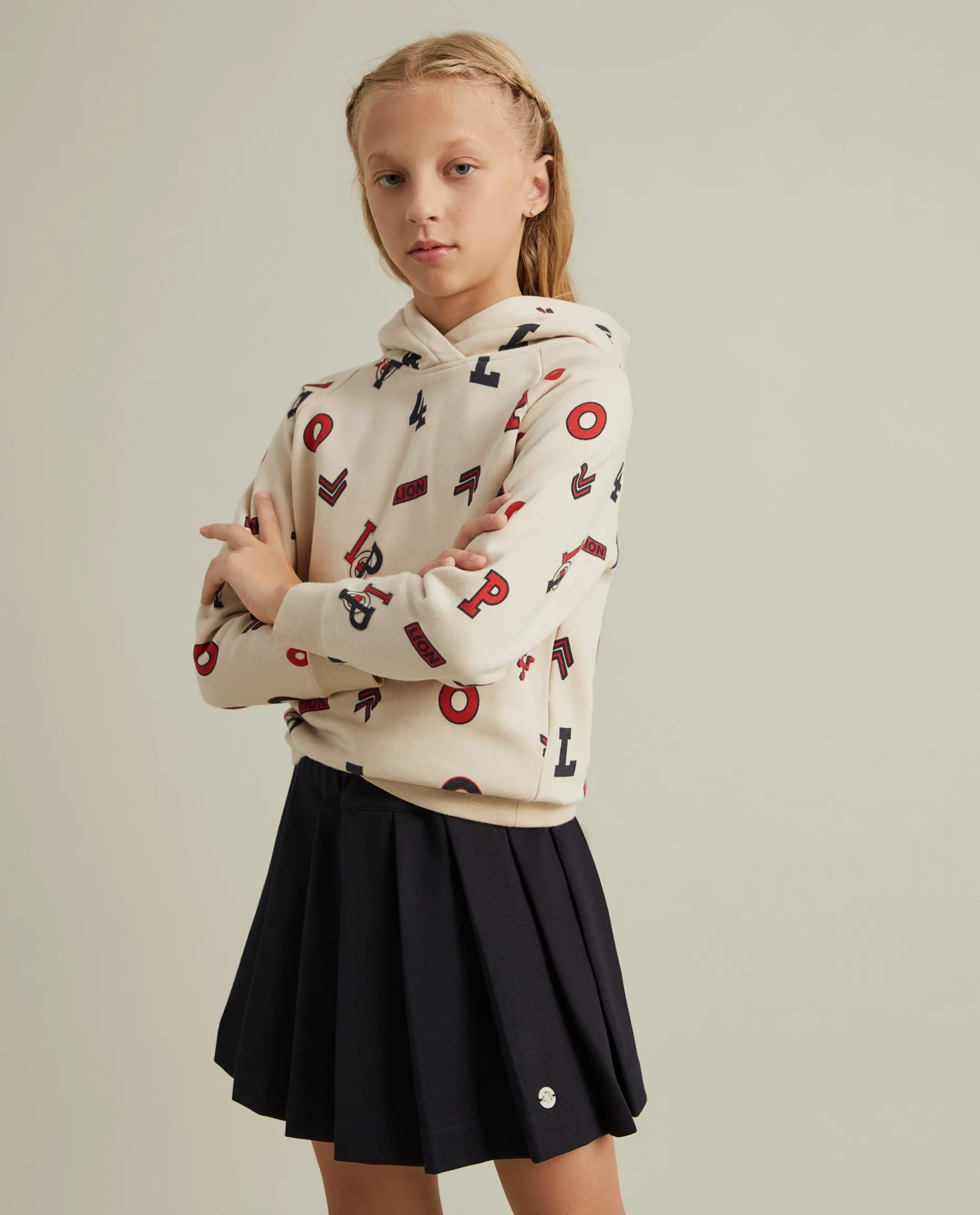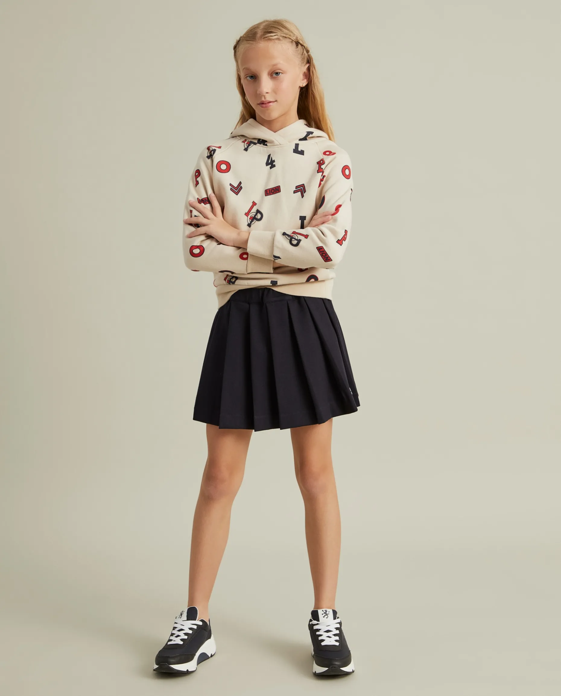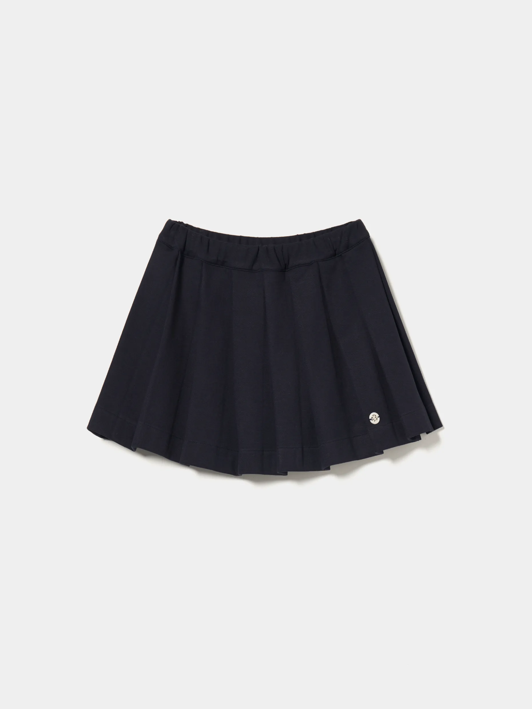 Saia curta, de pregas, com elástico na cintura. Leve e confortável, perfeita para as miúdas mais vaidosas. Finaliza com placa redonda com leão da marca, na base, em contraste de cor.
