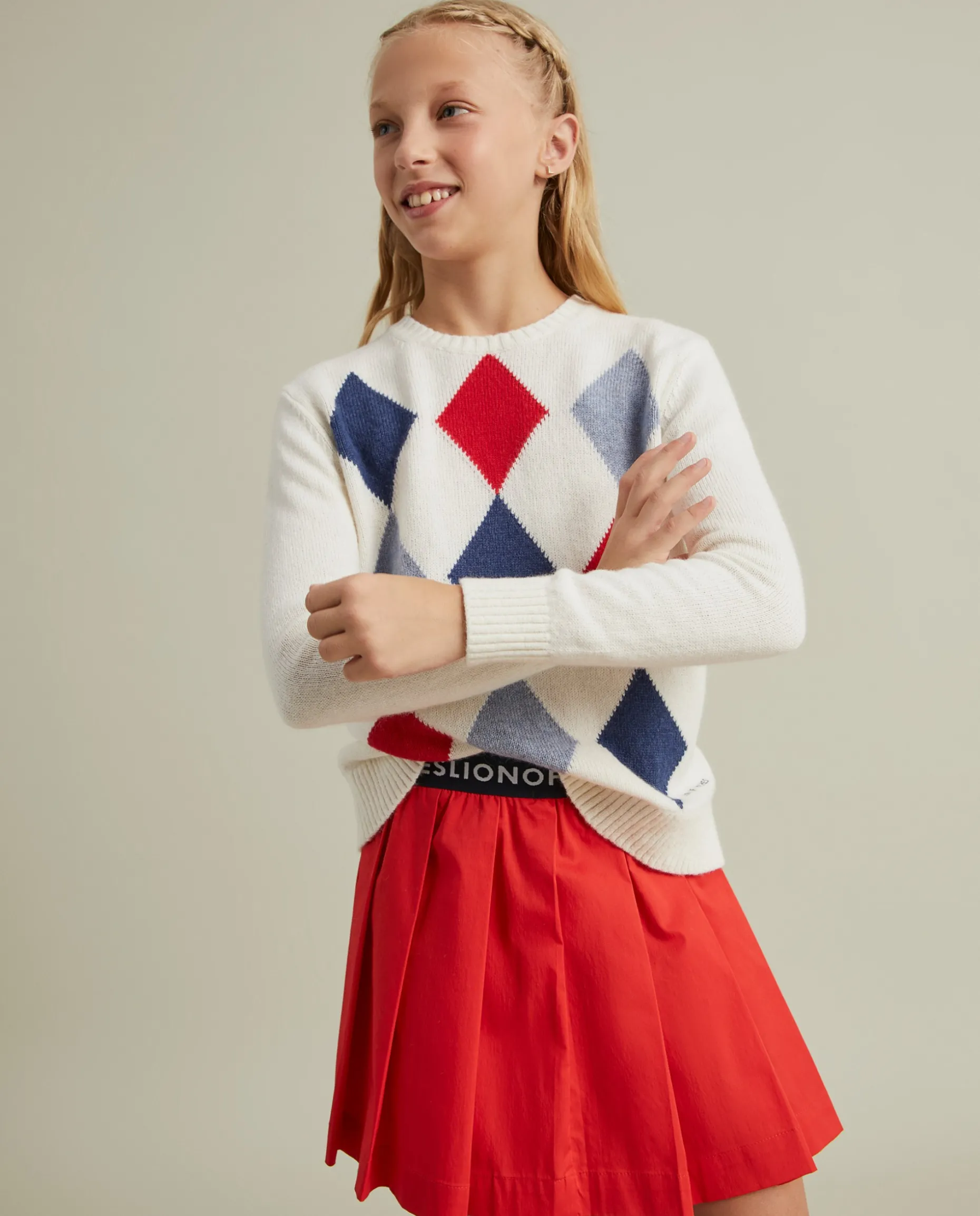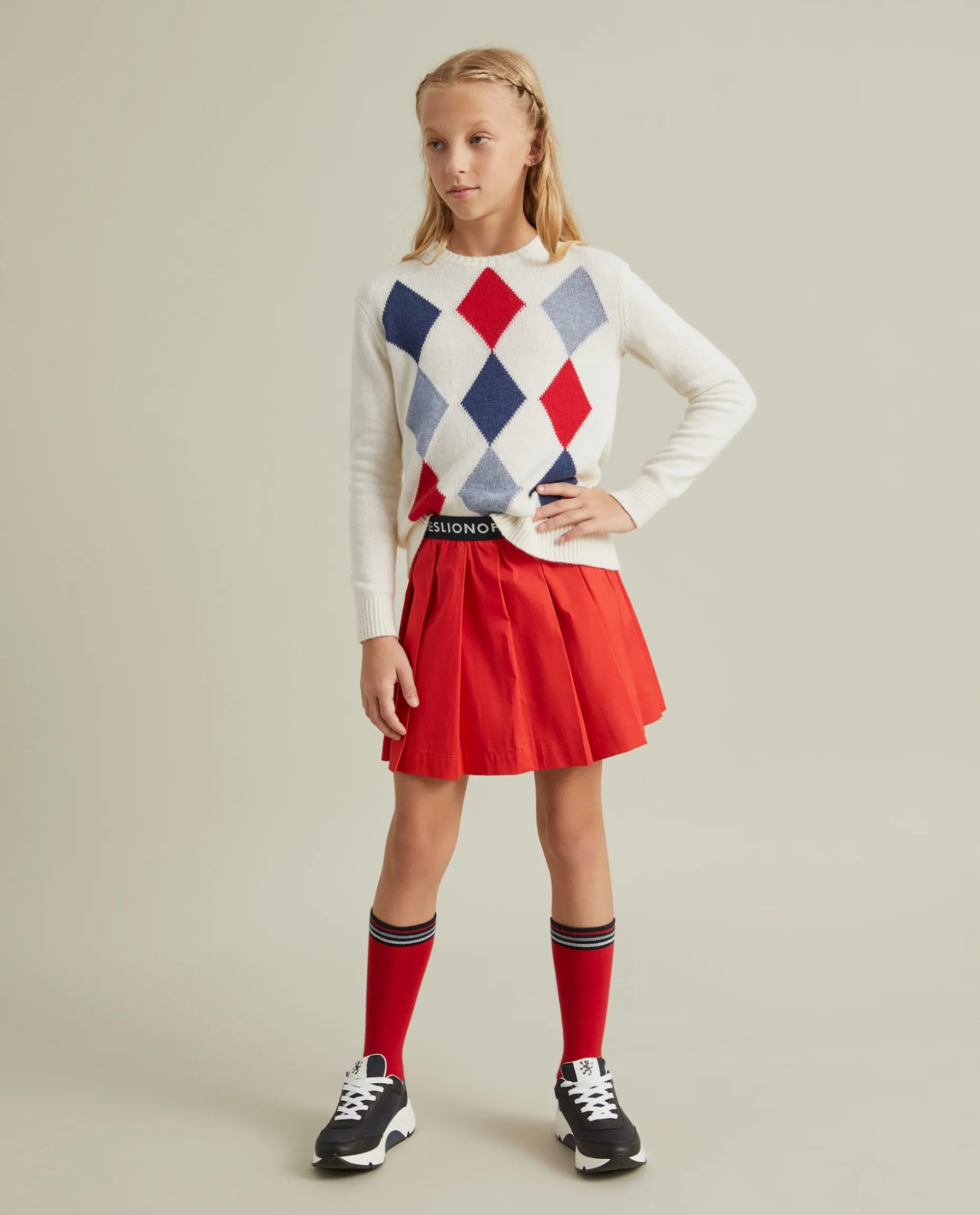 Para as miúdas mais vaidosas, propomos esta saia curta, de pregas, com cintura elástica para maior conforto. A cintura é em contraste de cor com branding Lion of Porches a toda a volta.