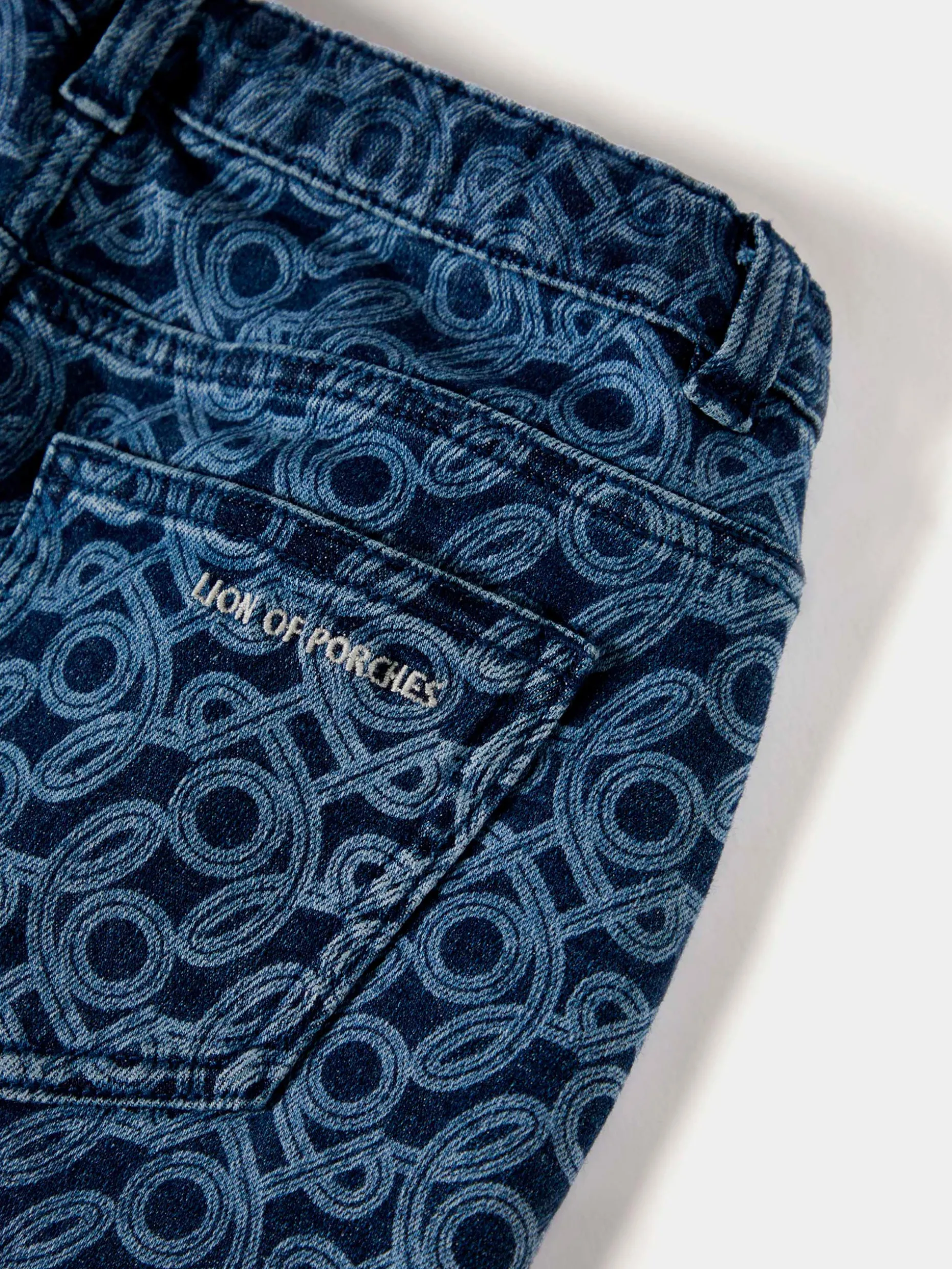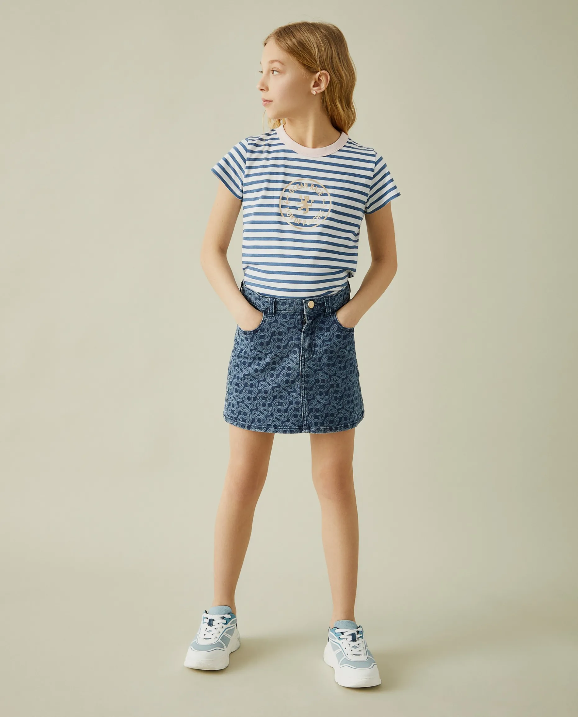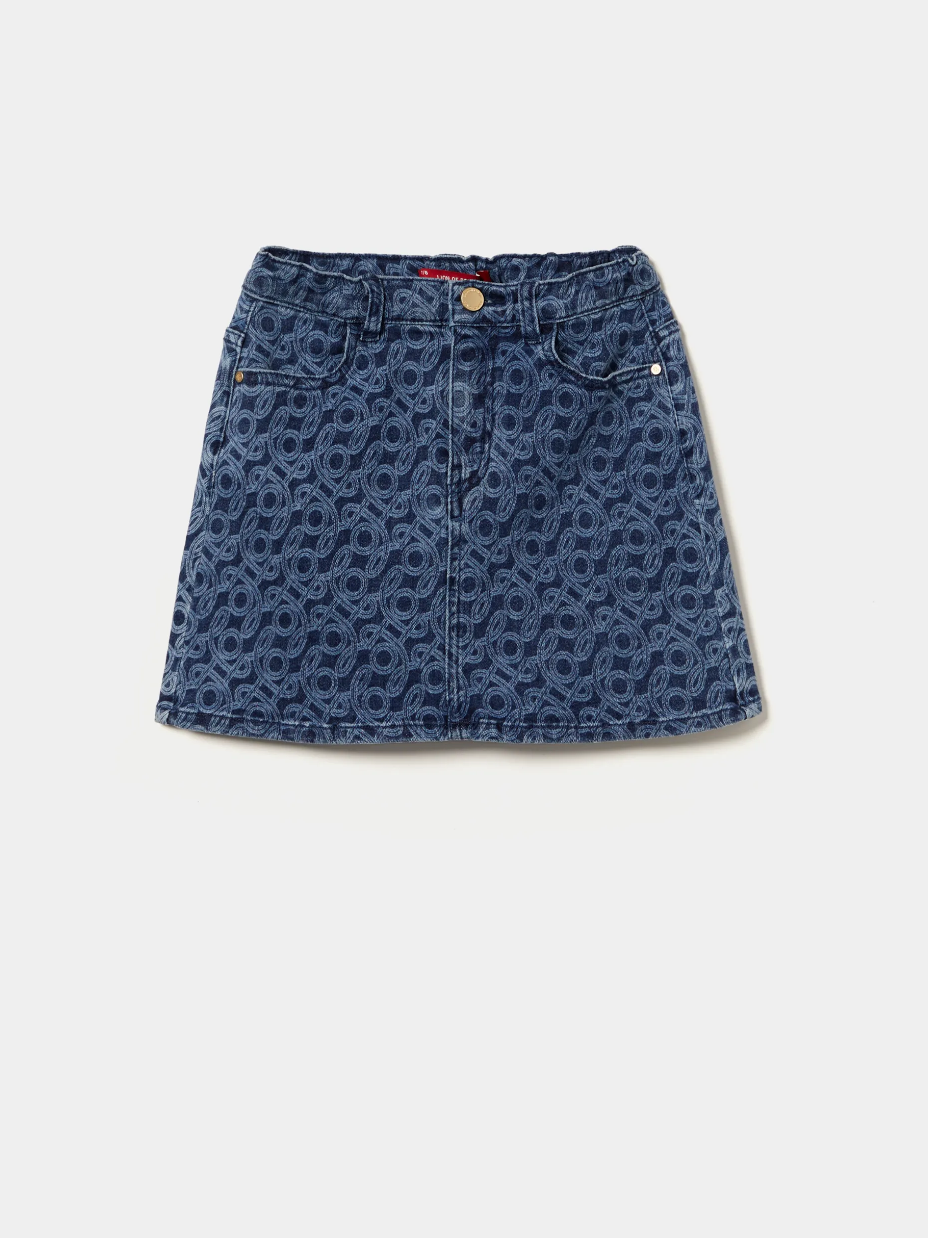 Saia em denim com monograma da marca por toda a peça. Aperta com botão em contraste e fecho de correr oculto por carcela. Finaliza com bolsos frontais e traseiros.
