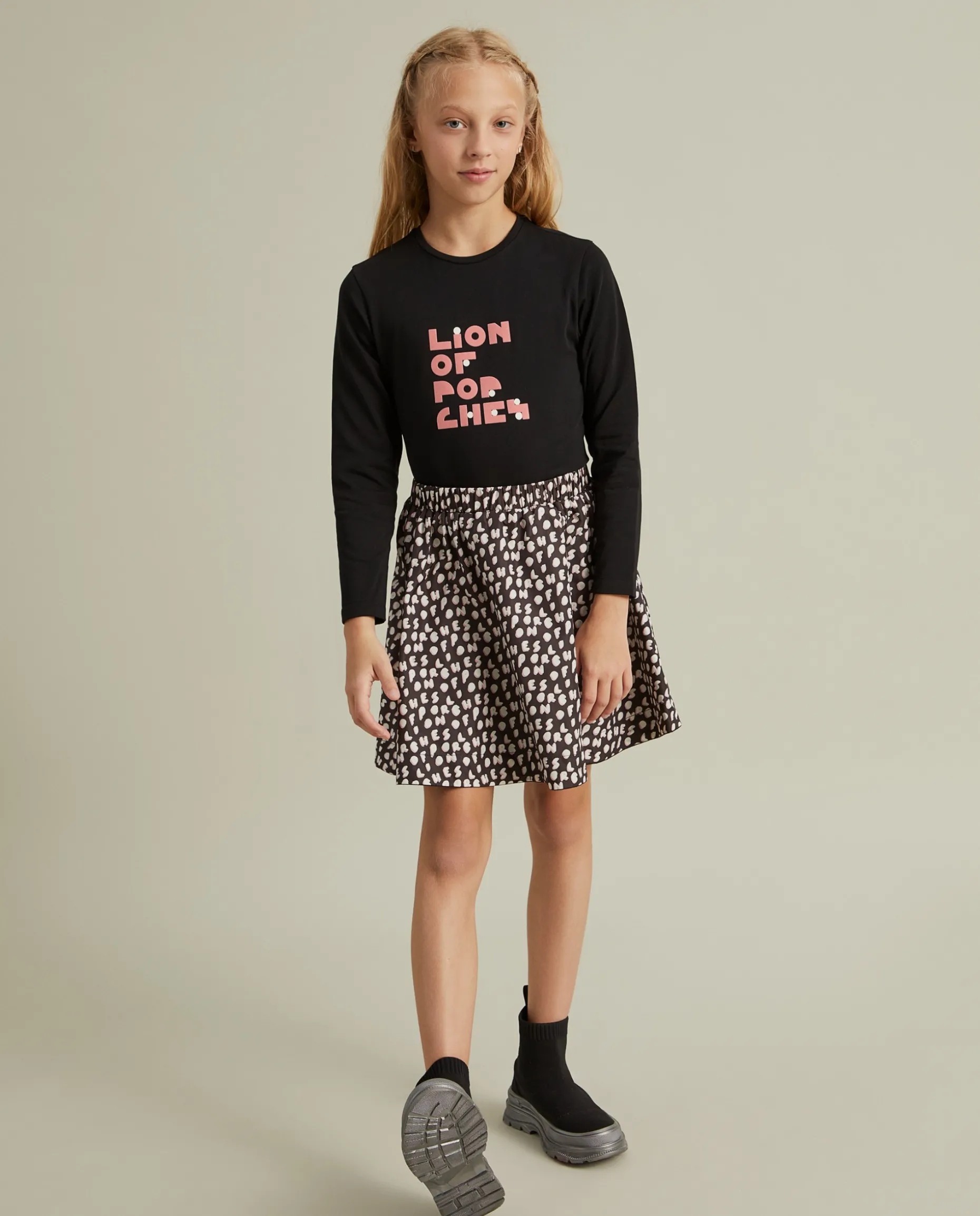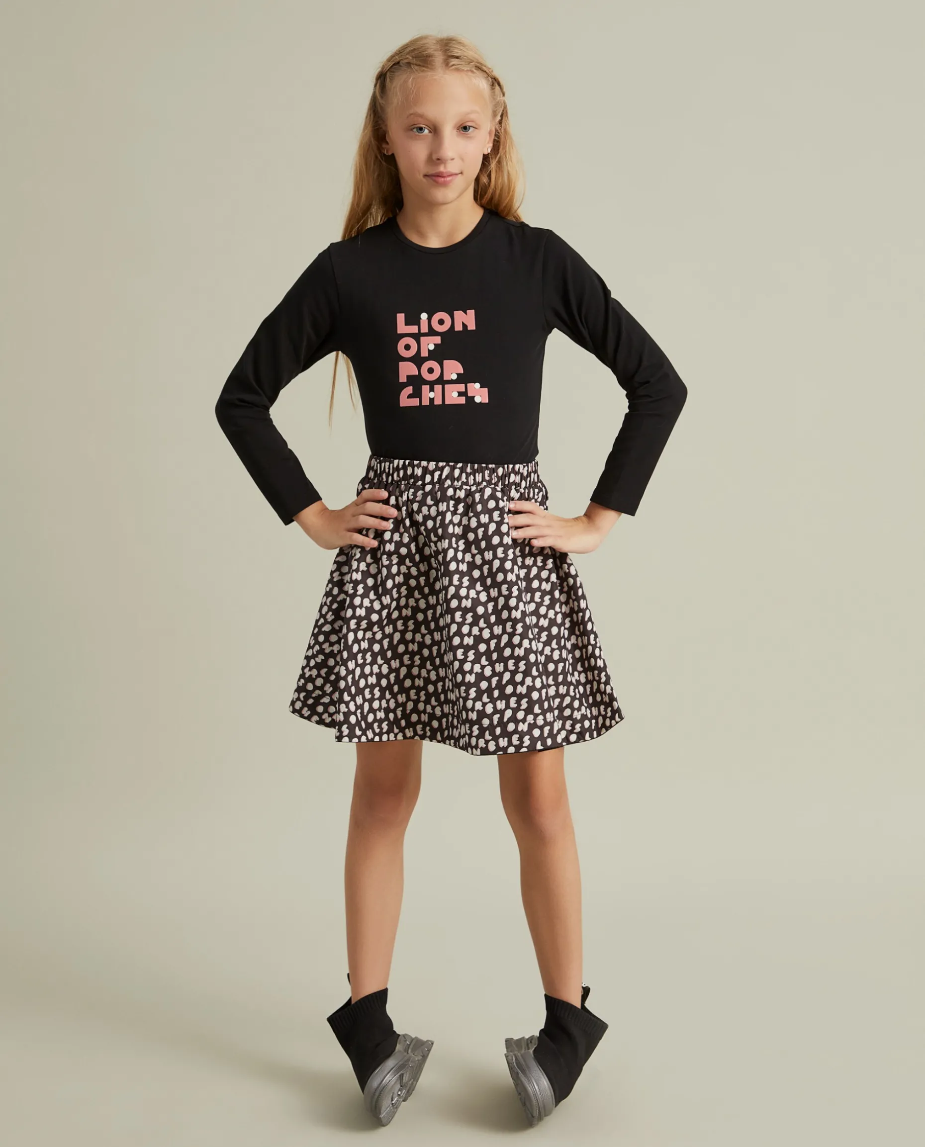 Saia reversível, confortável e versátil para se adaptar aos mais variados looks consoante a ocasião. De um lado, com estampado Lion of Porches em contraste. Do outro, de cor lisa. A cintura é elástica.