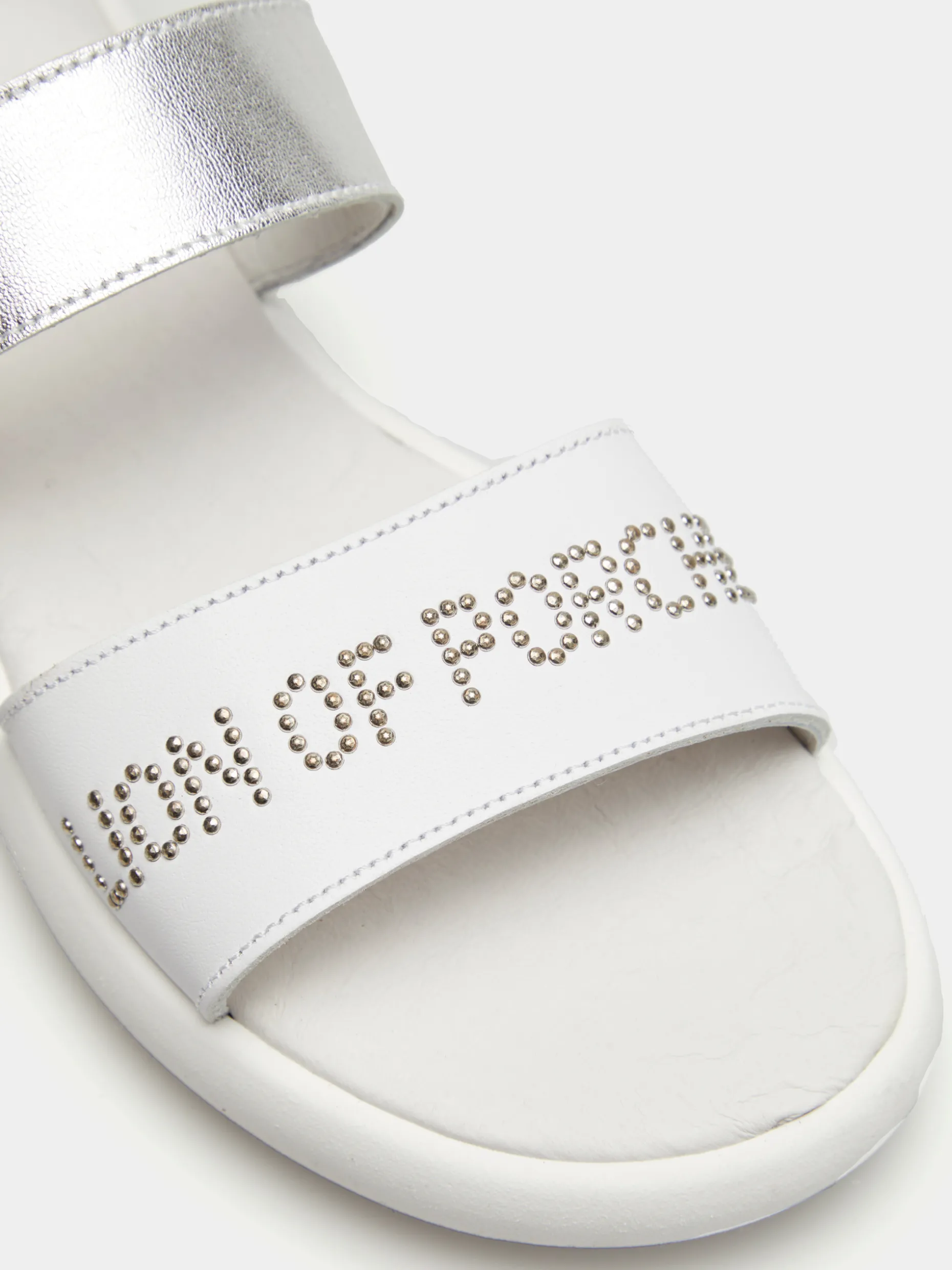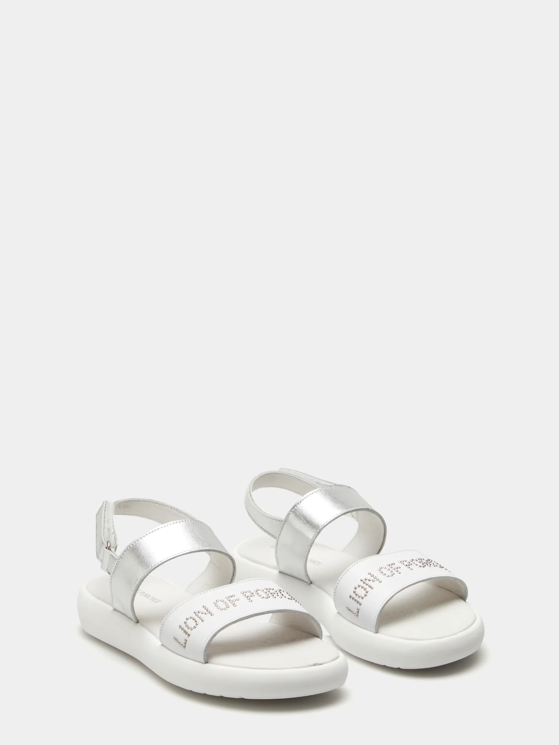Sandálias de 2 cores. Branding Lion of Porches em pérolas prata na frente. Palmilha com estampado em contraste. Fivela ajustável no tornozelo.