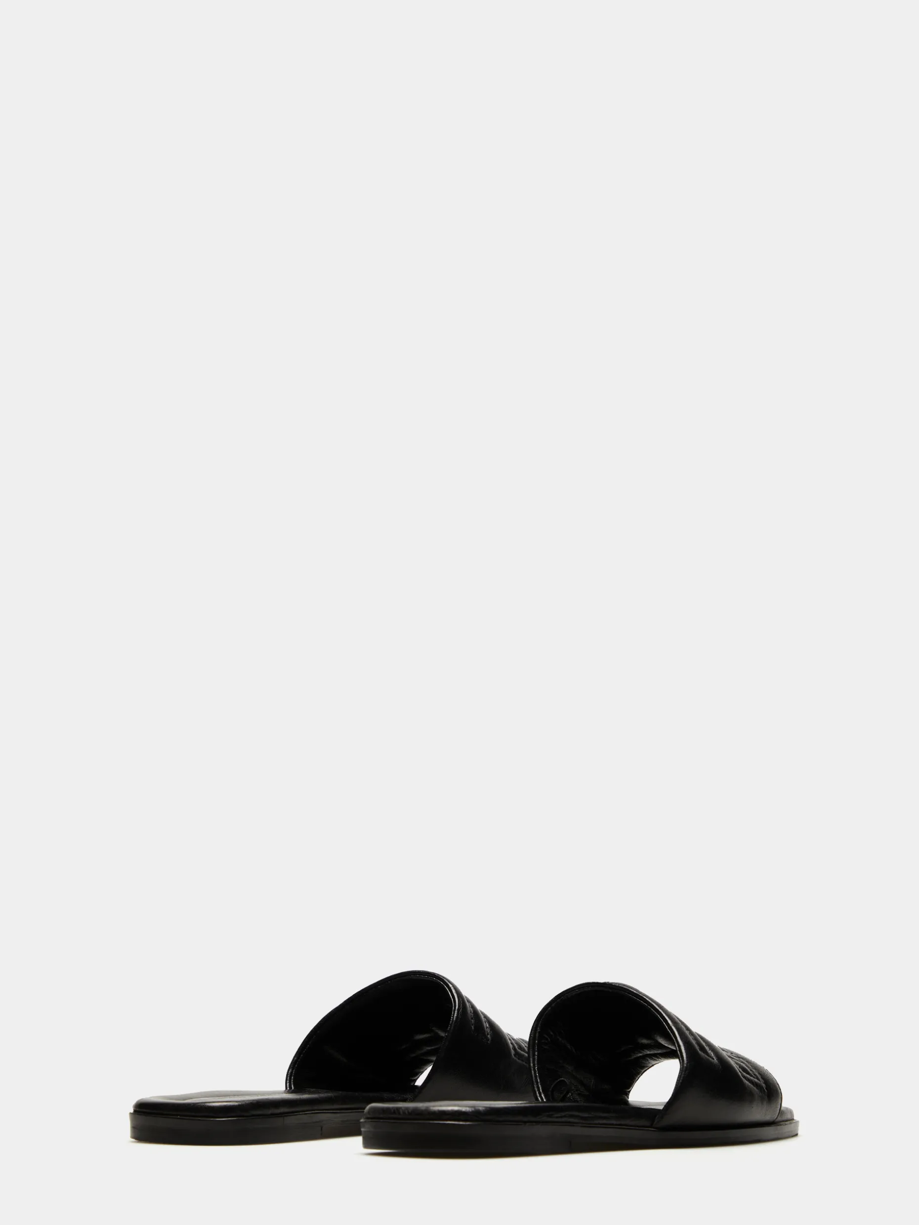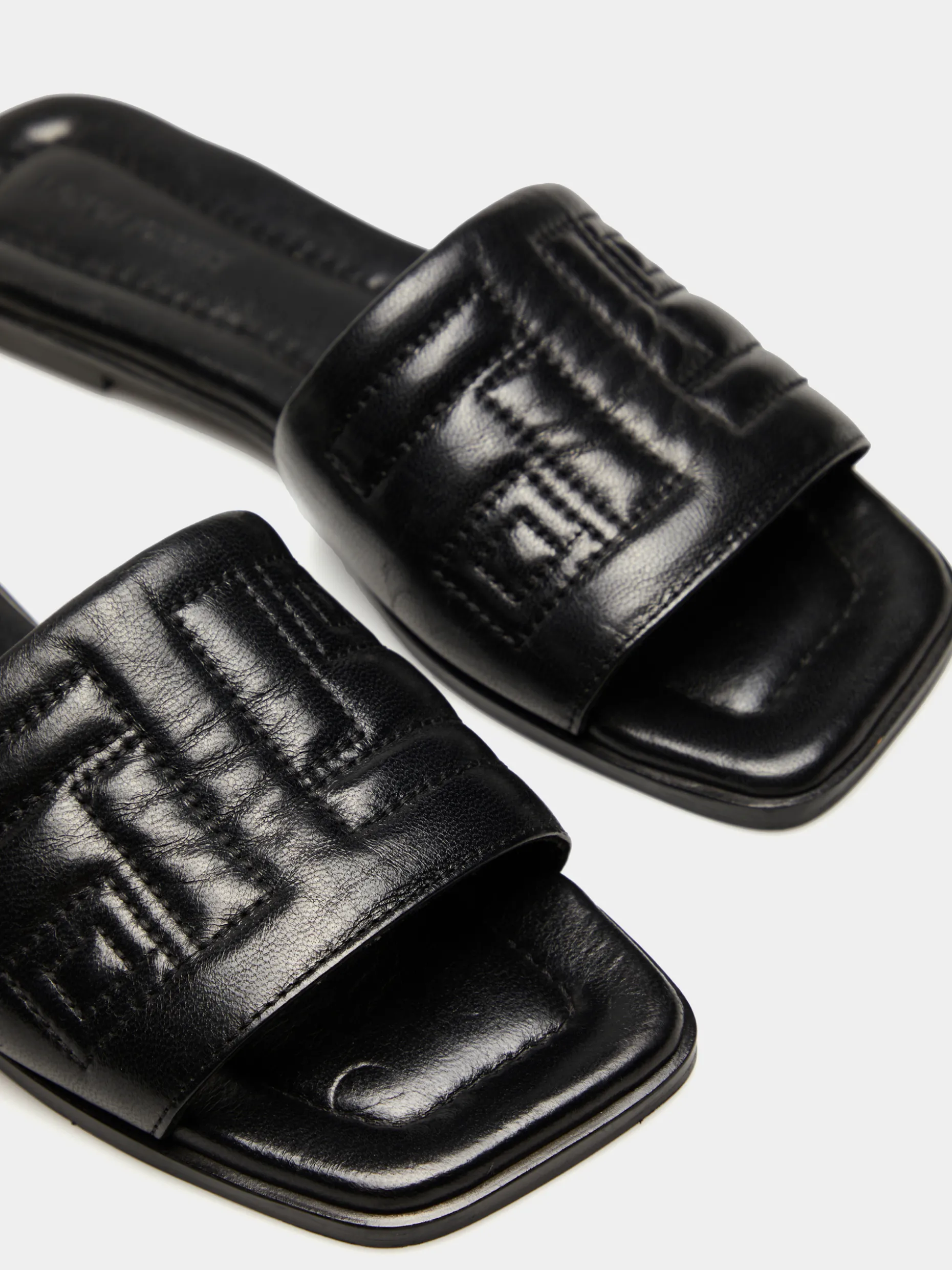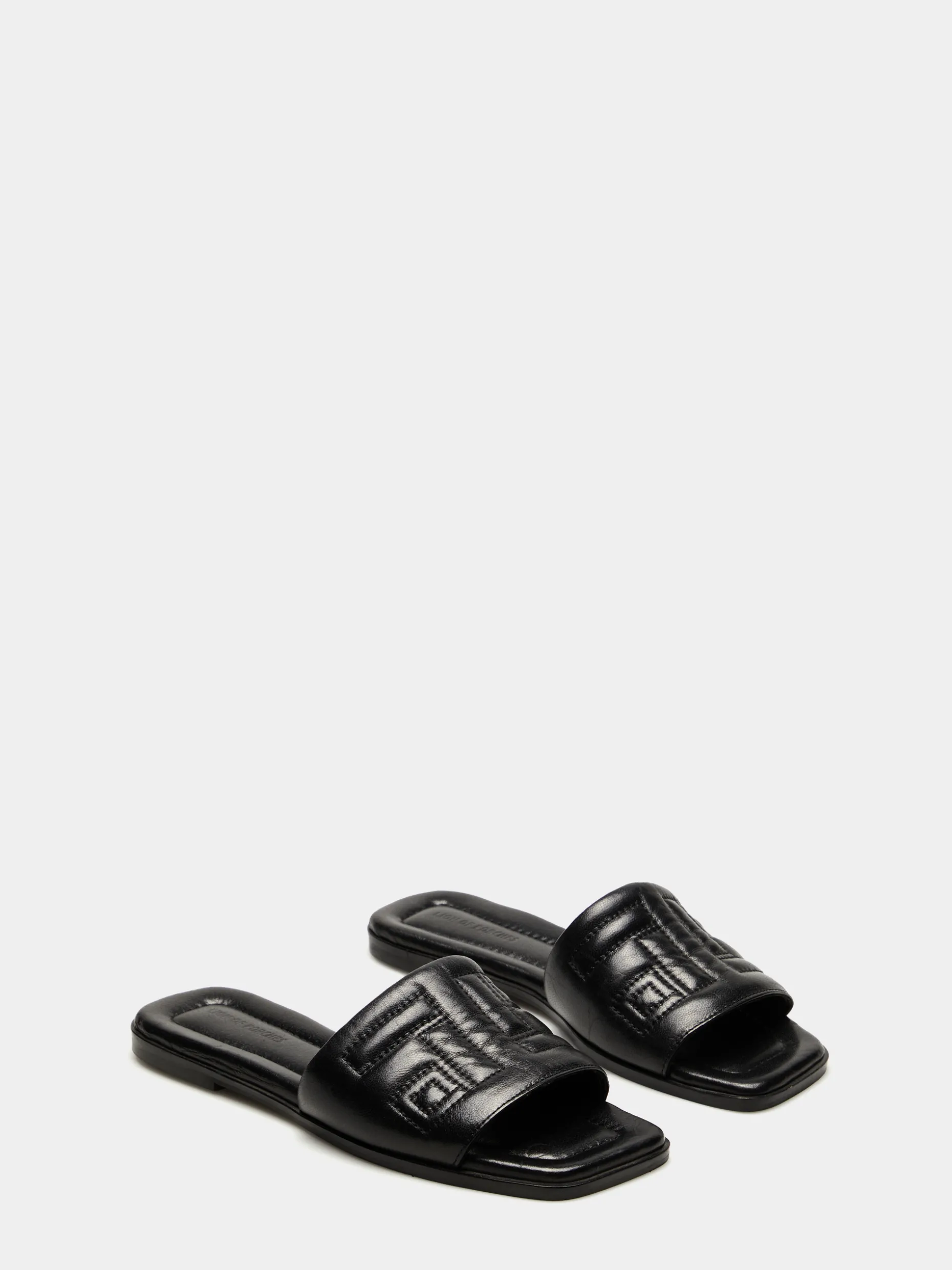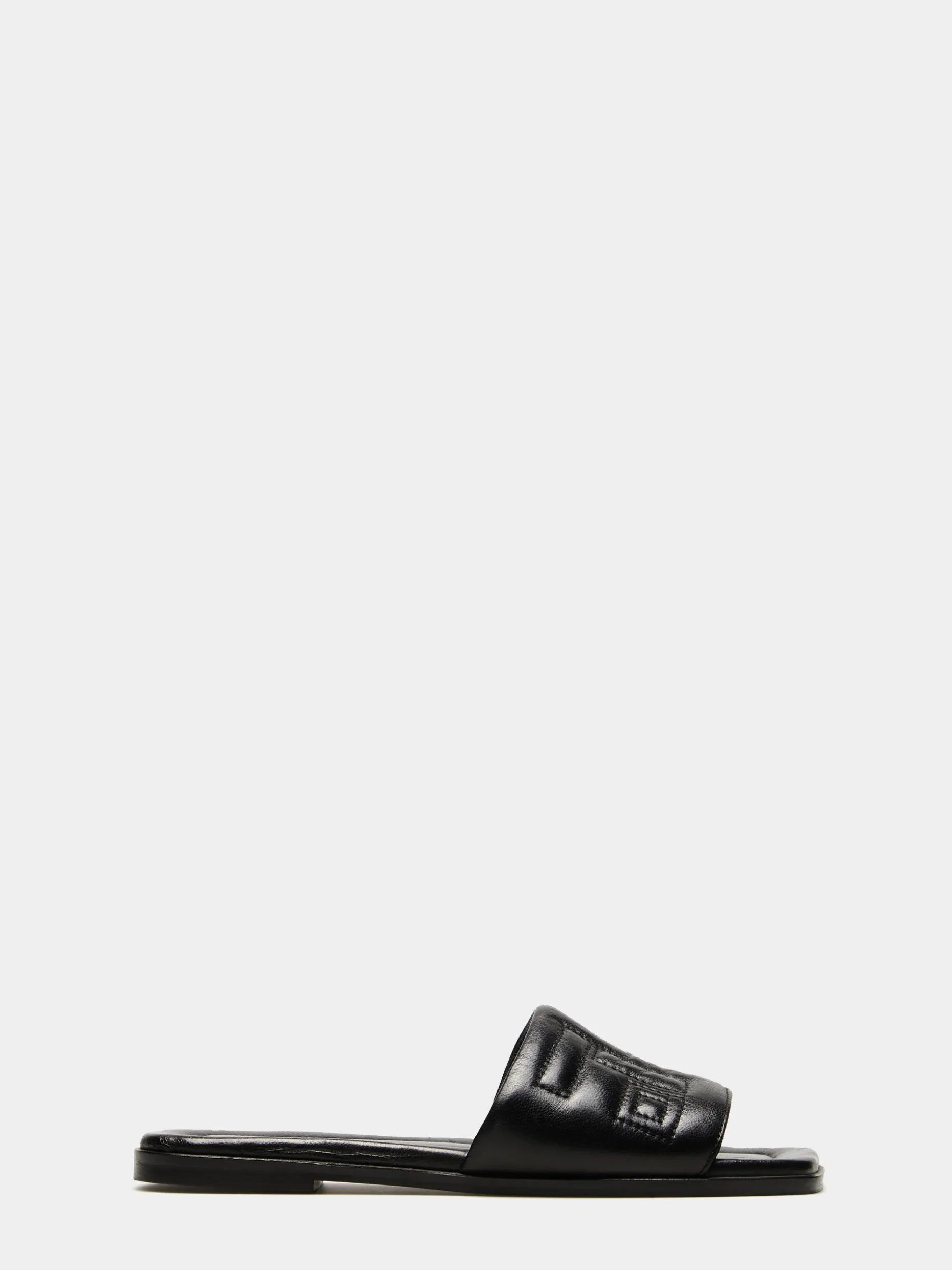 Sandália rasa acolchoada em pele, com pormenor de monograma pespontado ao tom para um toque diferenciador. Palmilhas também ligeiramente almofadadas que conferem maior conforto ao calçar. Biqueira quadrada.