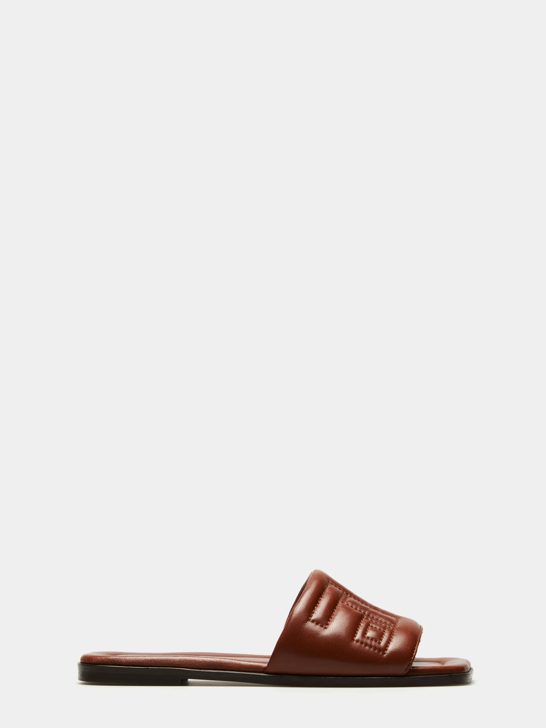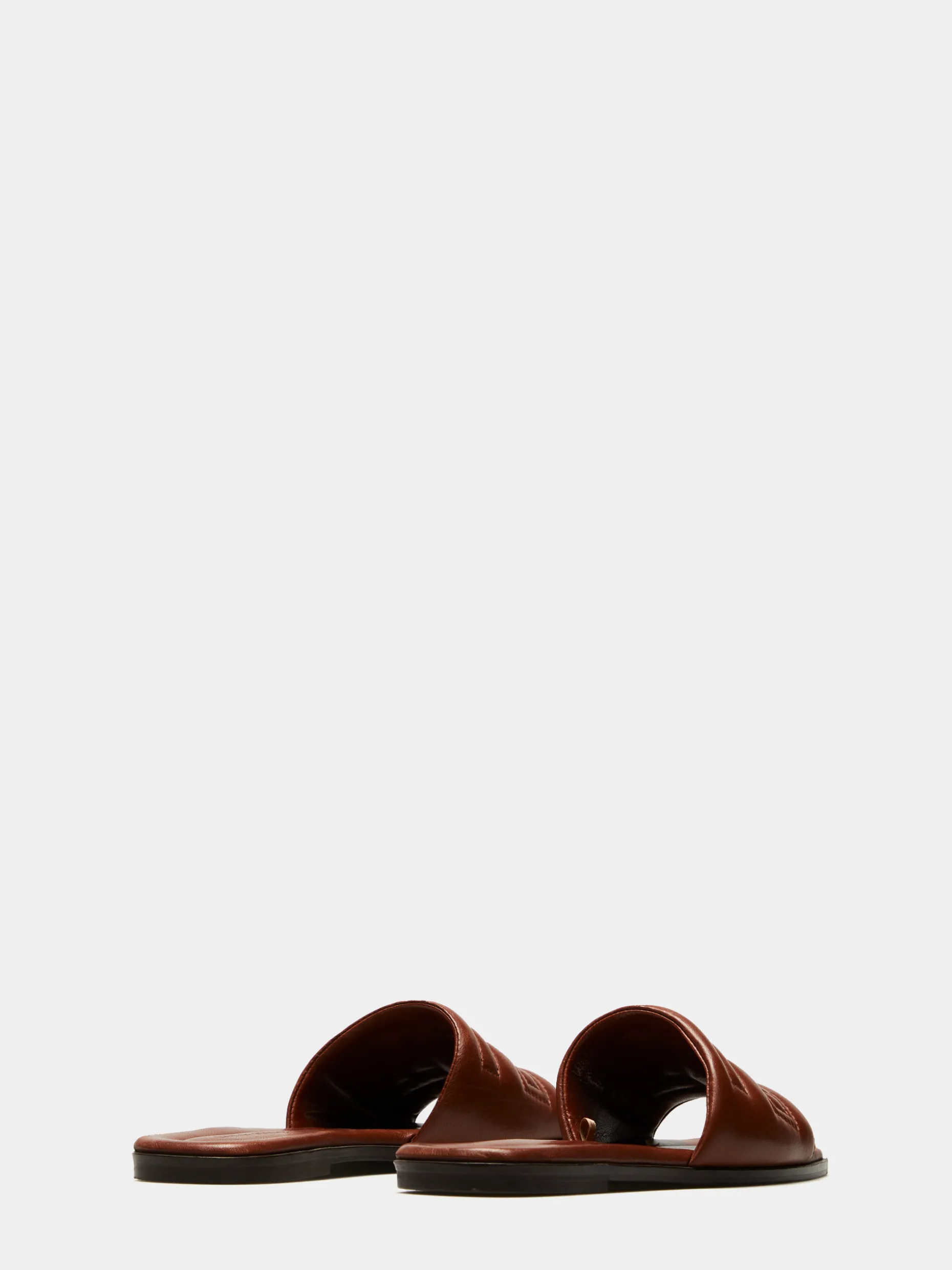 Sandália rasa acolchoada em pele, com pormenor de monograma pespontado ao tom para um toque diferenciador. Palmilhas também ligeiramente almofadadas que conferem maior conforto ao calçar. Biqueira quadrada.