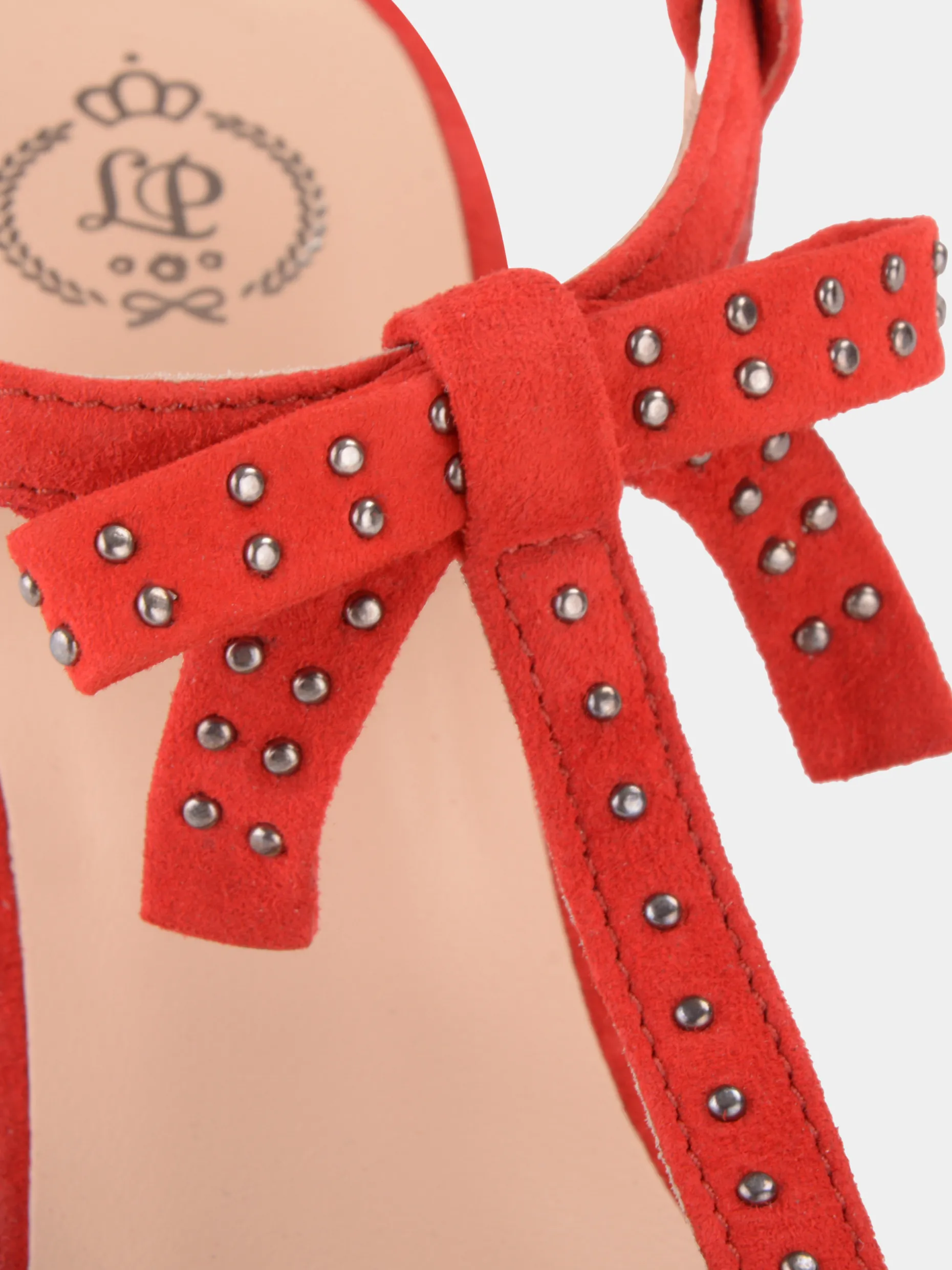 Um laço nos seus pés! Sandálias em camurça de salto reduzido com laço ao centro. Adornadas com pequenas tachas, apresentam uma tira ajustável no tornozelo