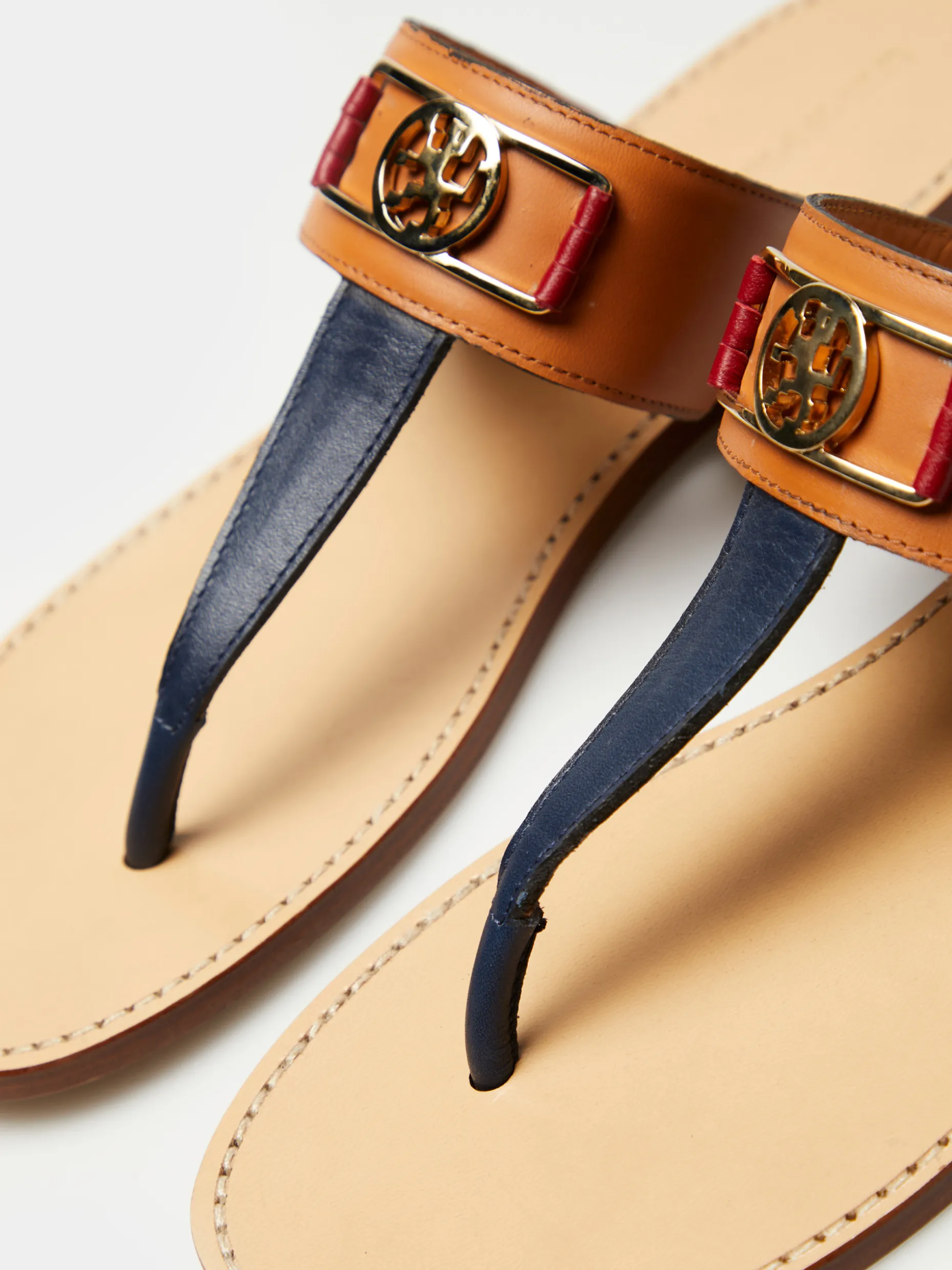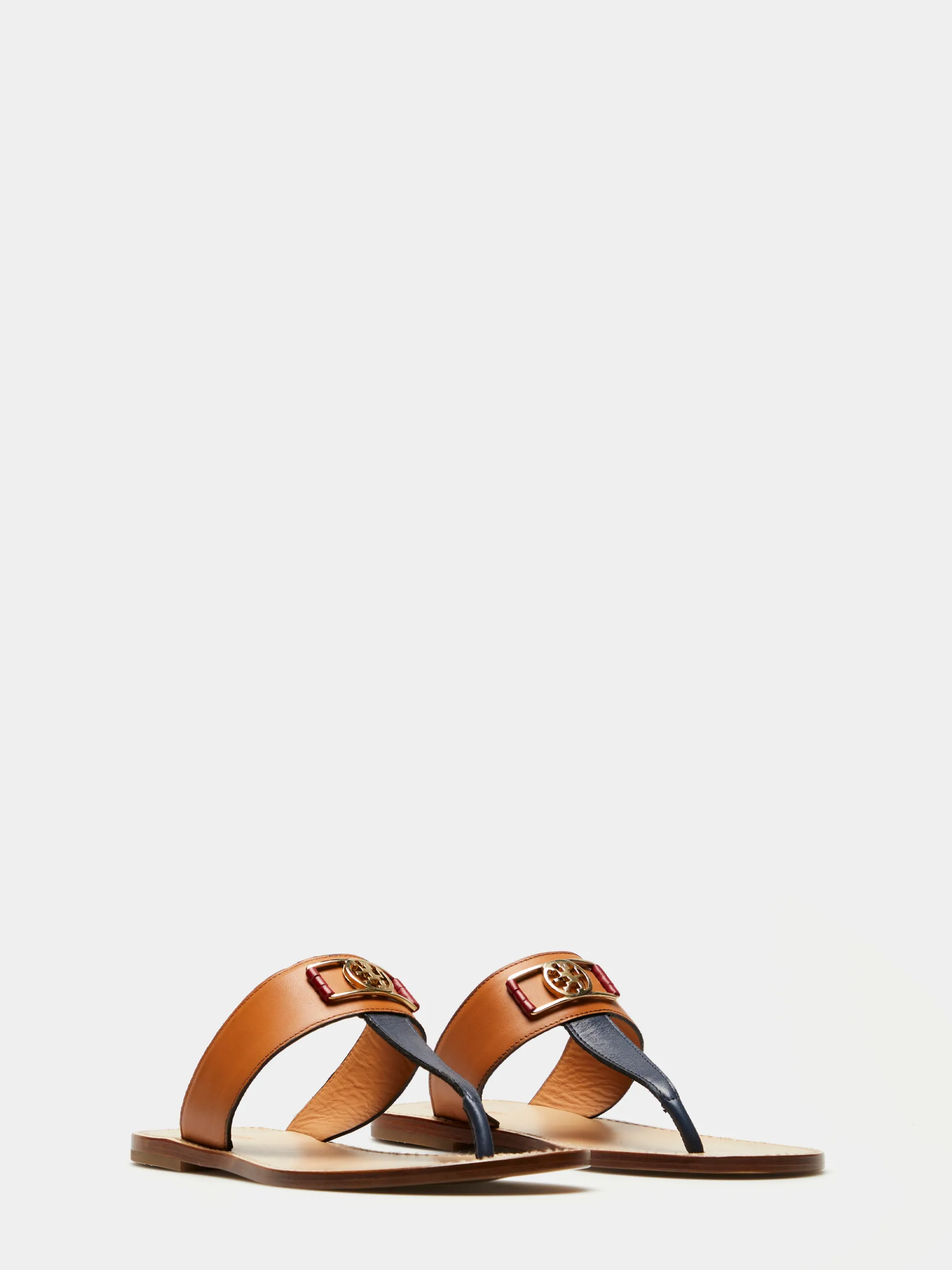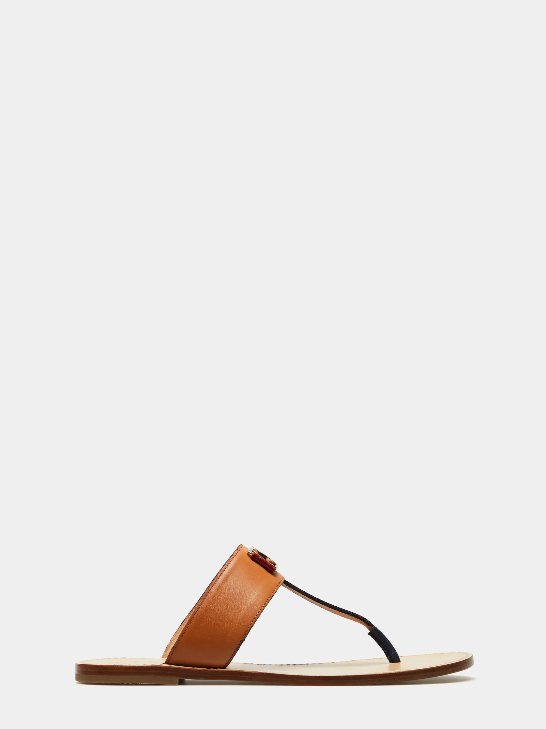 Sandálias de dedo rasas em pele com biqueira redonda. Fivela camel no peito do pé com aplique dourado com leão da marca.
