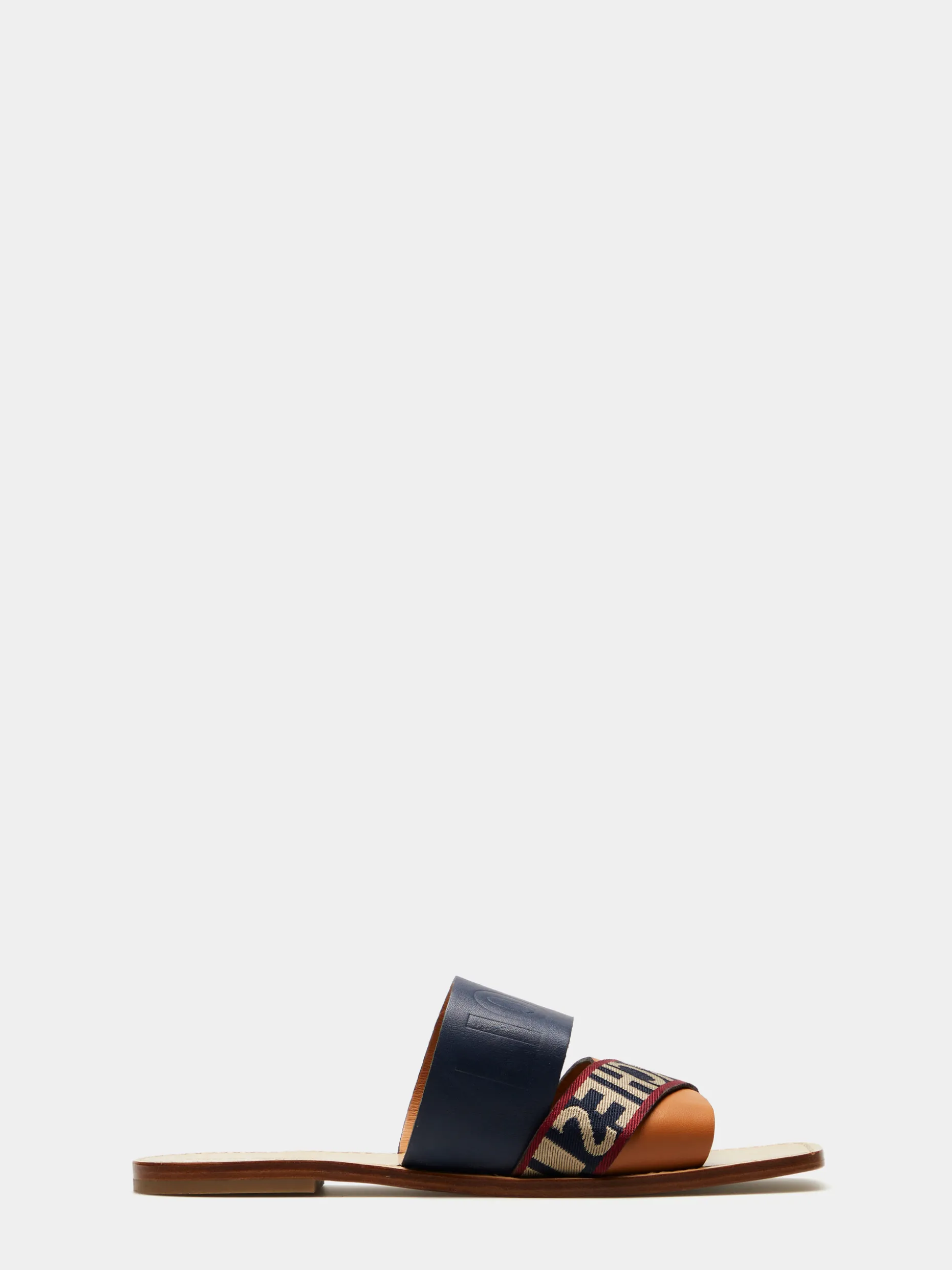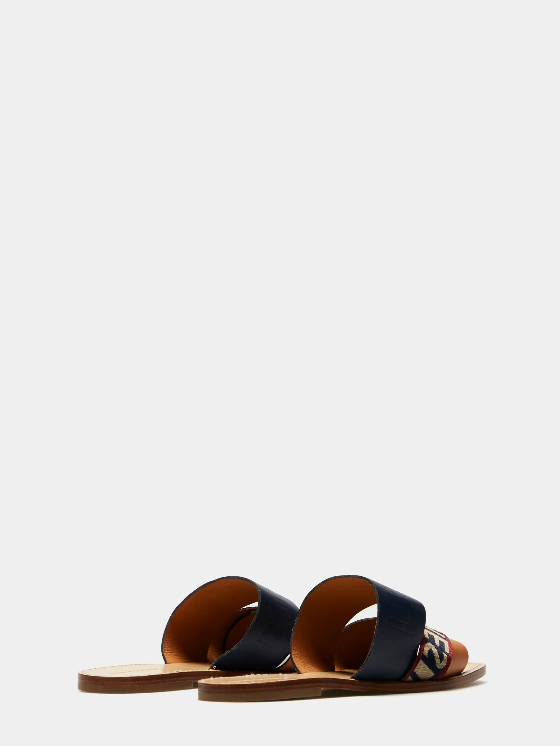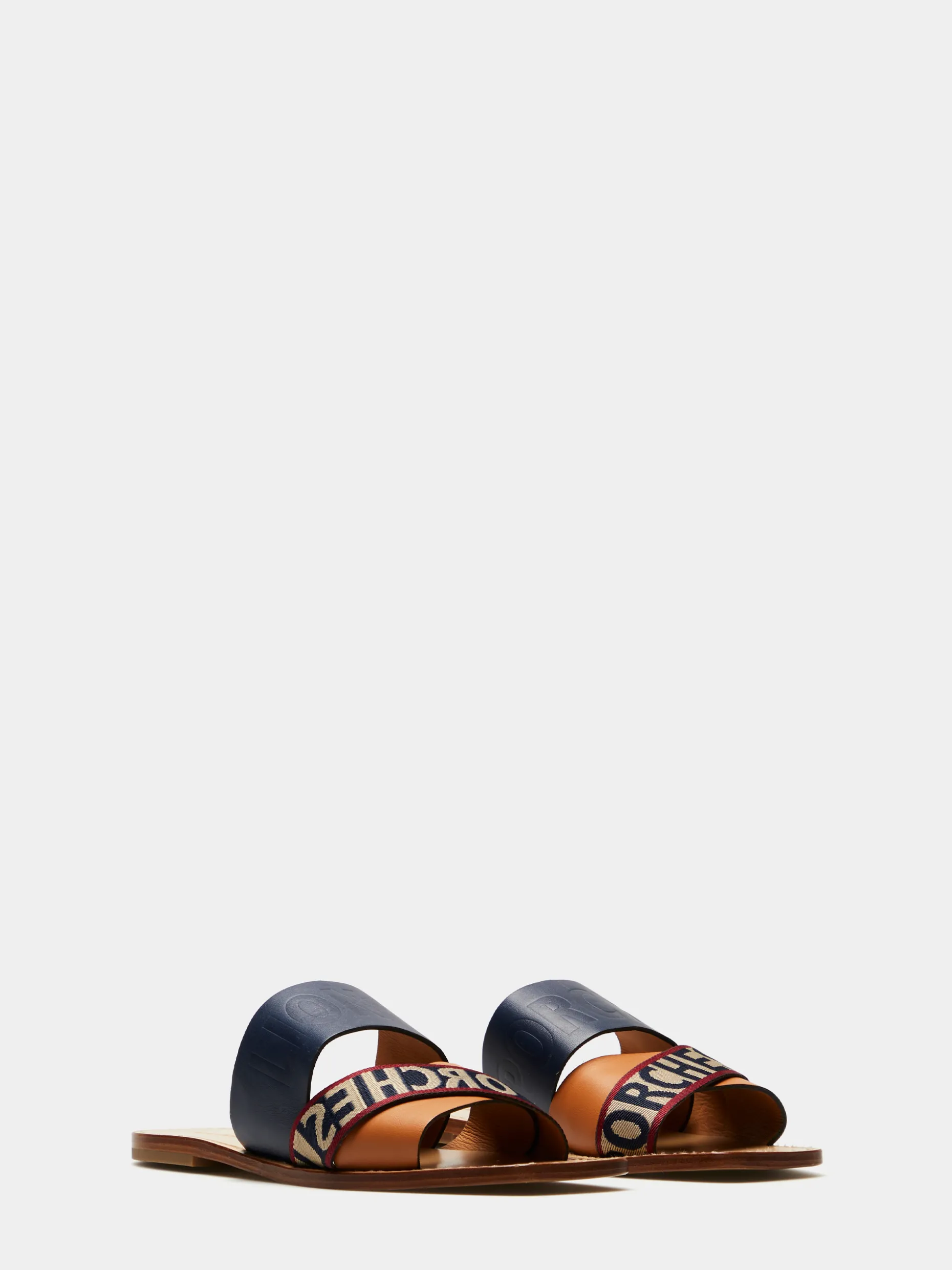 Sandálias rasas de pele cruzada. Tiras grossas, no peito do pé, com branding Lion of Porches em contraste. A biqueira é quadrada.