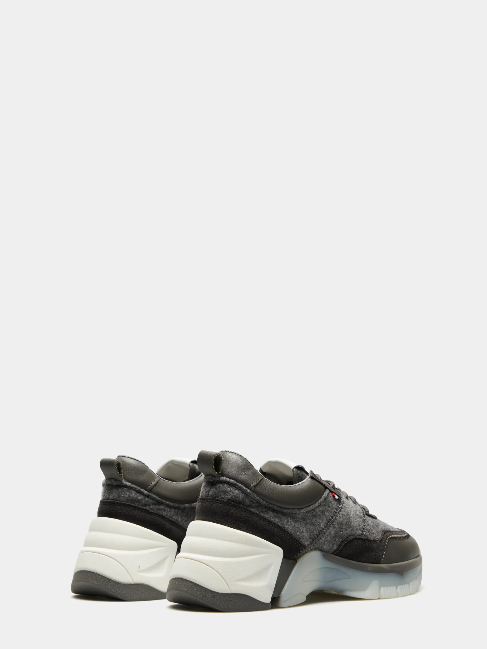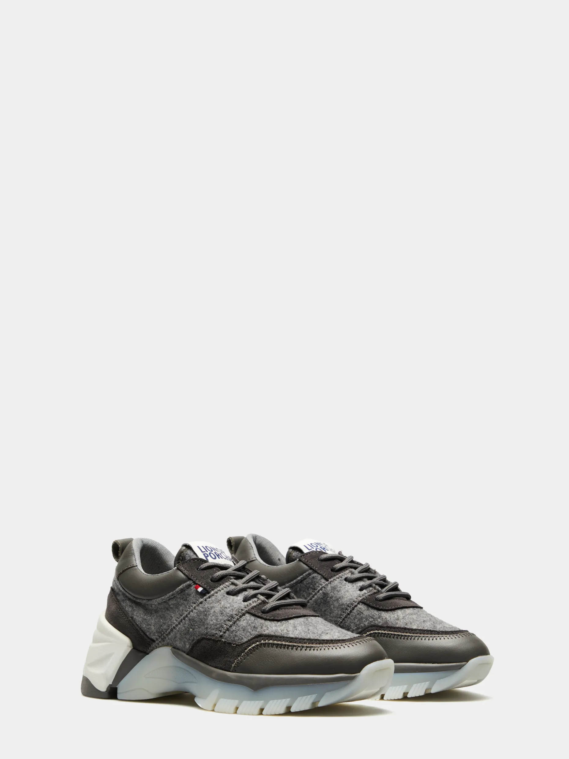 Sapatilha desportiva feita em pele e feltro com cordões cinzentos. Forro natural de coelho, detalhes corporativos e sola irregular translúcida e branca.