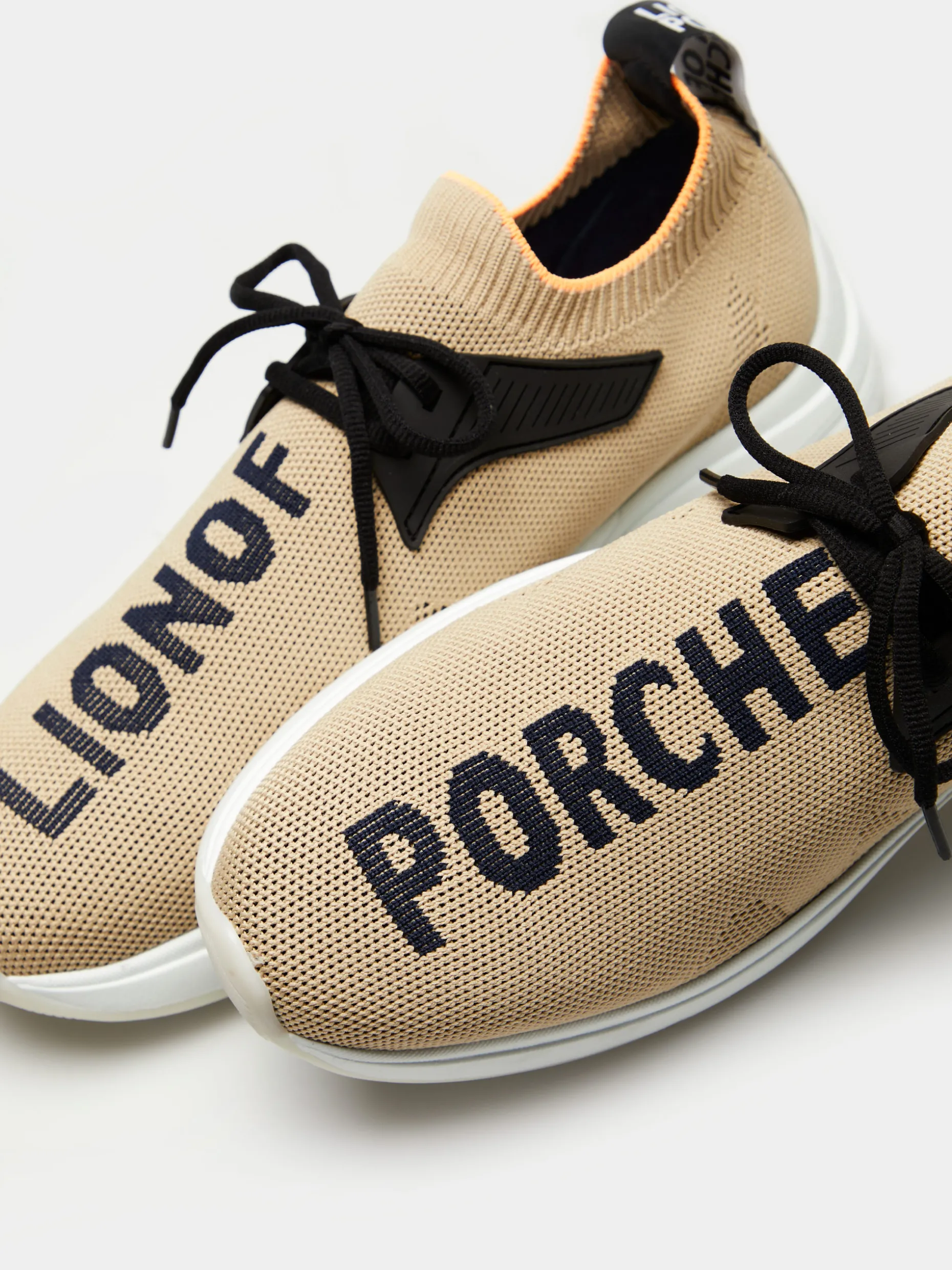 Sapatilha de malha com logotipo Lion of Porches ao longo do peito do pé. Etiqueta da marca tecida na parte de trás. Peça de borracha para atacadores. Sola de borracha assimétrica branca. Biqueira redonda.