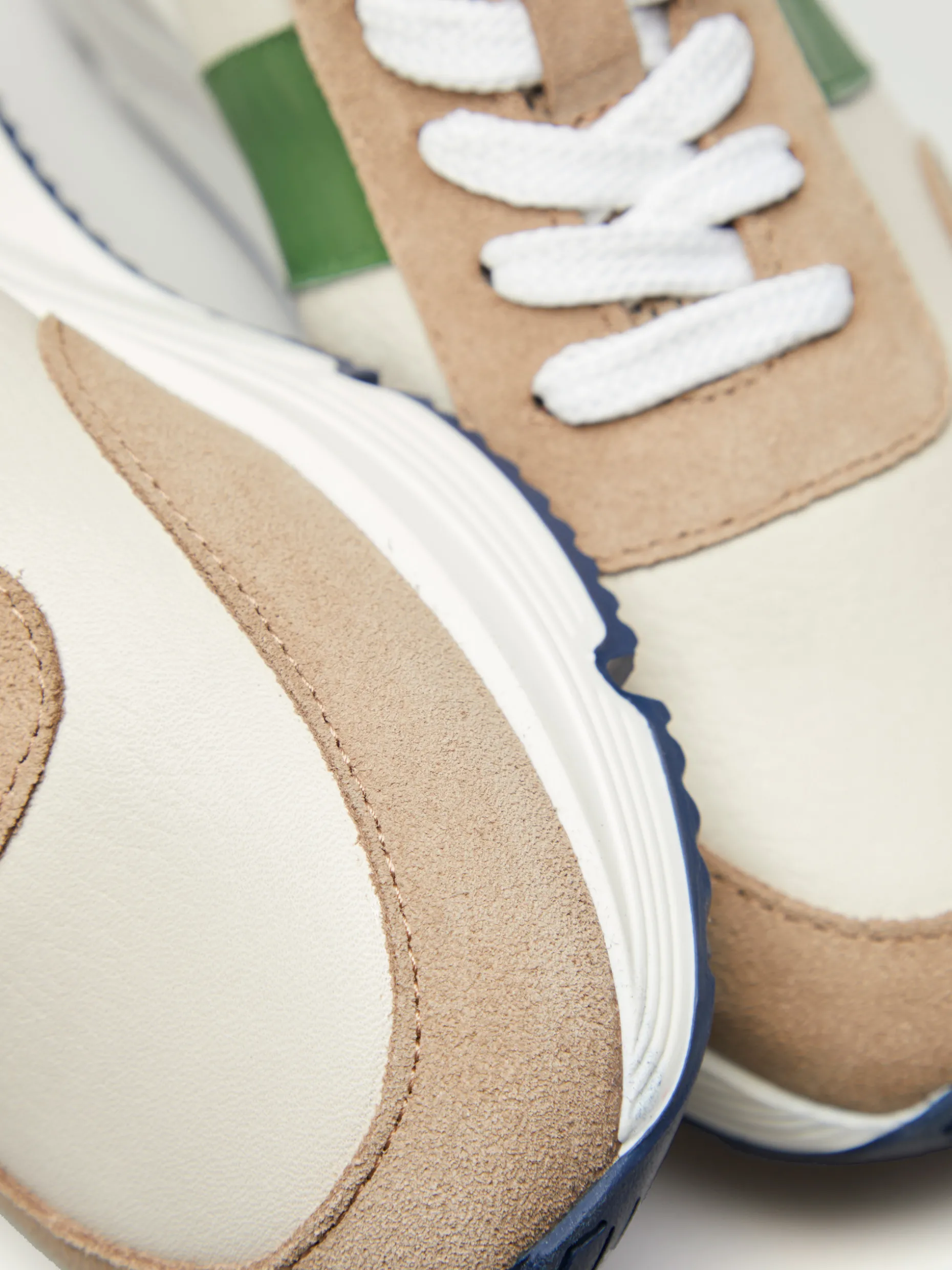 Sapatilha multicolor em pele e camurça. Branding Lion of Porches estampado em contraste na língua e atrás no calcanhar. Sola de borracha assimétrica.