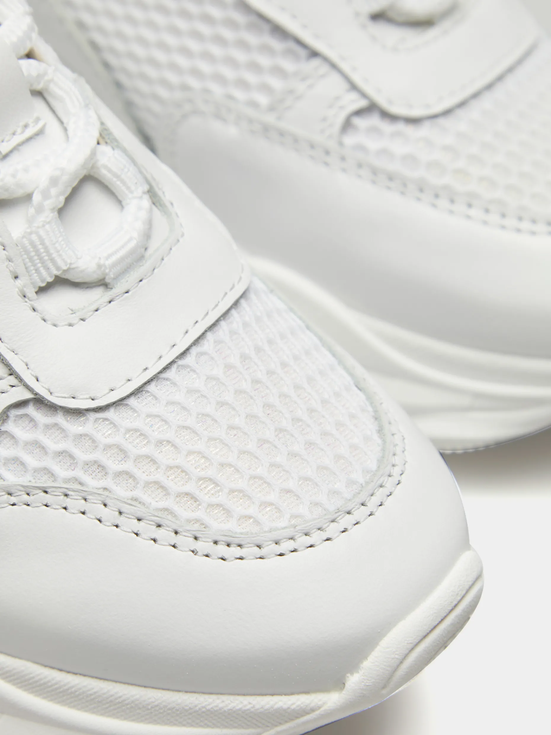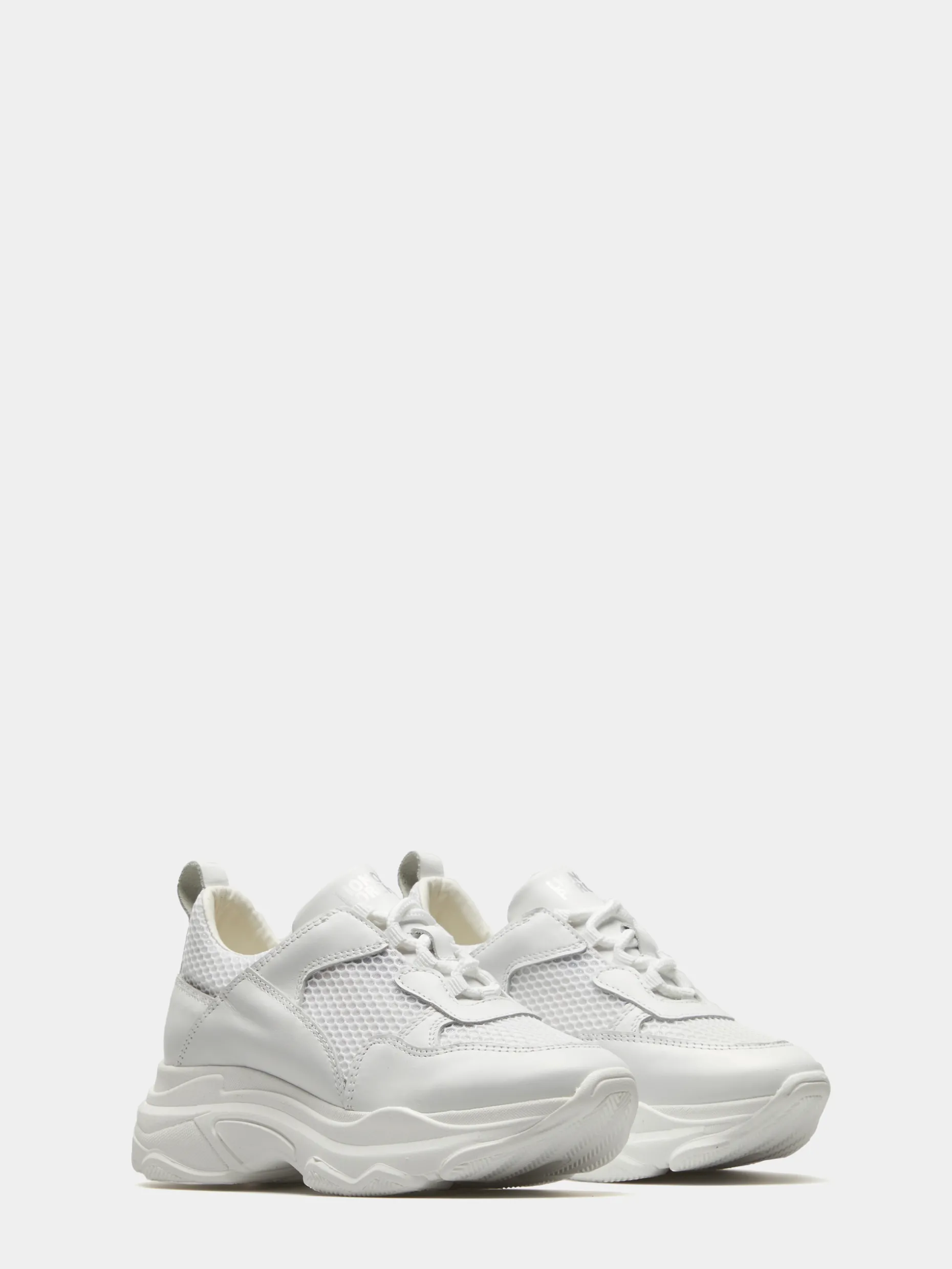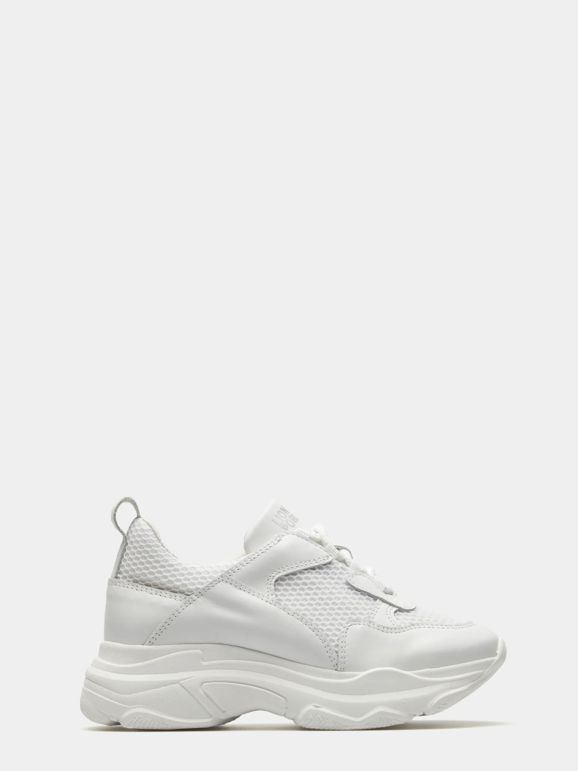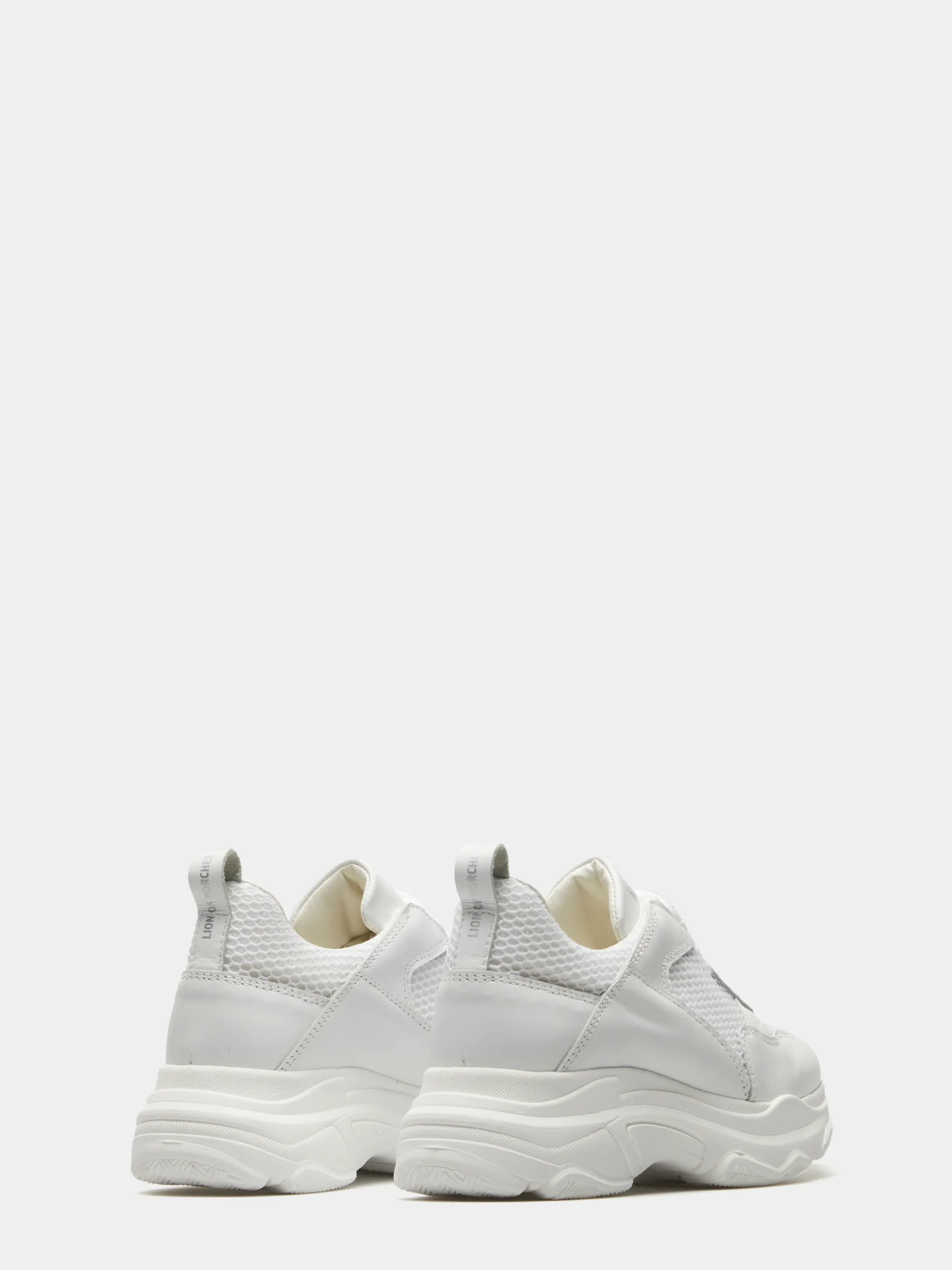 Sapatilha branca em pele com rede. Branding Lion of Porches estampado em contraste na língua e atrás no calcanhar. Sola de borracha assimétrica.
