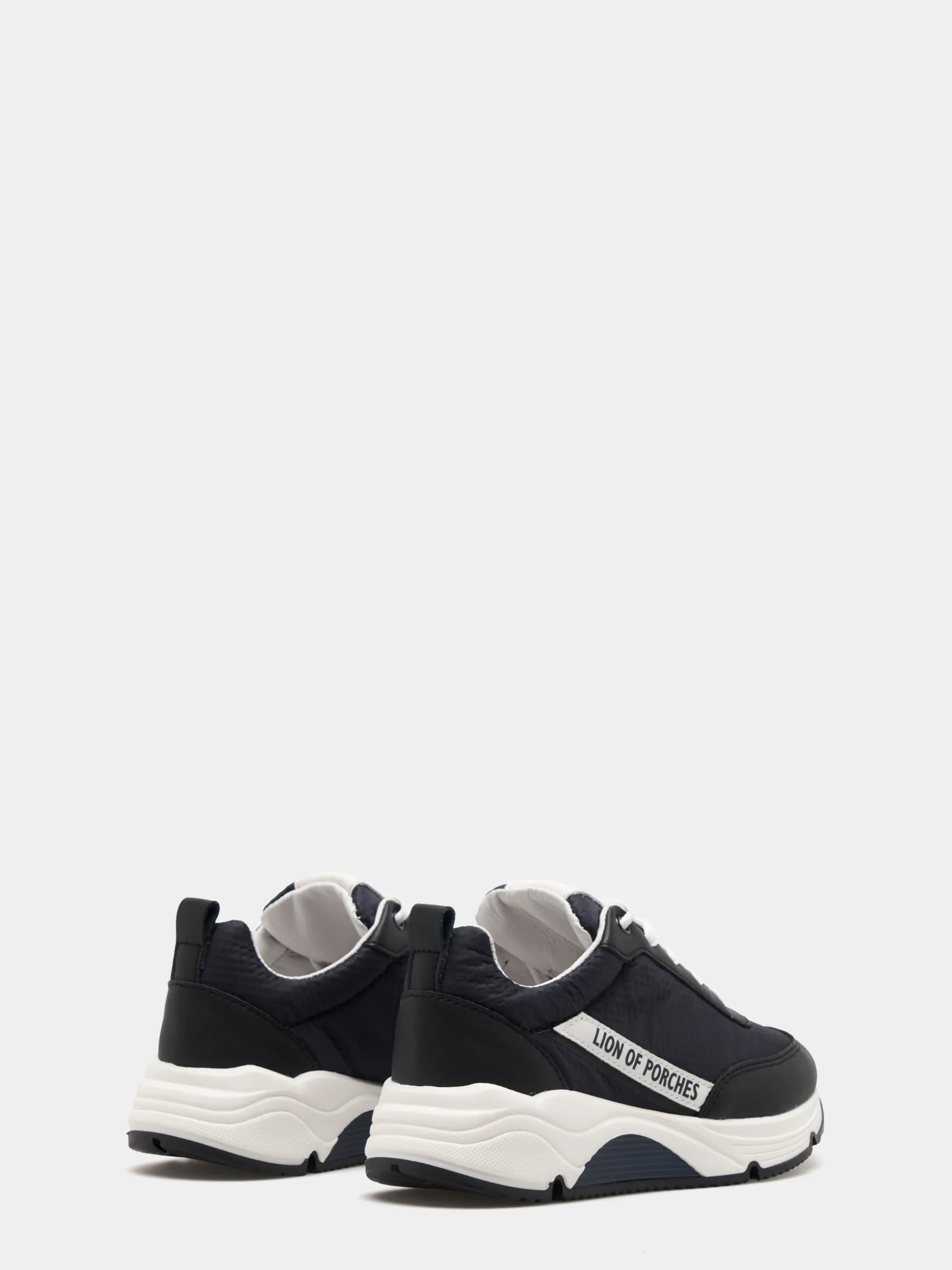 Sapatilhas bicolor combinadas em dois tons de azul. Apertam com cordões brancos em contraste de cor, tal como a sola. Logotipo da marca em contraste na lateral e na língua.
