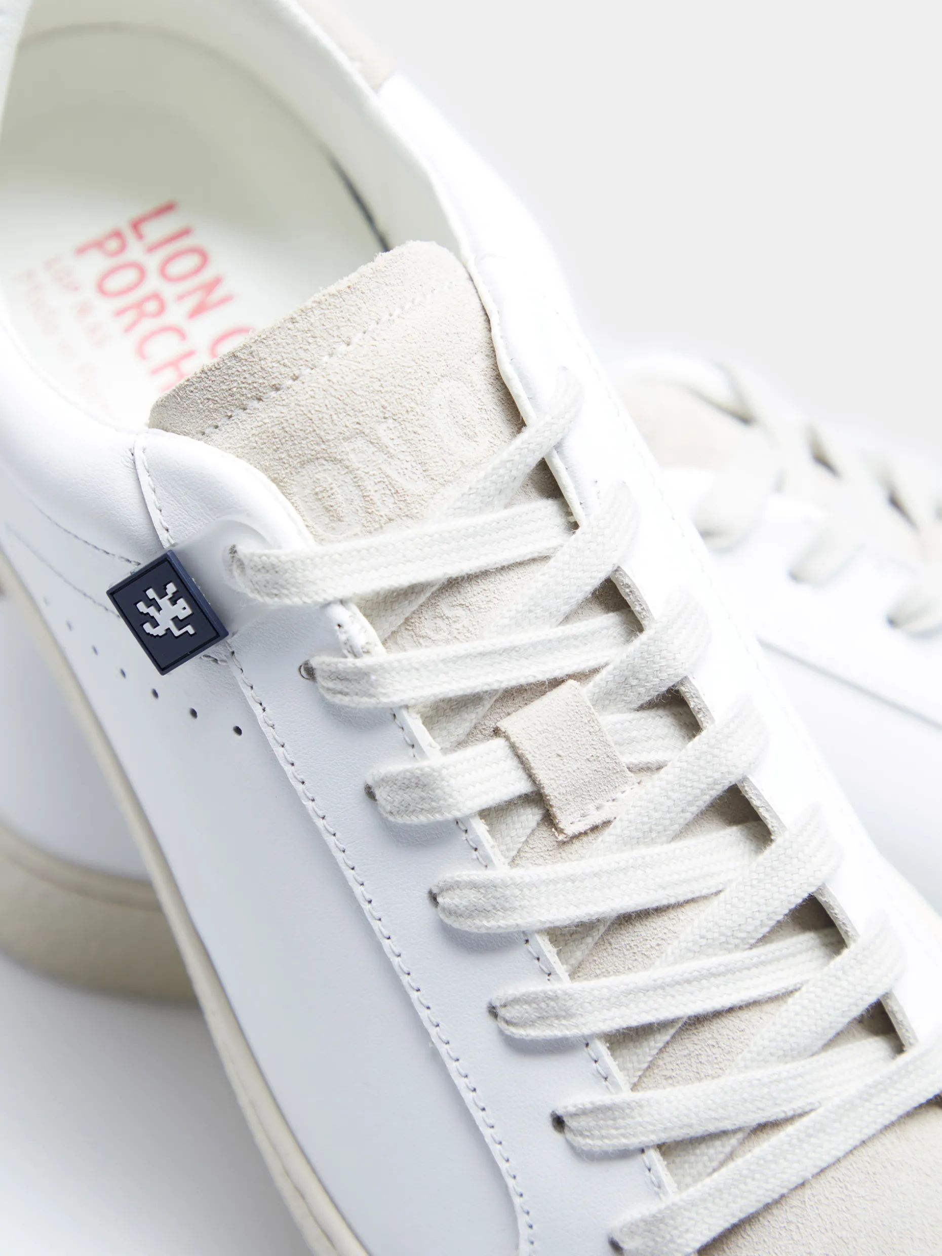 Sapatilha clássica em pele branca e camurça bege com sola de borracha texturada. Logotipo estampado em serigrafia na parte de trás. Detalhes corporativos aplicados. Feito em Portugal.