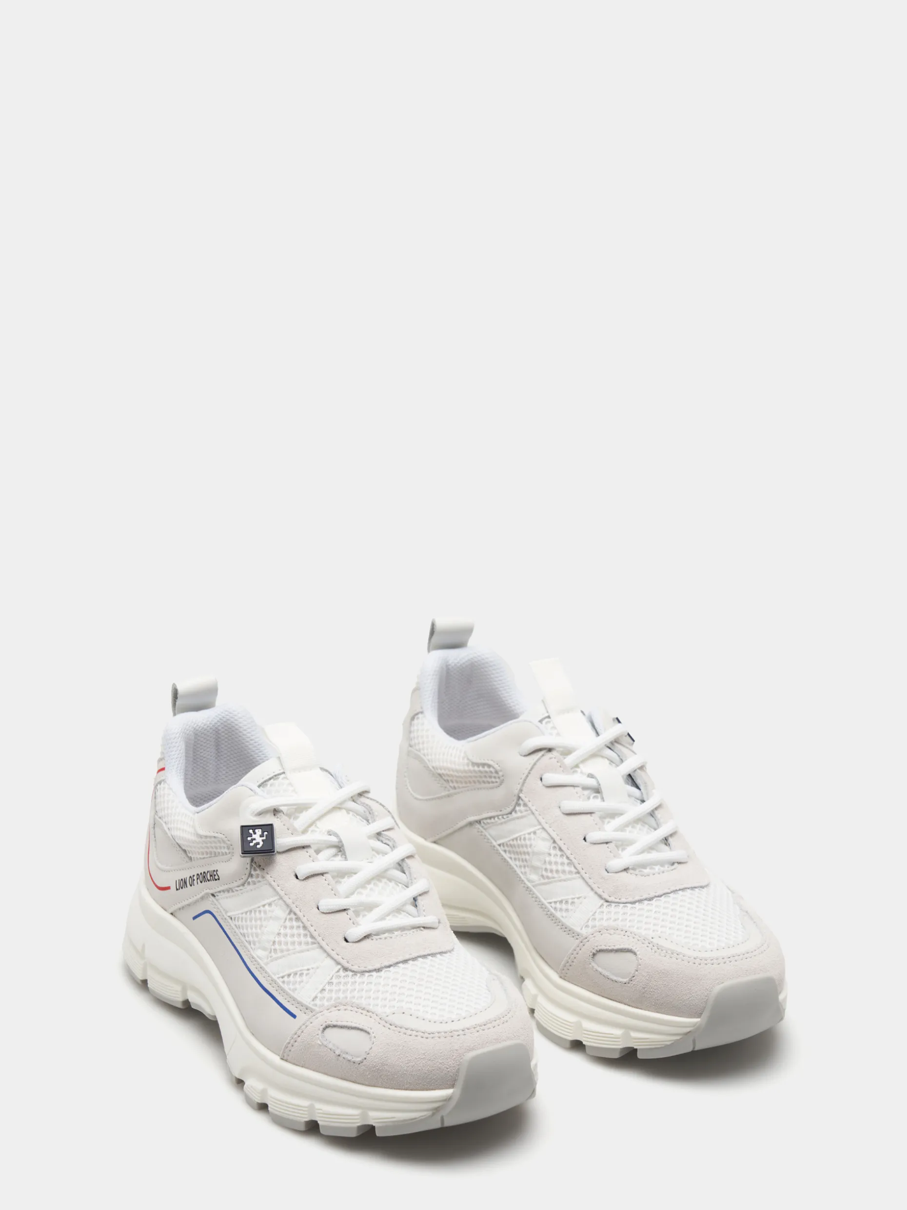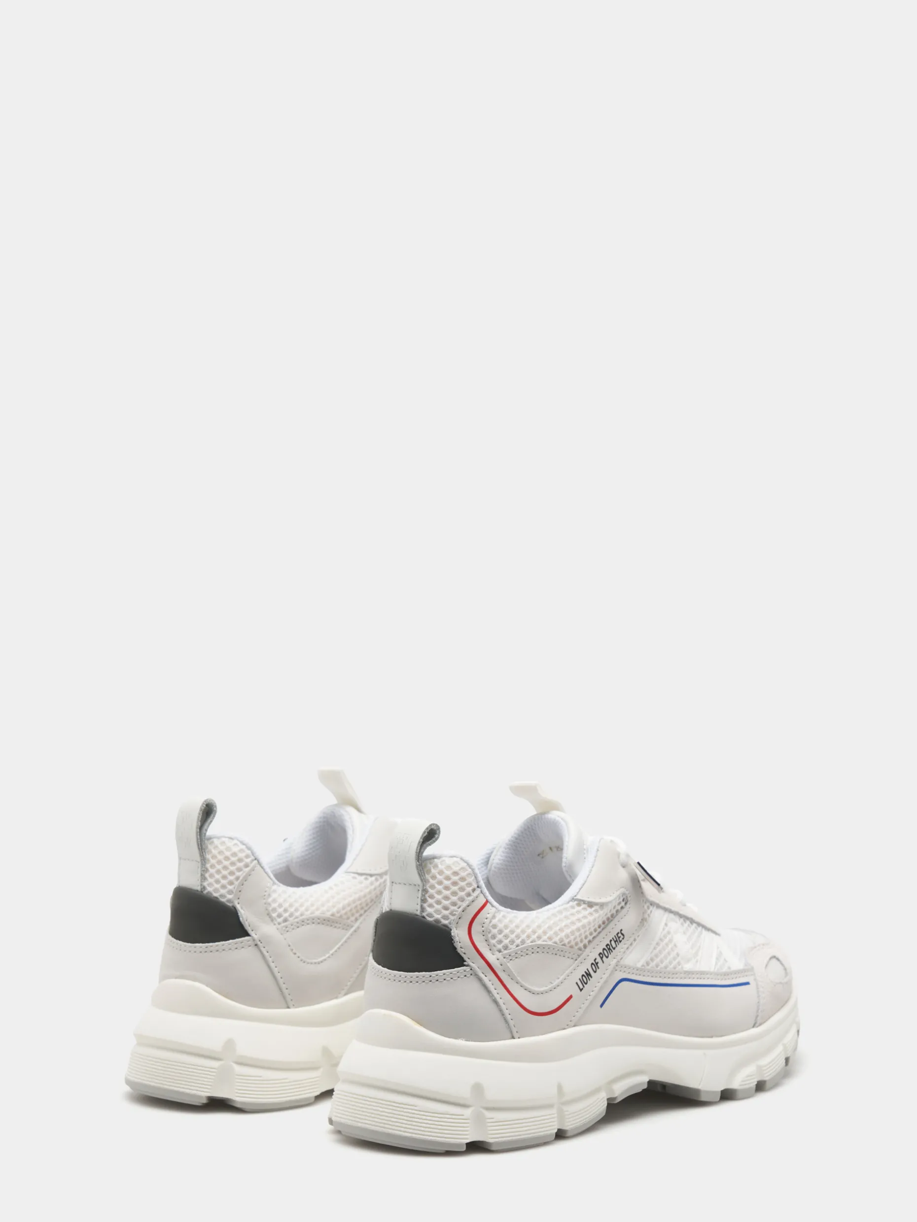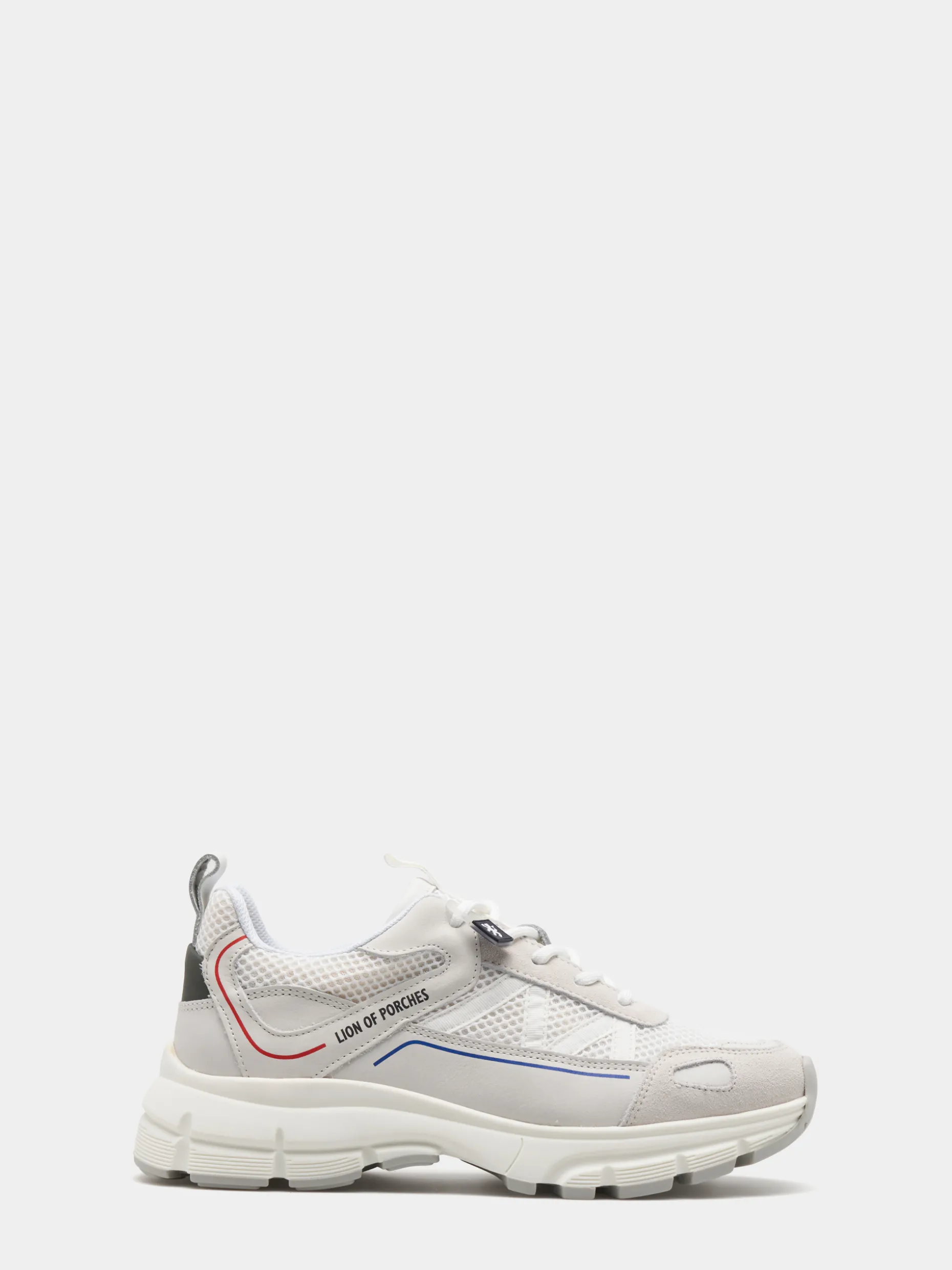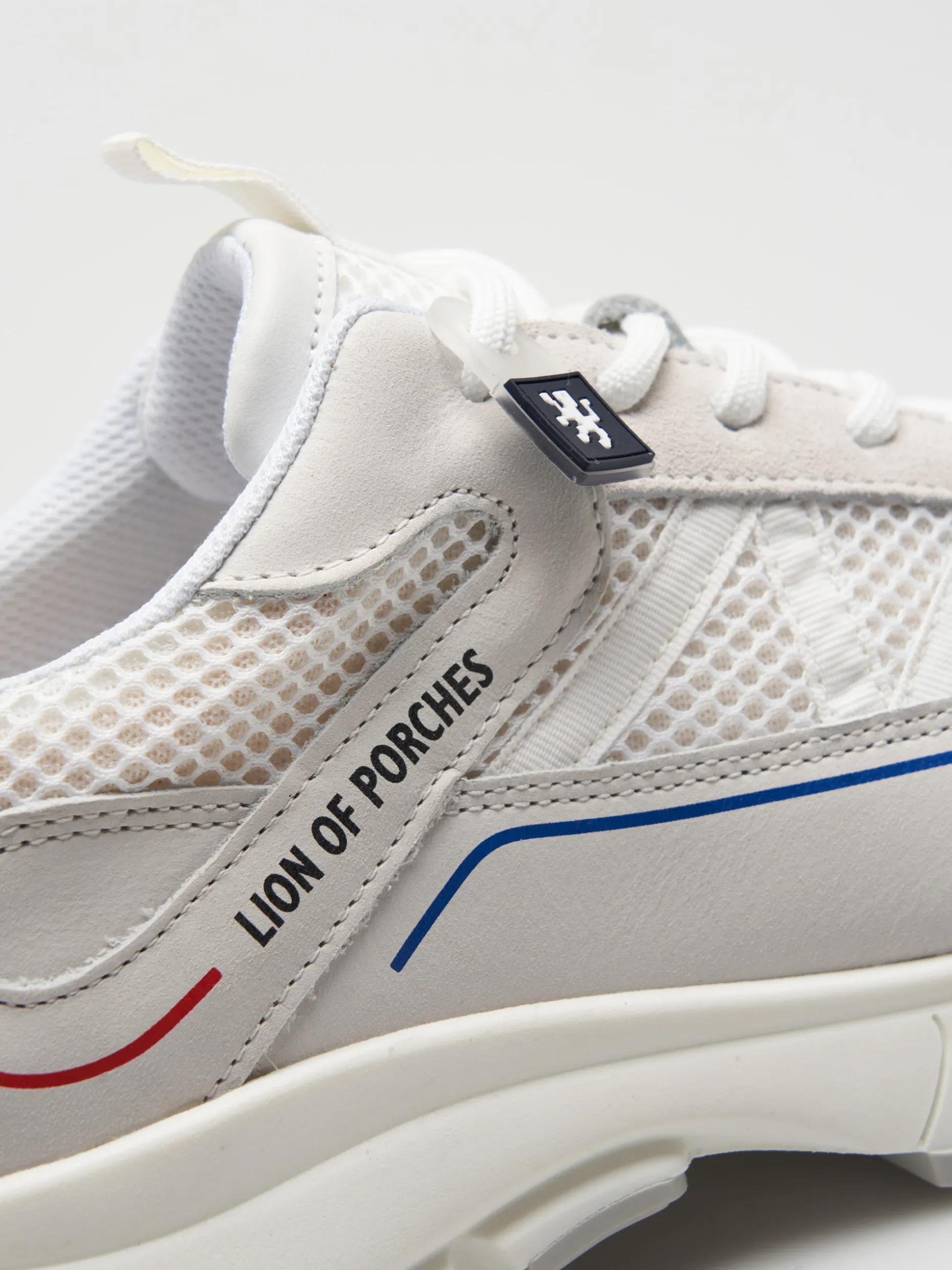 Sapatilhas desportivas em pele, com malha transpirável e outros materiais técnicos. A base é branca, com alguns detalhes a azul e vermelho branding Lion of Porches gravado a cunho na lateral. Sola branca com base a cinza e cordões brancos.