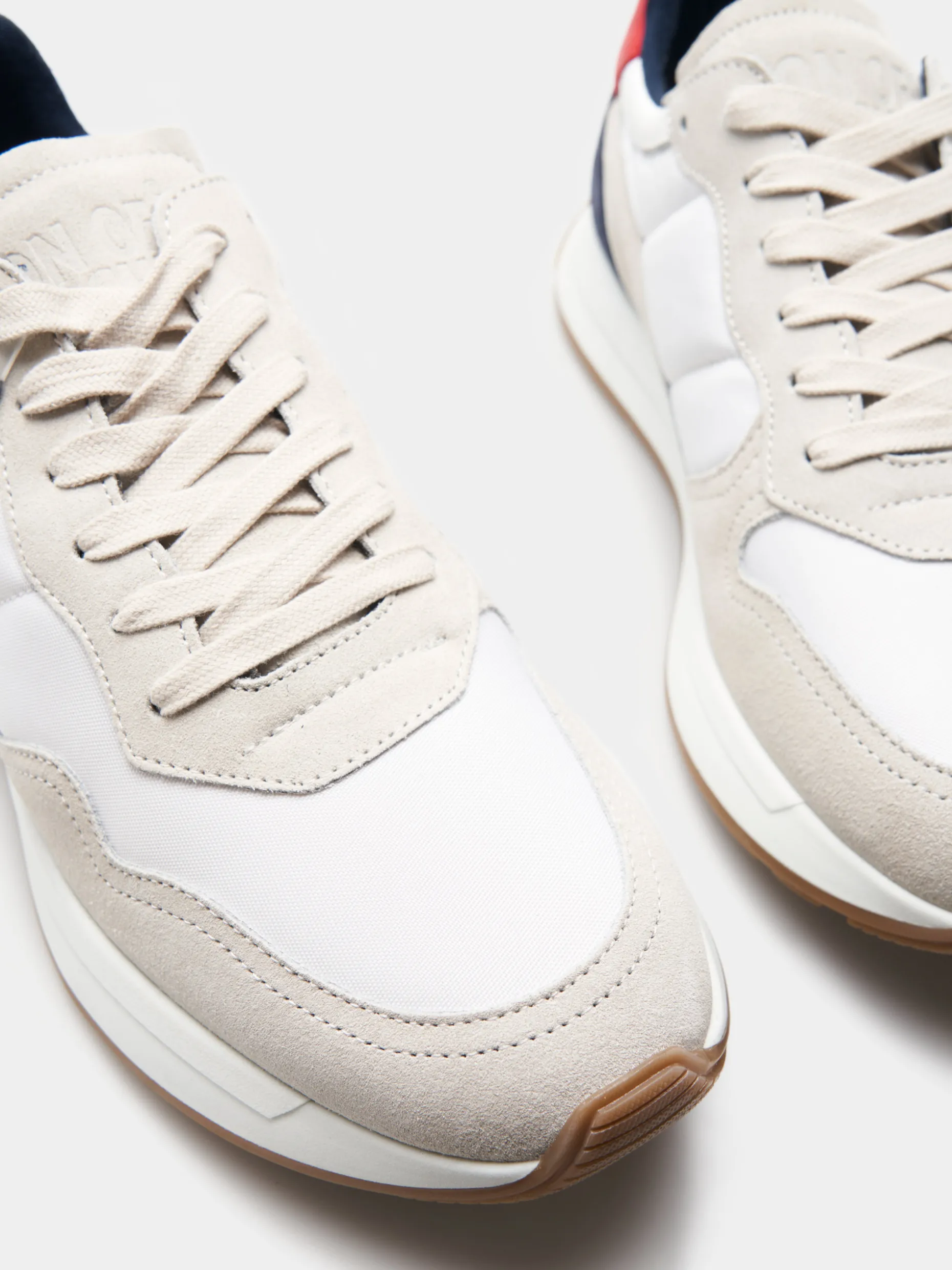 Sapatilhas desportivas combinadas em camurça, nylon e detalhes em pele. Com cordões e parte de trás em contraste de cor com logotipo Lion of Porches no calcanhar. Sola dentada de dois tons.