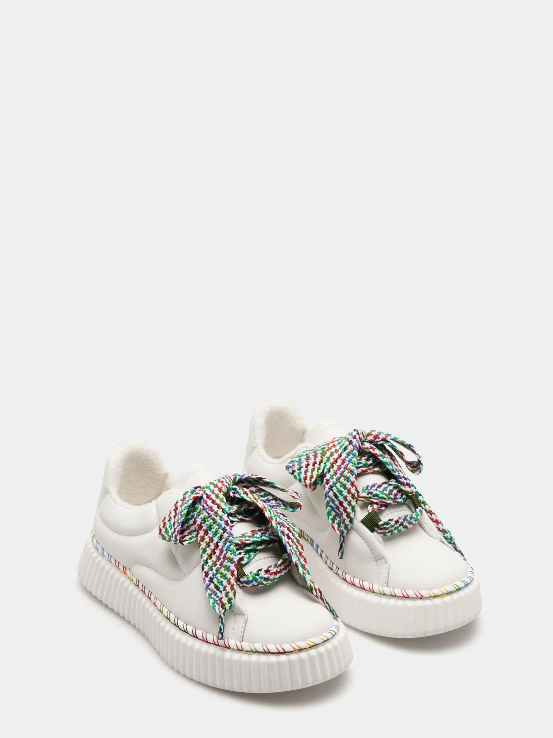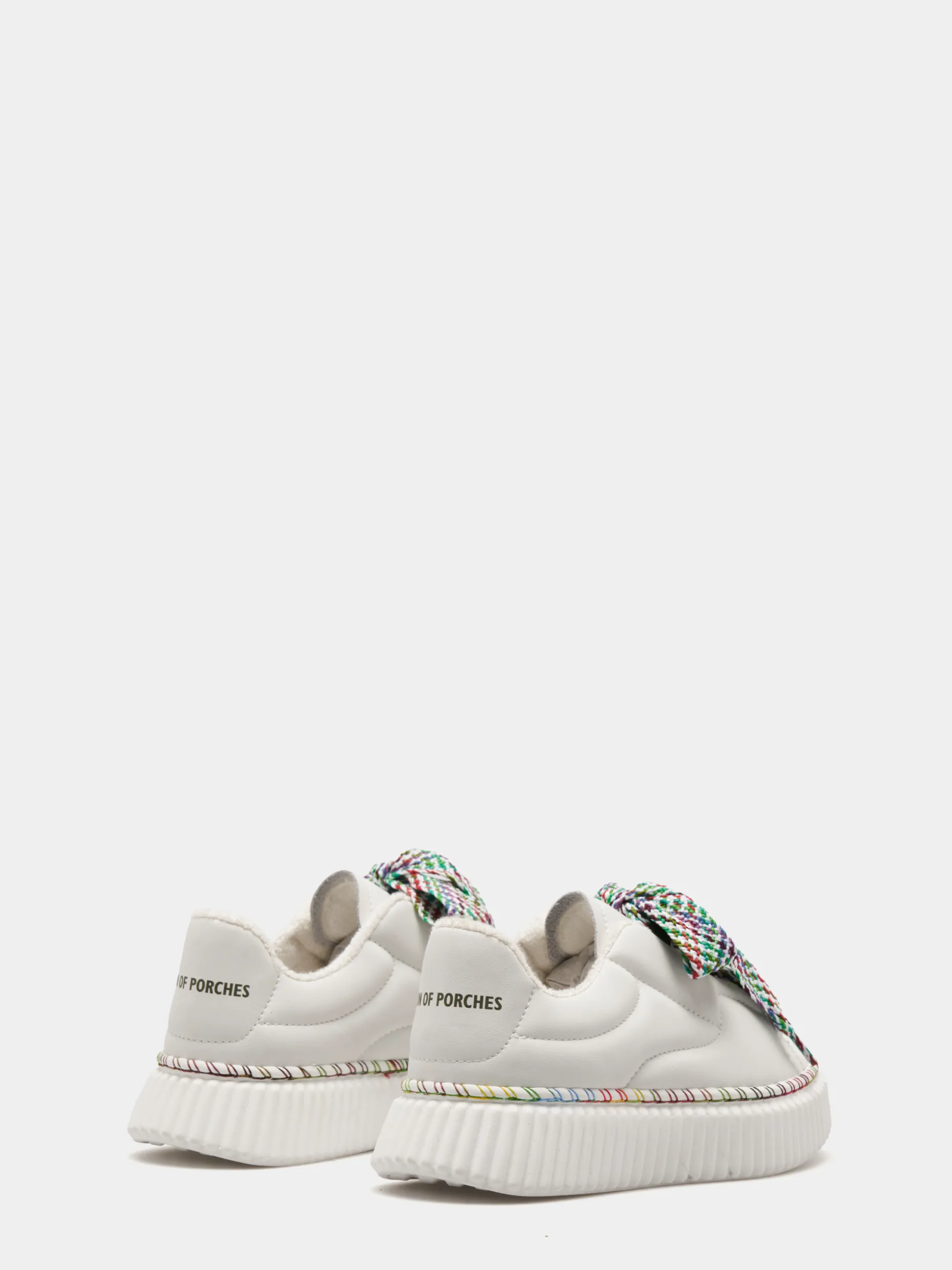 Sapatilhas elegantes em pele, brancas, com pormenor divertido de várias cores na sola. Os cordões são também multicolor. Finalizam com estampado Lion of Porches em contraste no calcanhar.