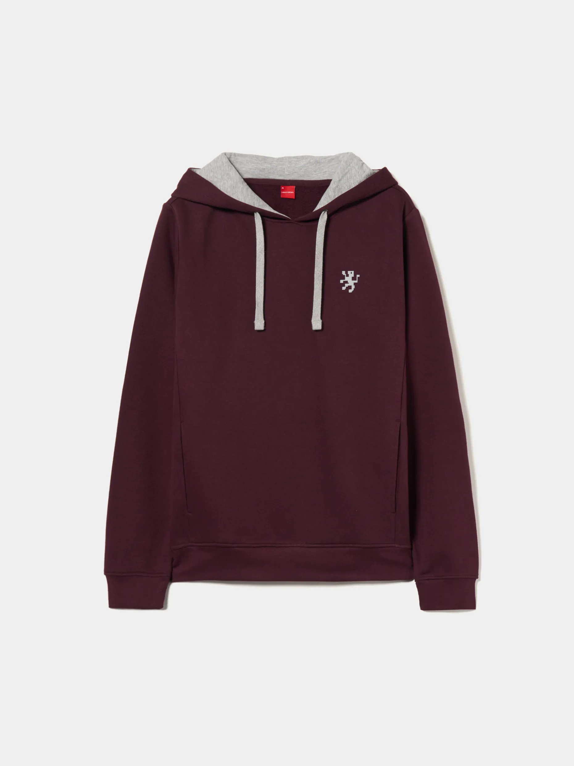 Sweater de manga comprida com capuz ajustável. De cor lisa, à exceção do leão da marca no peito, assim como o interior do capuz e o cordão que são em contraste de cor.