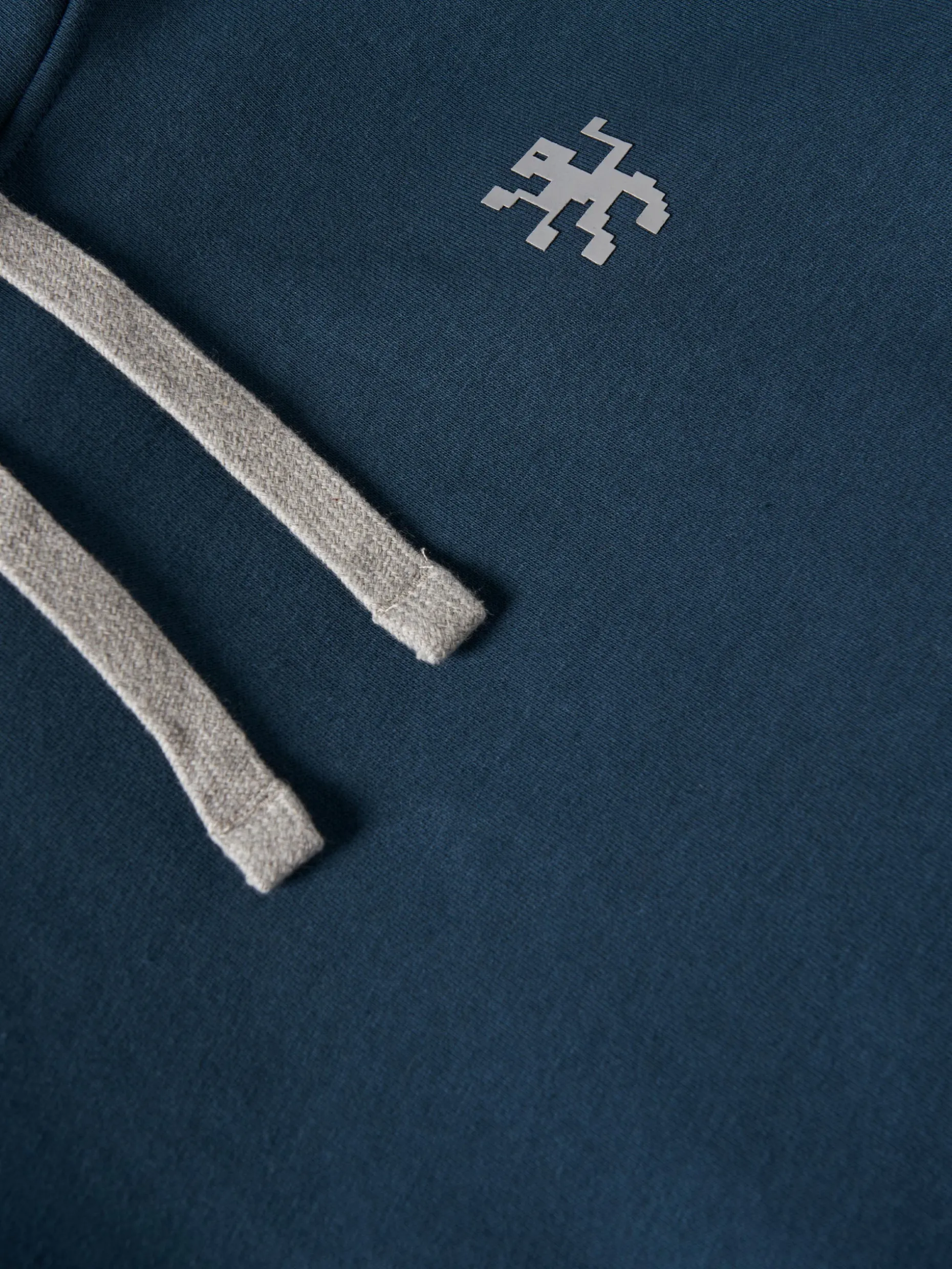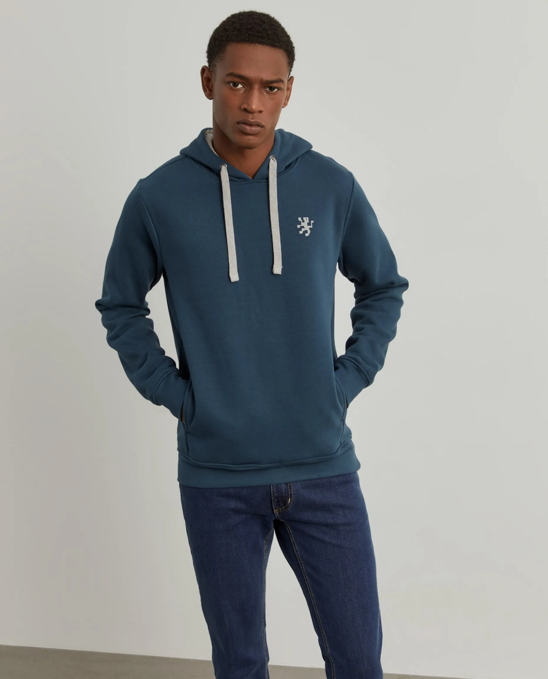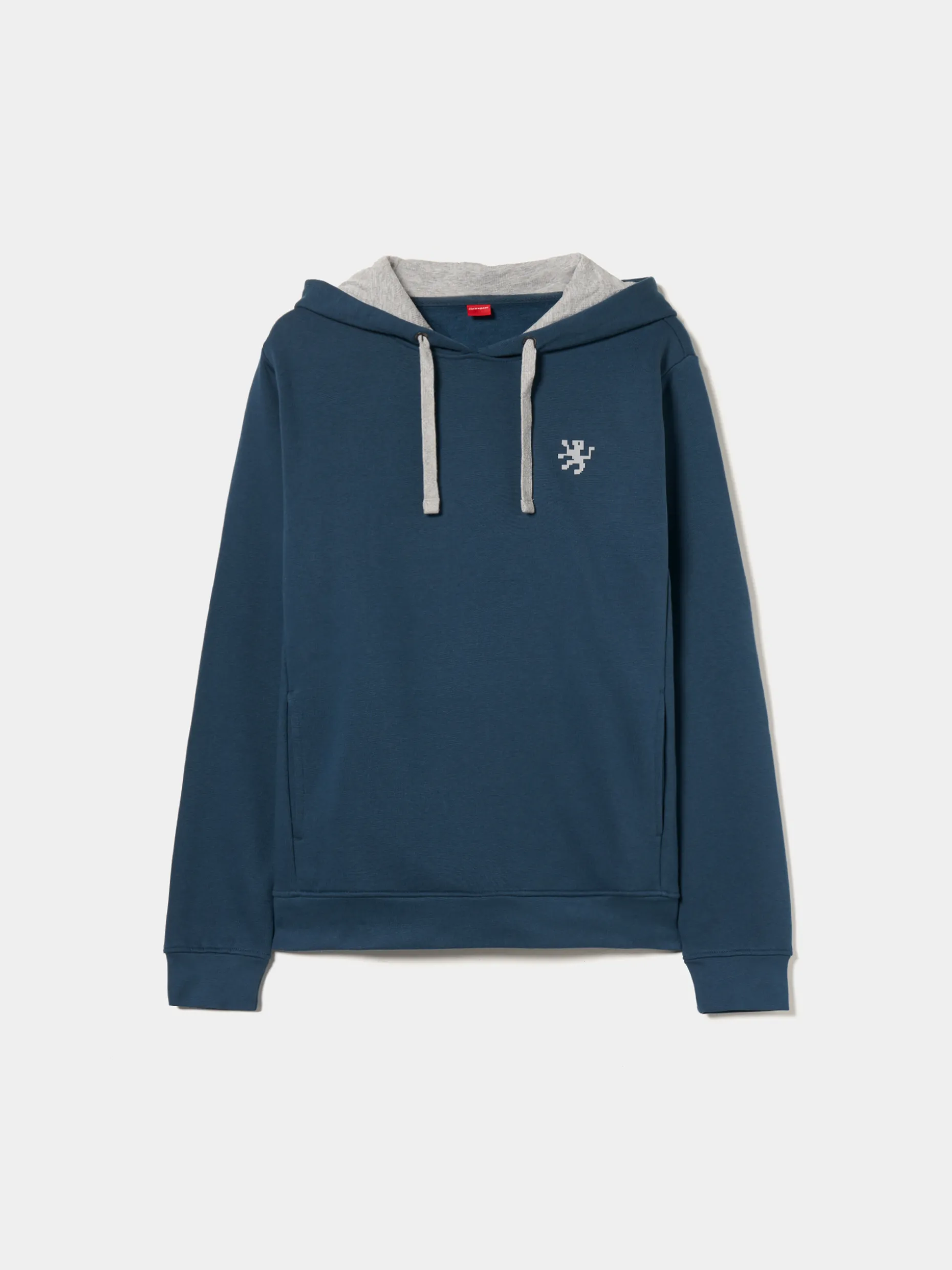 Sweater de manga comprida com capuz ajustável. De cor lisa, à exceção do leão da marca no peito, assim como o interior do capuz e o cordão que são em contraste de cor.