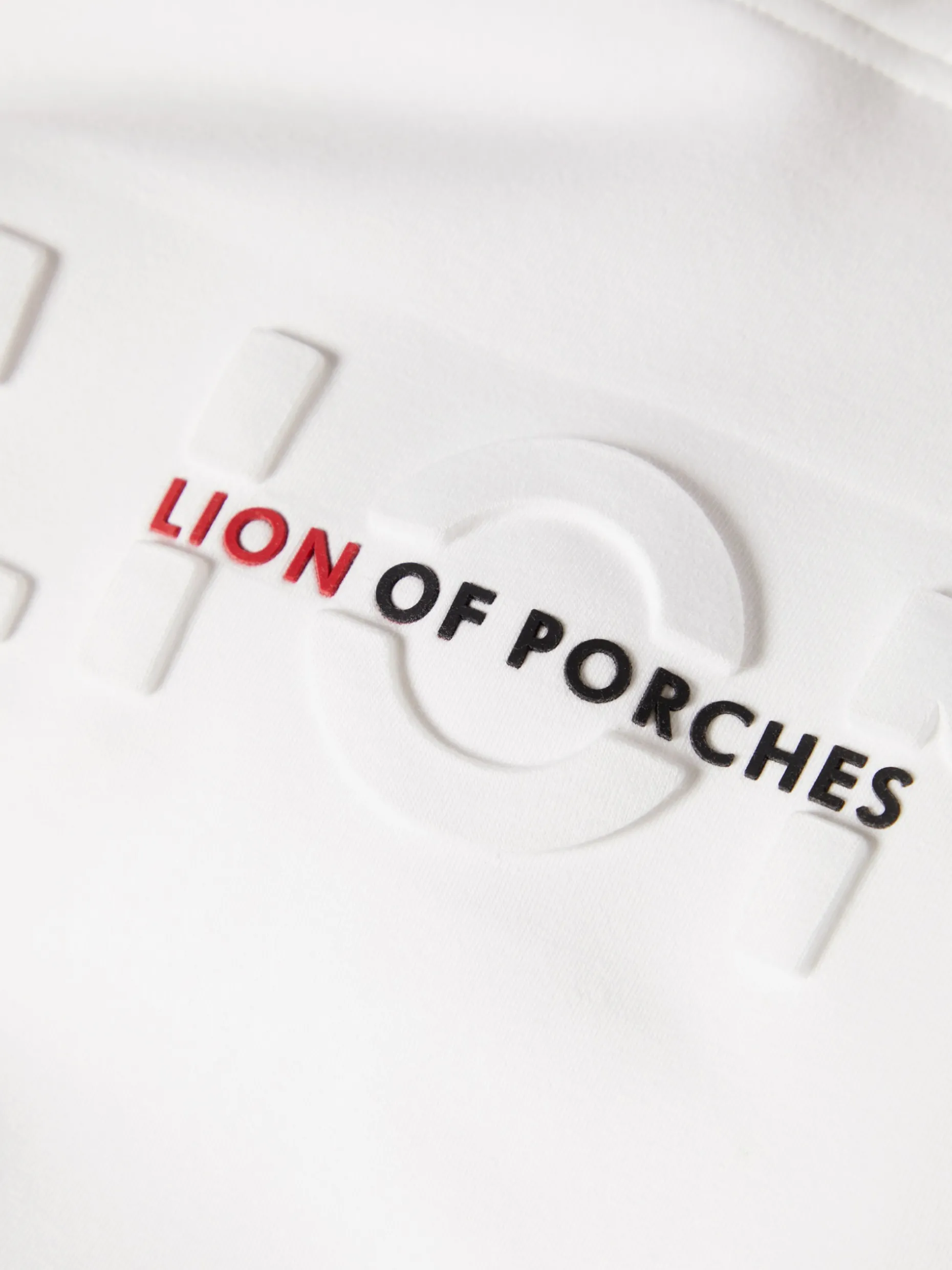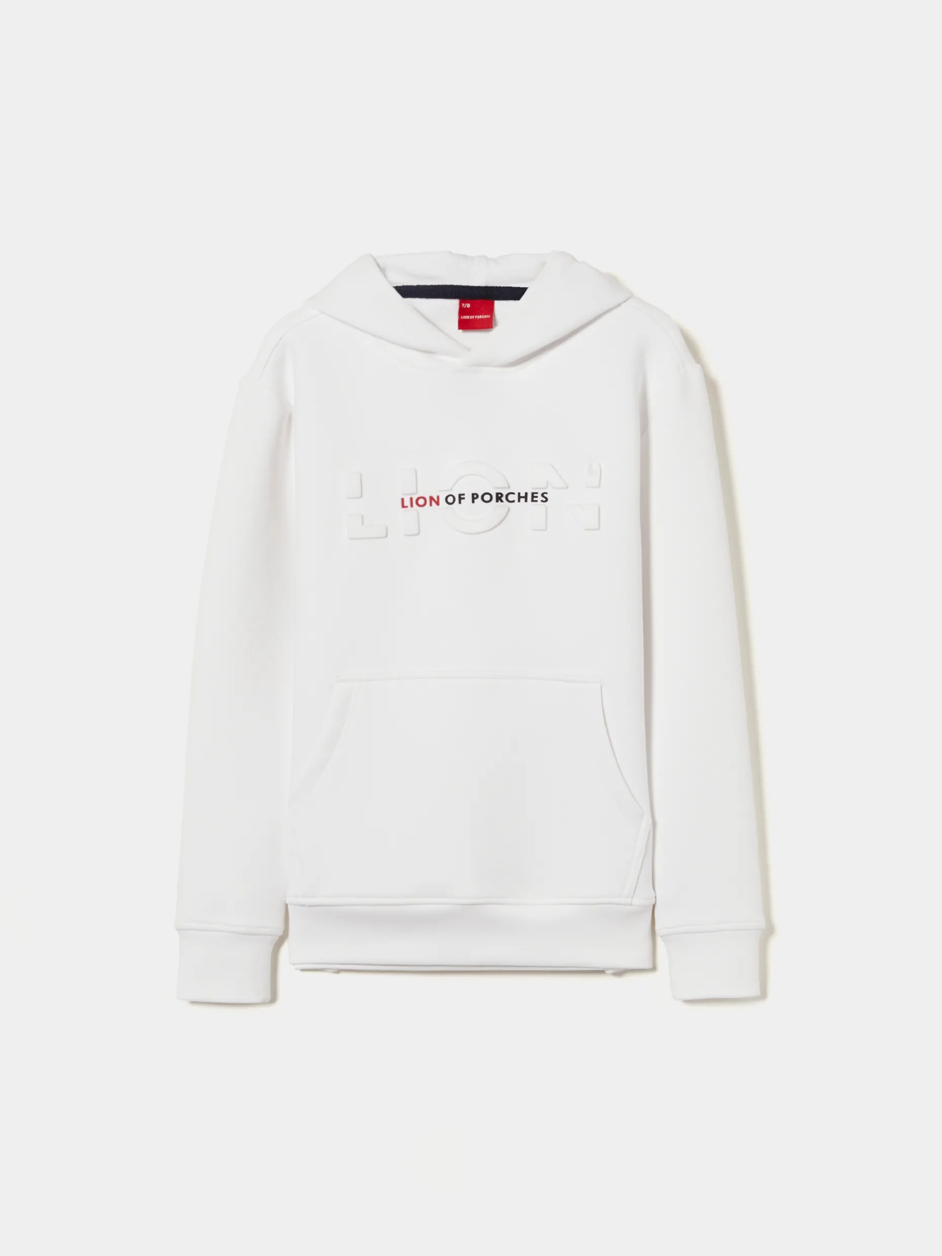 Sweater de manga comprida, cor lisa, com capuz. Pormenor de logotipo em relevo e estampado no peito. Bolso canguru.