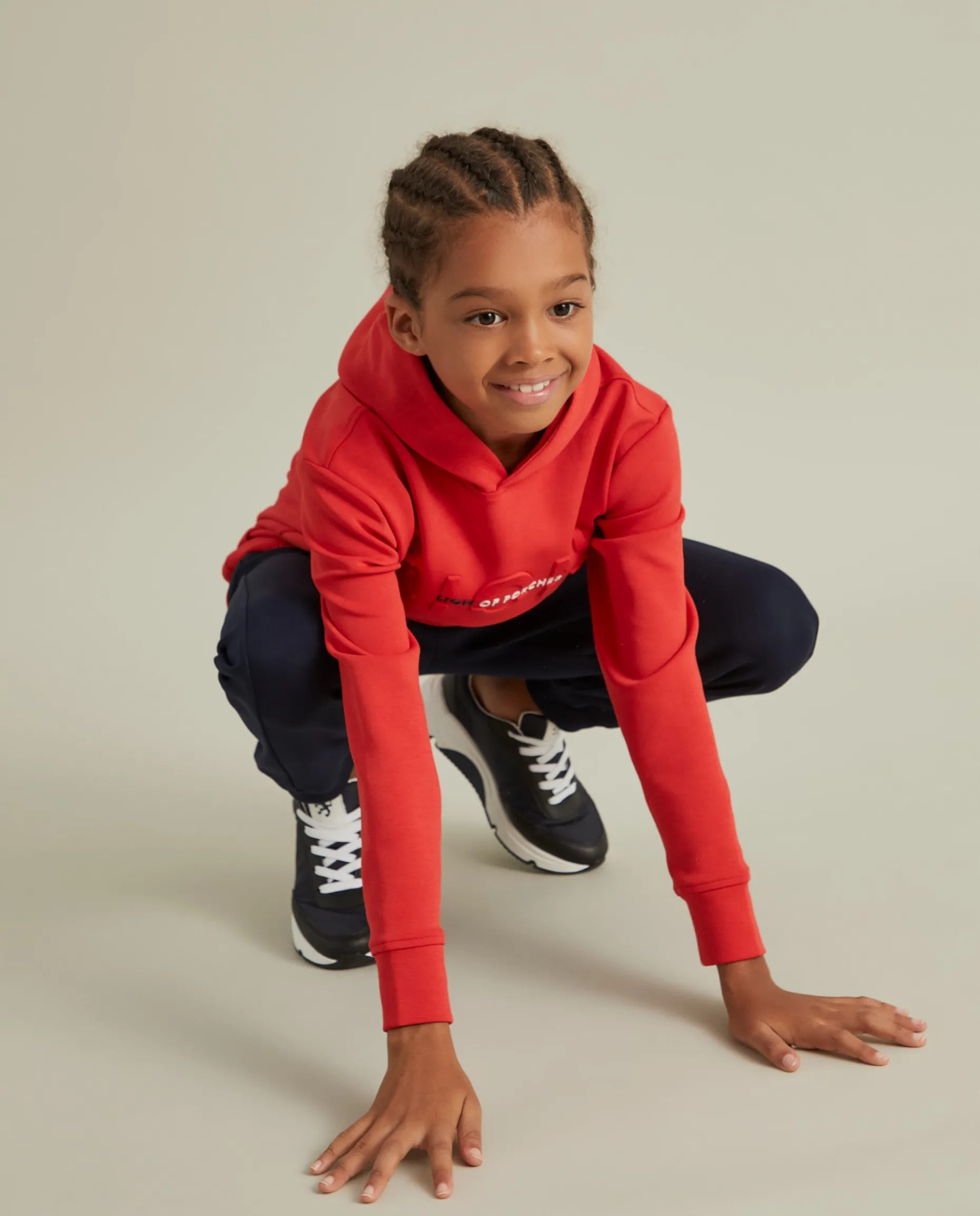 Sweater de manga comprida, cor lisa, com capuz. Pormenor de logotipo em relevo e estampado no peito. Bolso canguru.