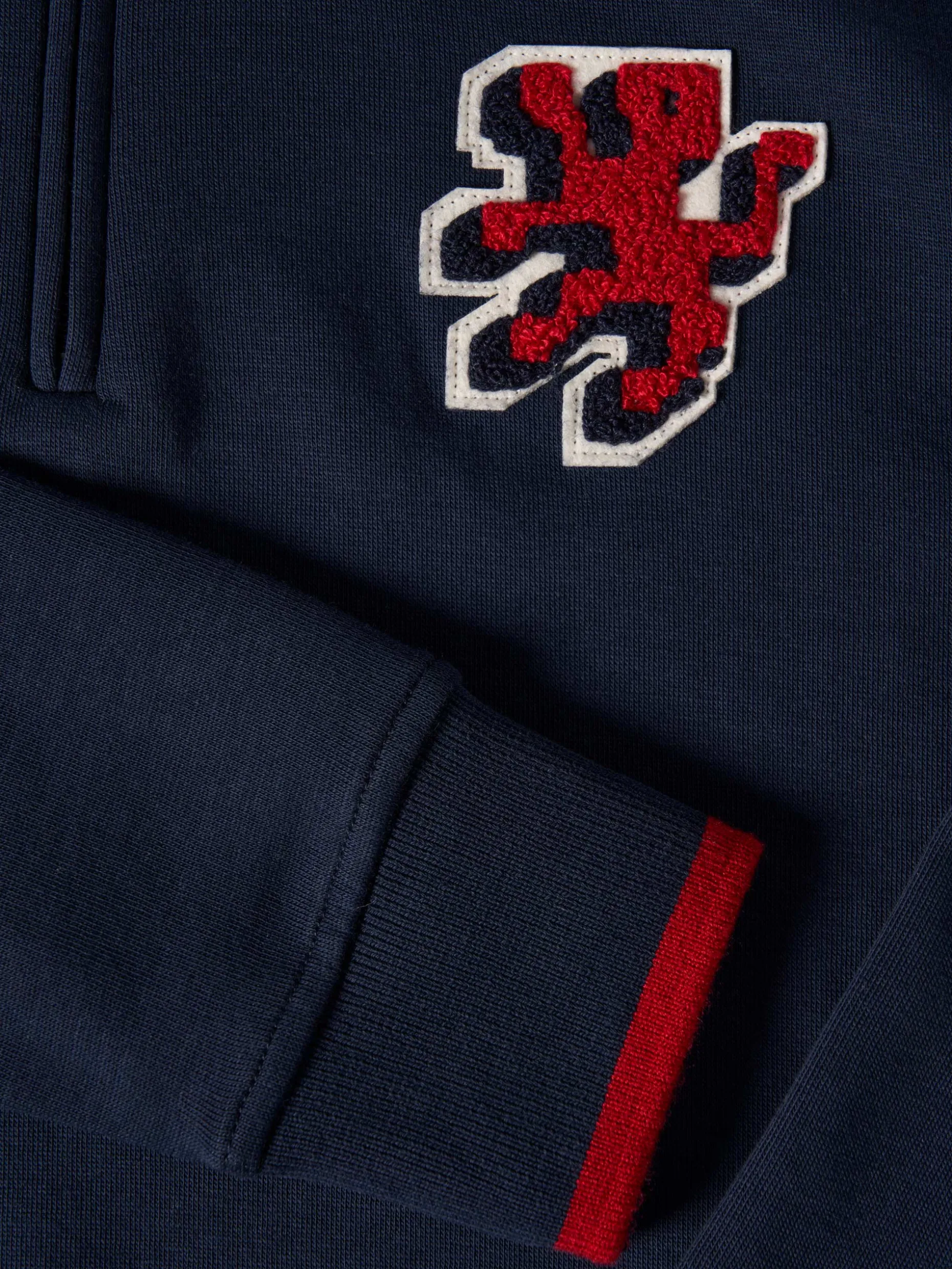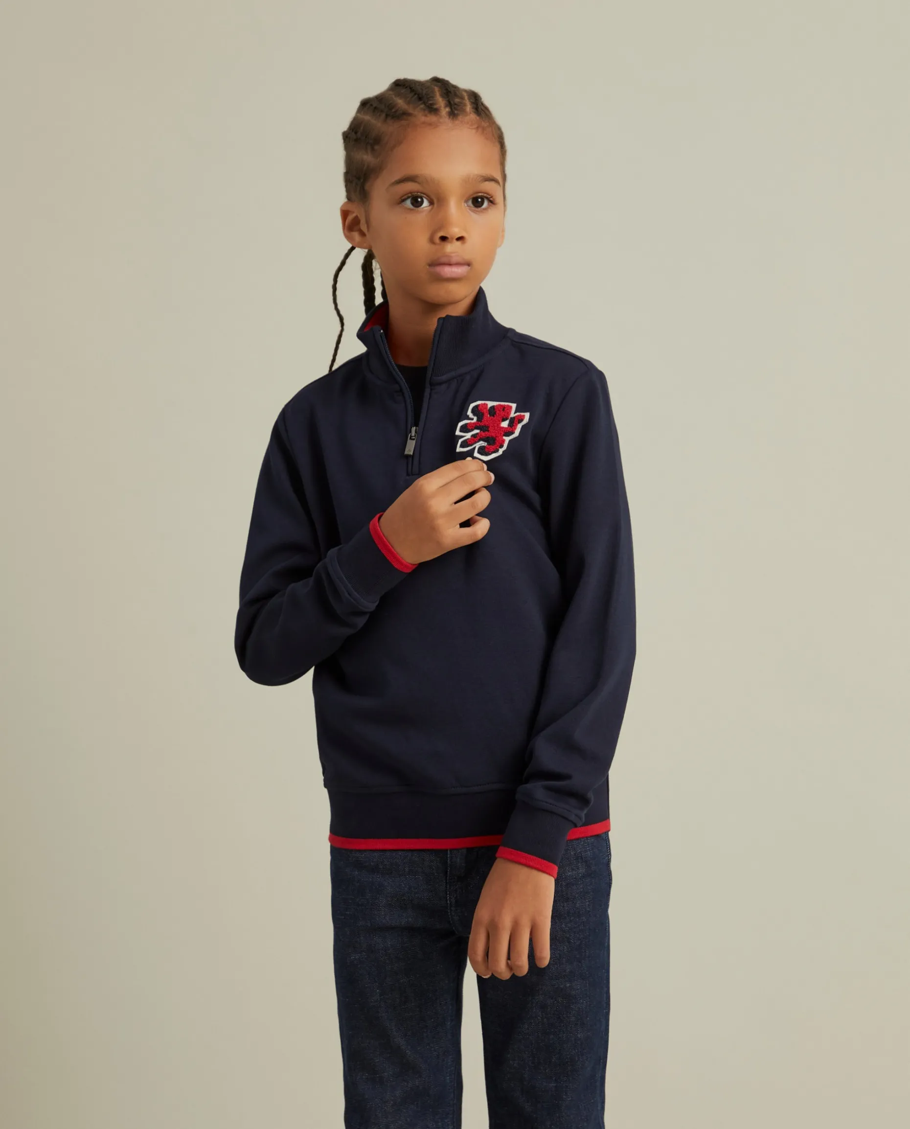 Um essencial no guarda-roupa dos miúdos é esta sweater de manga comprida, de gola alta, com meio fecho. De cor lisa, com leão bordado no peito. Pormenor de risca na cintura e punhos em contraste de cor. Confecionada em algodão para maior conforto e suavidade.
