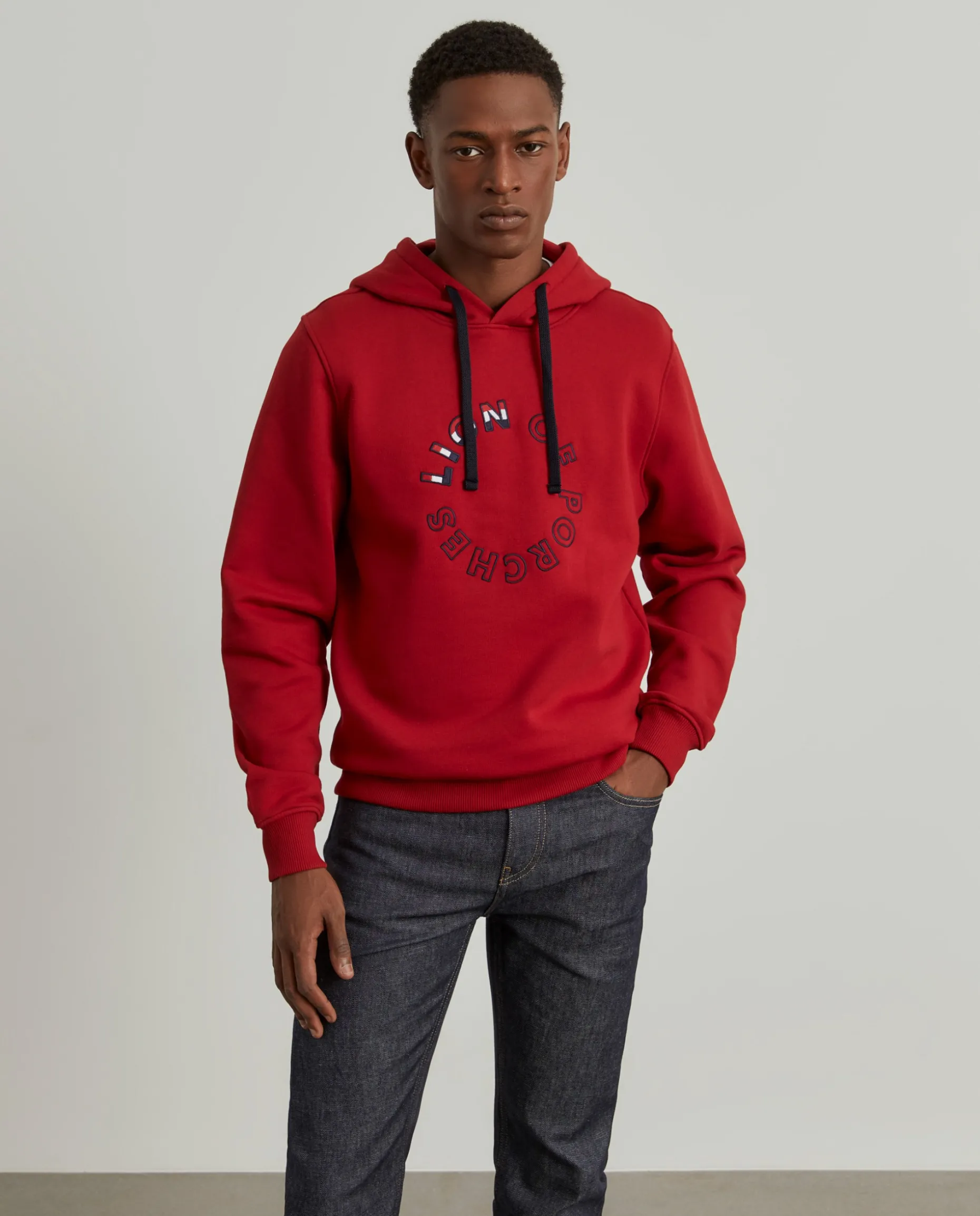 Um essencial num guarda-roupa descontraído e confortável, esta sweater de manga comprida tem capuz ajustável e bordado Lion of Porches na frente. A base e punhos são canelados. É confecionada, na totalidade, em algodão.