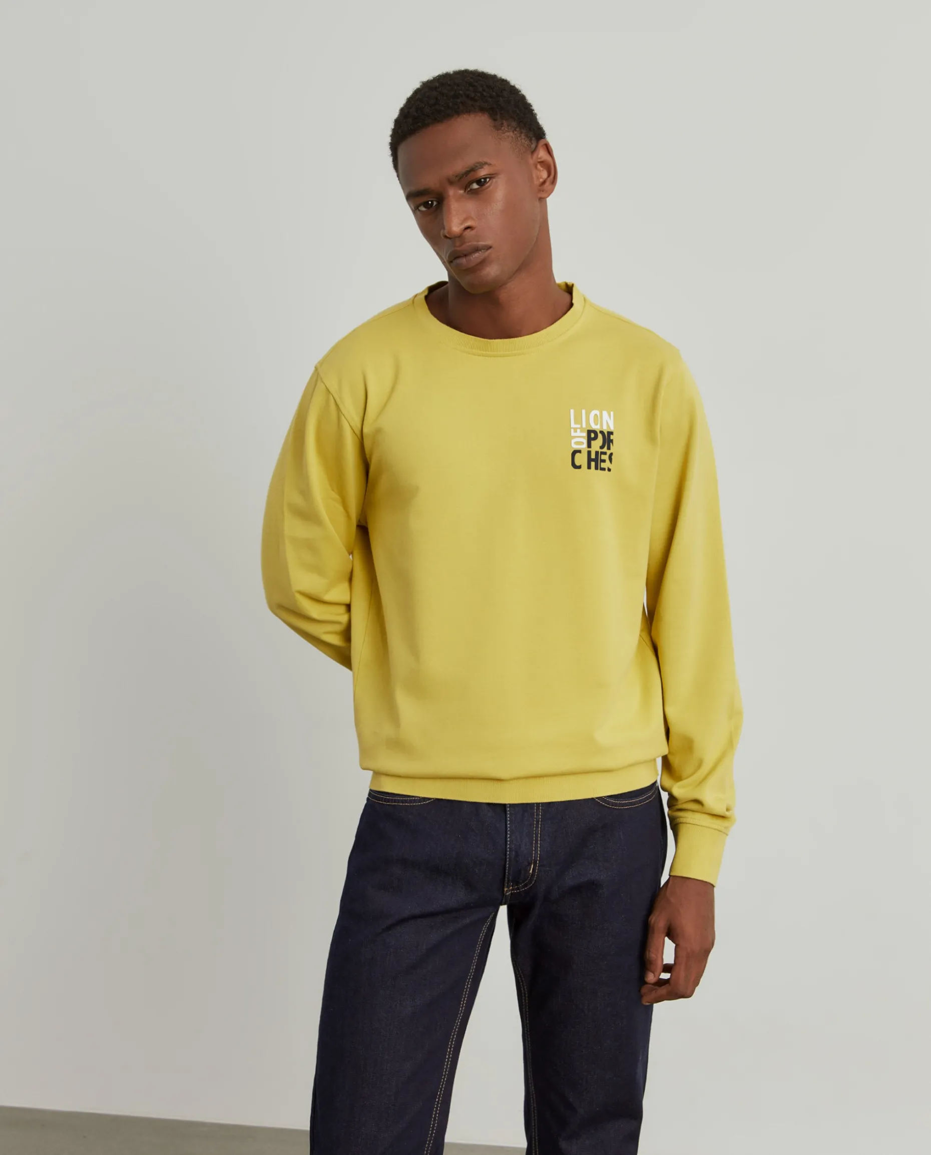 Sweater de manga comprida com gola redonda. De cor lisa, à exceção do logotipo Lion of Porches em contraste de cor. É confecionada, na totalidade, em algodão para maior conforto e suavidade.