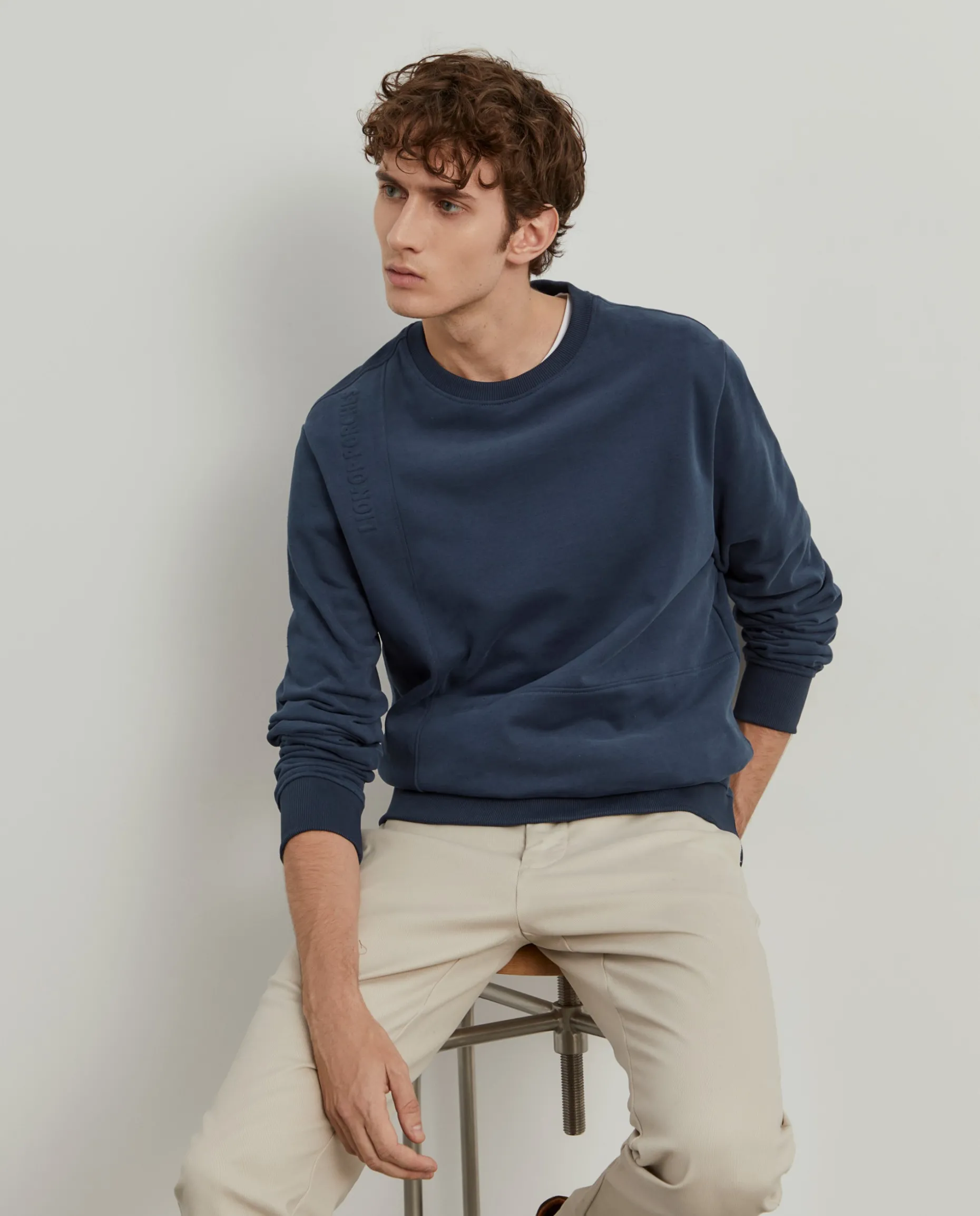Obtenha um look confortável e descontraído com esta sweater de manga comprida. Com pormenor de costuras e Lion of Porches na frente, um pouco abaixo do ombro. Gola, base e punhos em malha canelada.
