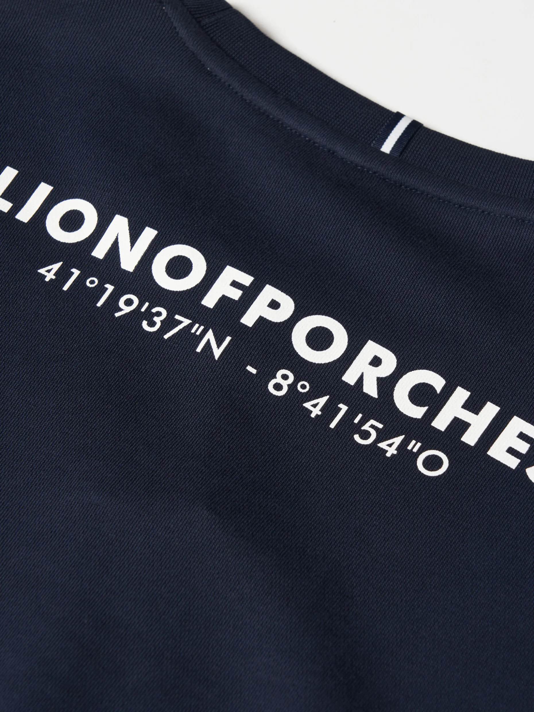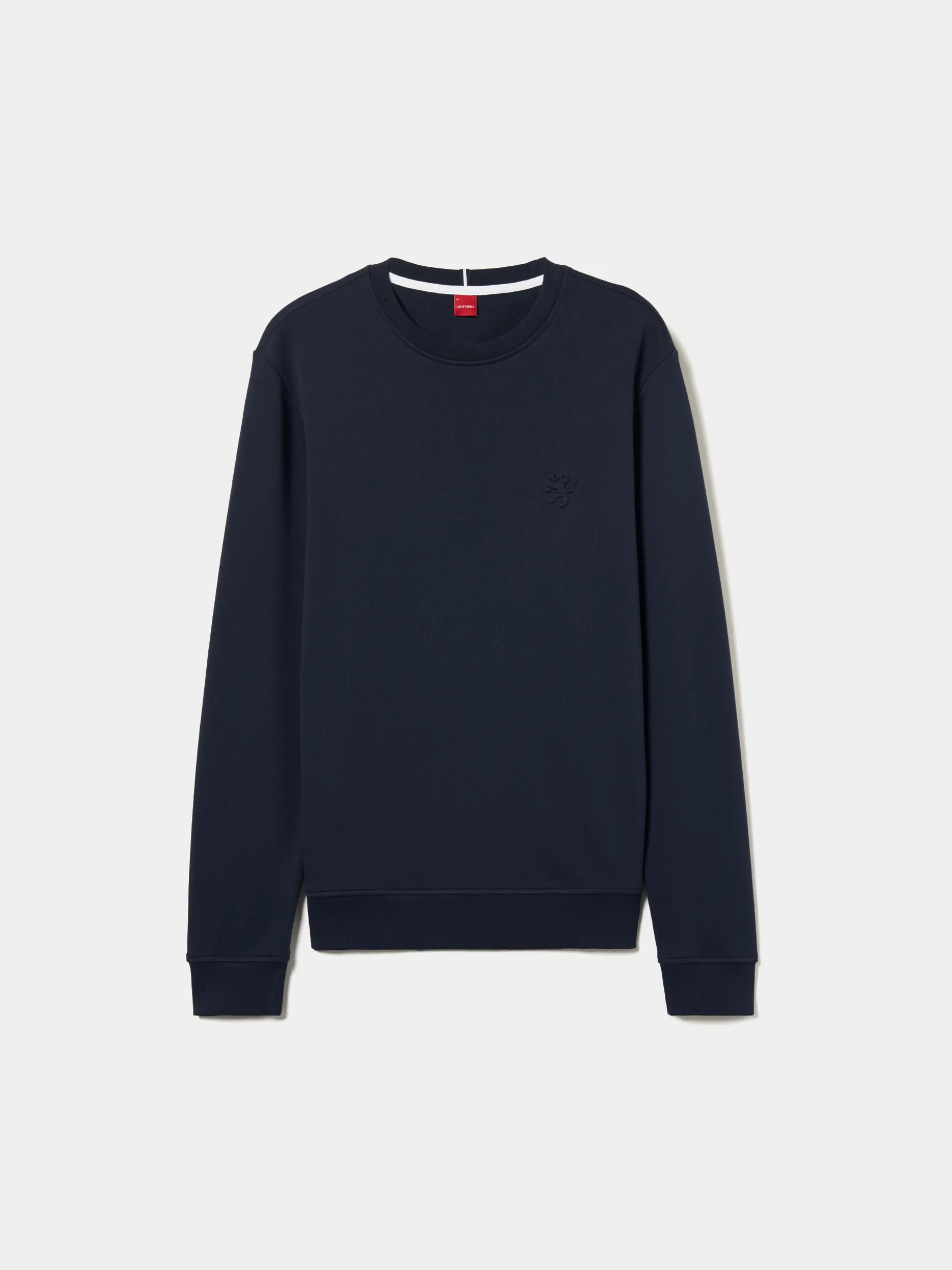 Sweater básica, de manga comprida, com decote redondo. Pormenor de logotipo em contraste nas costas. Confecionada em algodão para maior conforto.