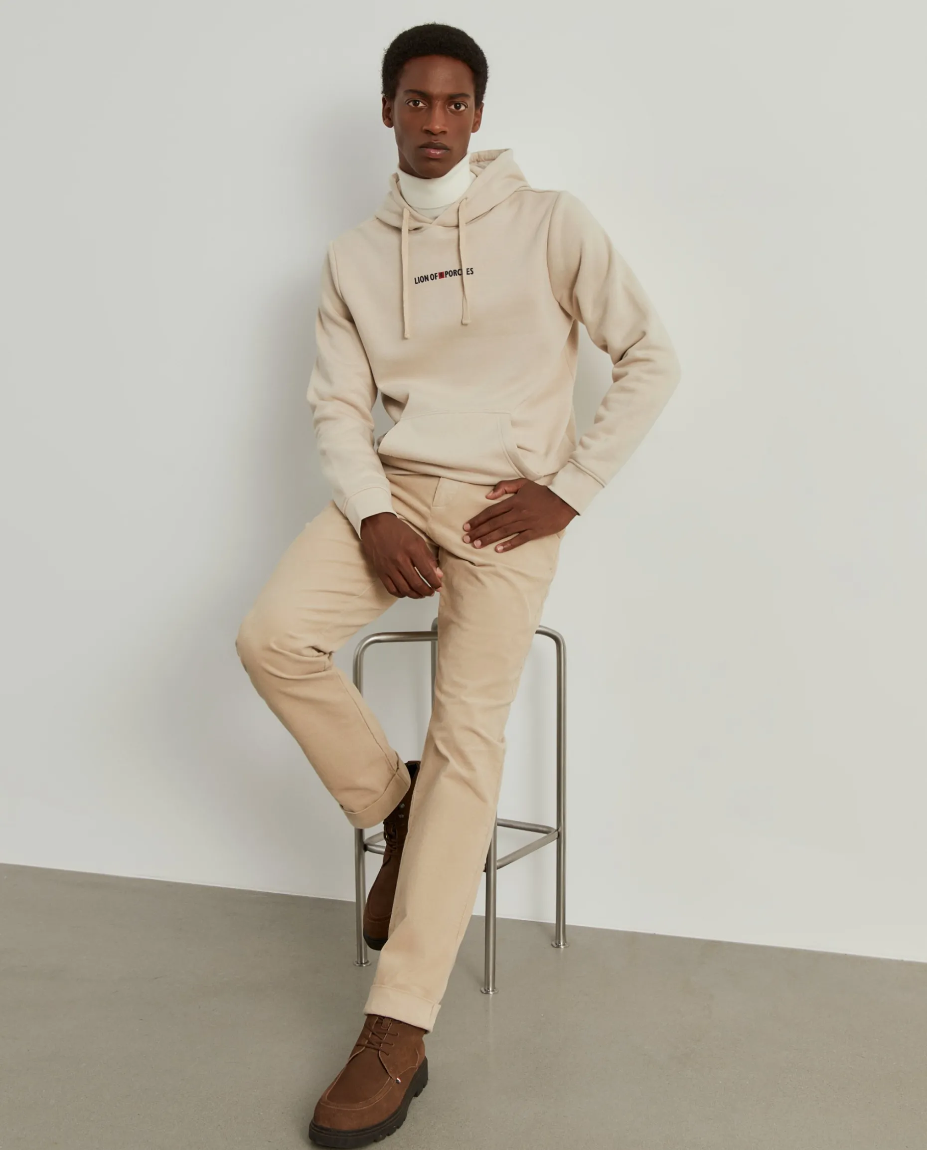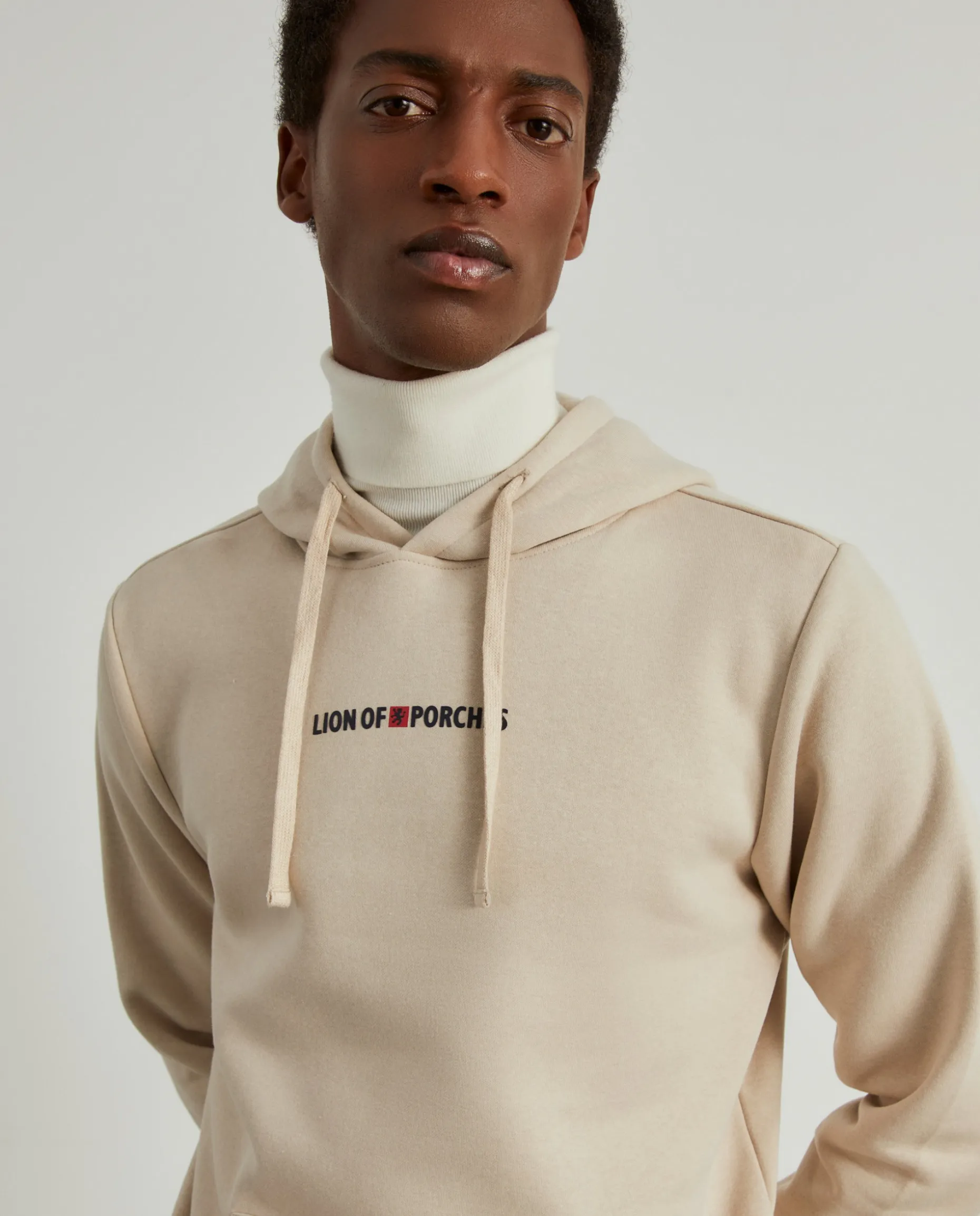 Sweater de manga comprida com capuz para um look casual e confortável. De cor lisa, com estampado Lion of Porches em contraste no peito. O capuz é ajustável. Bolso canguru.